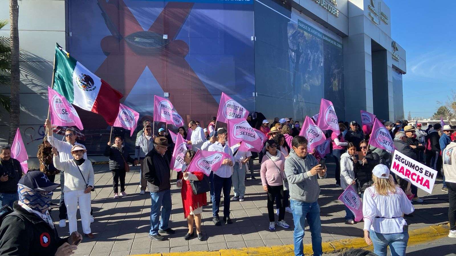 Hombres, mujeres y niños se presentaron para participar en la marcha donde se les entregaron banderas en color rosa que decían, #NuestraDemocraciaNoSeToca y banderas de México.