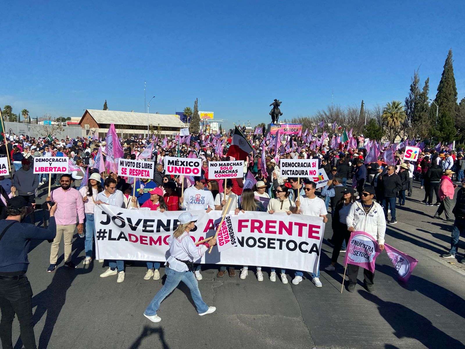 Alrededor de mil personas se reunieron en la glorieta de Pancho Villa donde marcharán por la avenida Universidad hasta la Plaza del Ángel en el centro de la ciudad, indicaron que las agrupaciones de jóvenes encabezarán esta marcha pacífica.