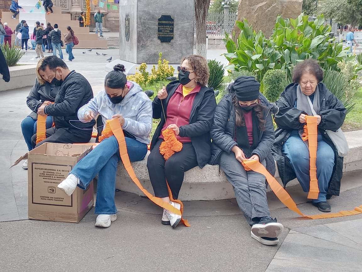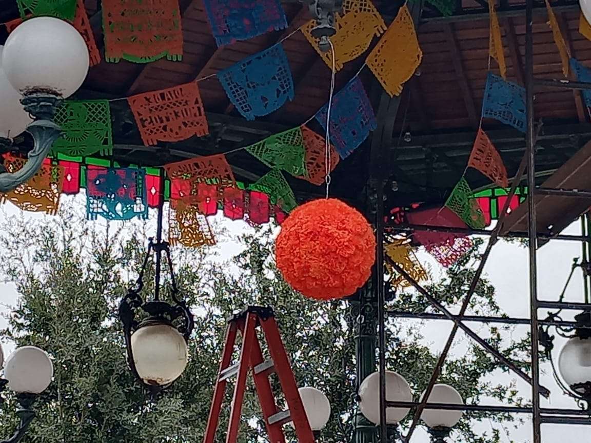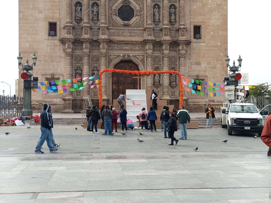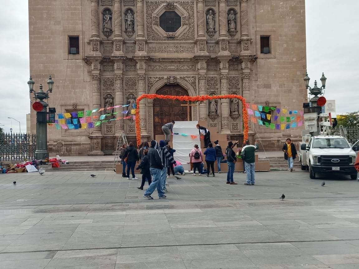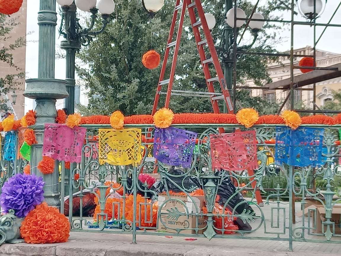 El Kiosco ubicado en el centro de la plaza, fue decorado con papel picado en forma de flor de cempasuchil y flores de colores, mientras en la entrada de la Catedral se instalaron un altar de muertos .
