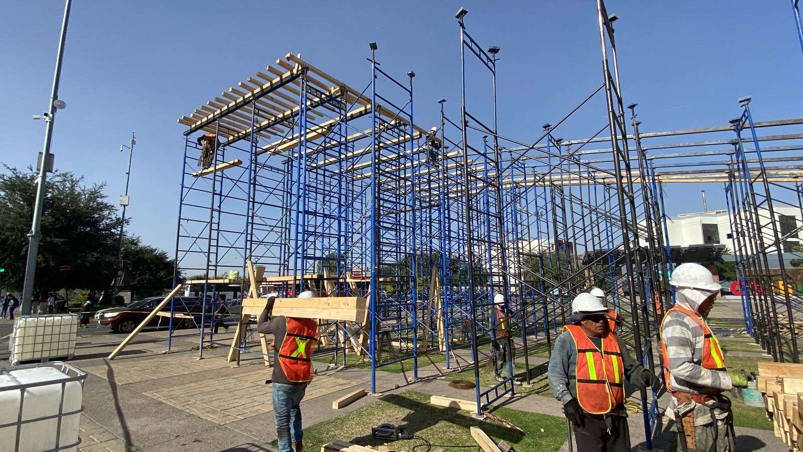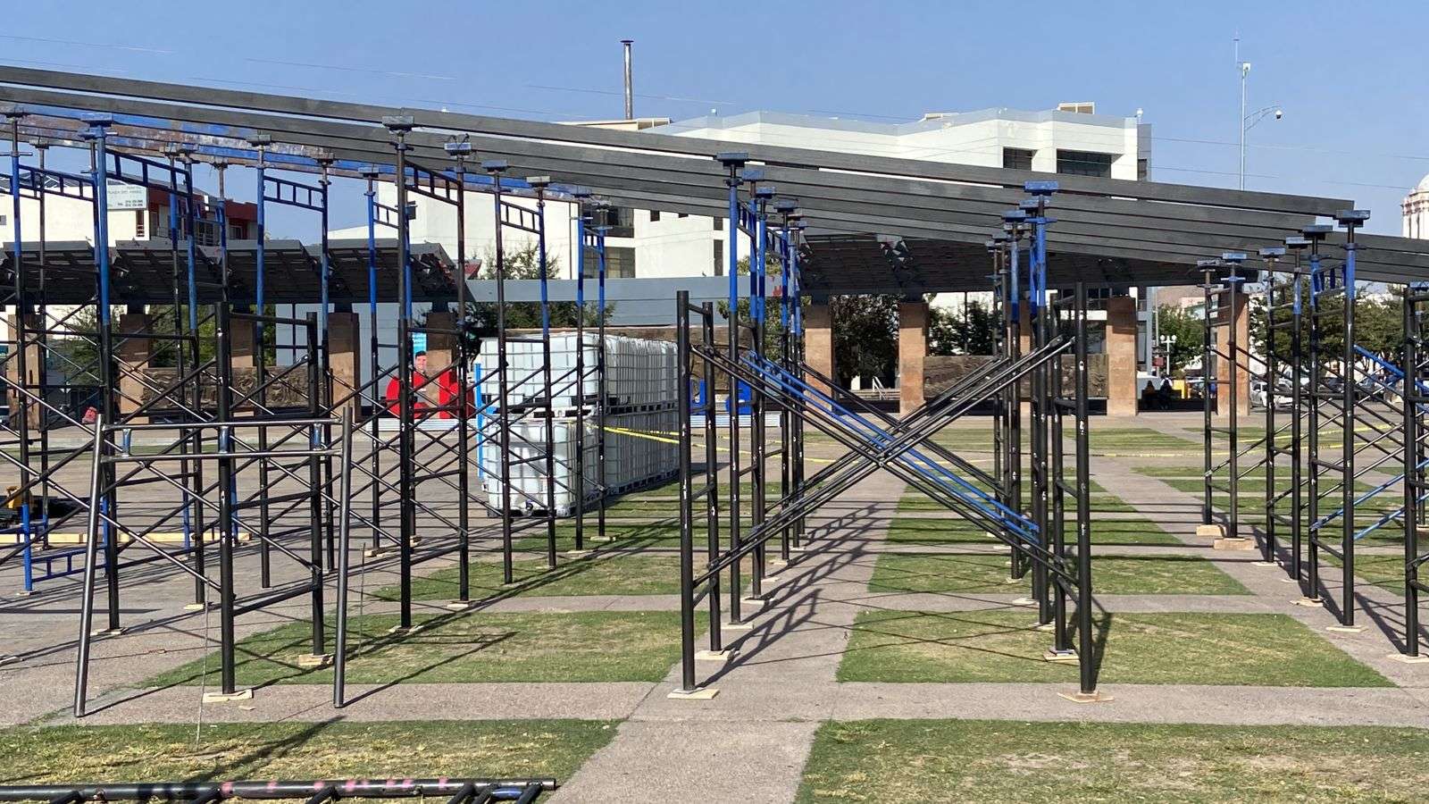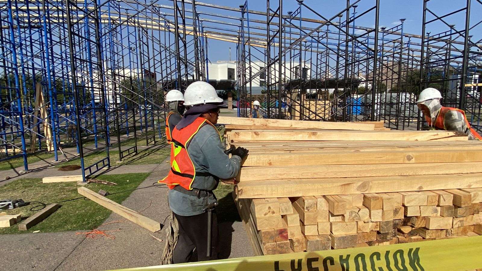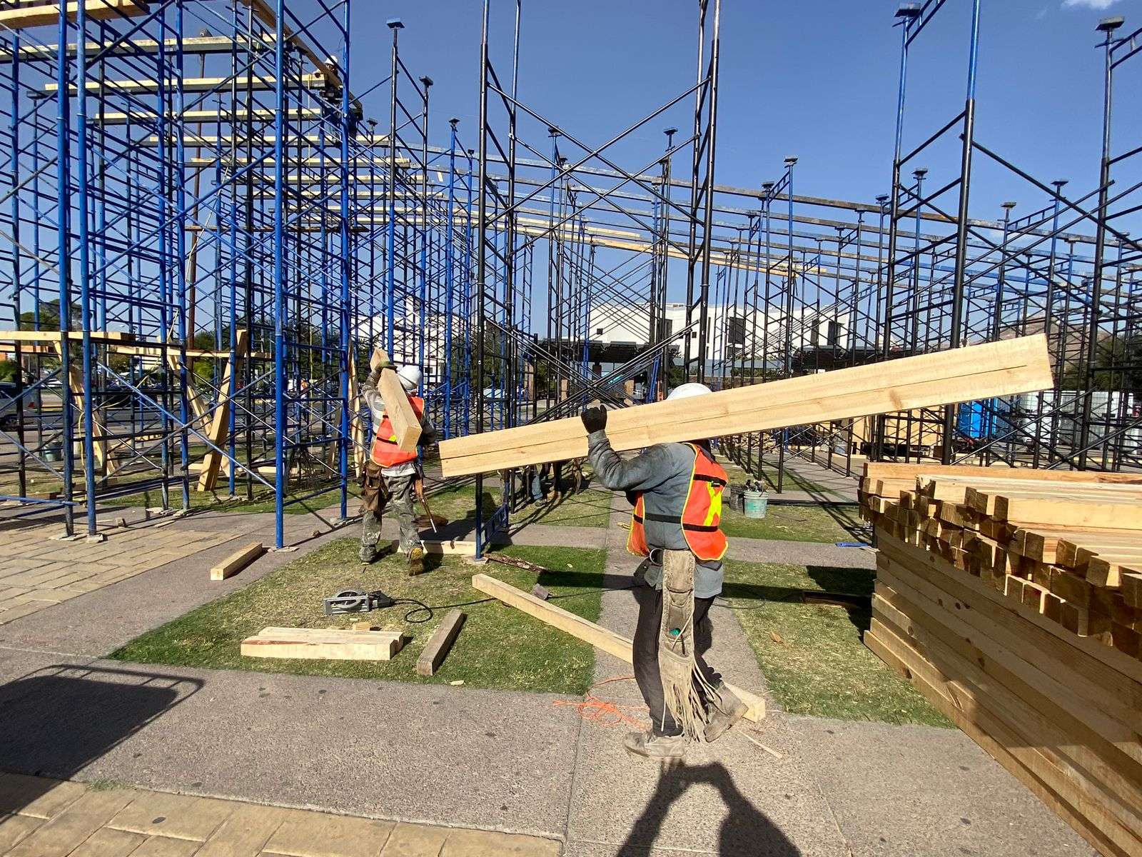 Chihuahua.- Una cuadrilla de trabajadores se encuentra instalando una estructura de madera y acero para lo que será un tobogán congelado durante las fiestas decembrinas.