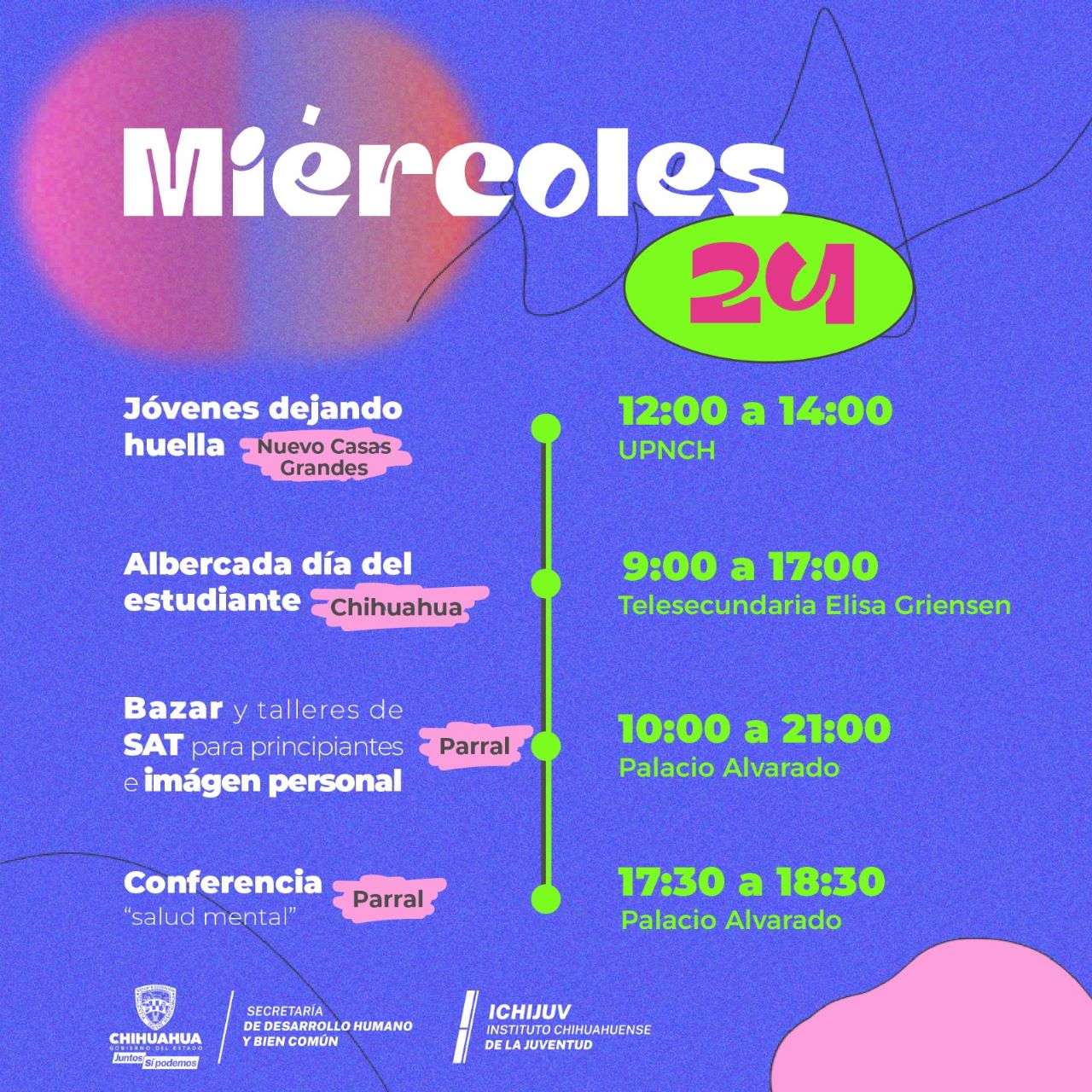 Chihuahua.- El Instituto Chihuahuense de la Juventud (Ichijuv), dio a conocer el programa de actividades programadas para celebrar el día de las y los estudiantes en distintos municipios del estado, durante la semana del 22 al 27 de mayo.