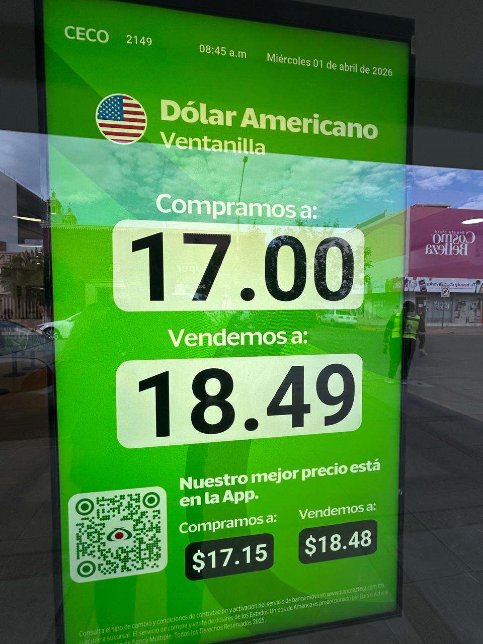Por otro lado, a unos metros de distancia sobre la misma calle Aldama, la institución financiera Banco Azteca reportó cifras distintas que ampliaron el margen entre la compra y la venta. En esta sucursal, el billete verde se cotizó en los $17.00 pesos cerrados para la adquisición por parte del banco, mientras que para la venta al público el precio alcanzó los $18.49 pesos.