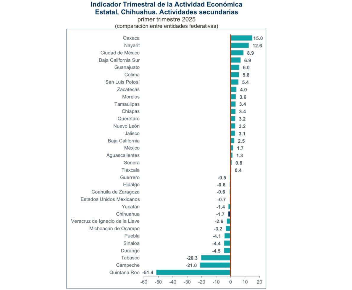 Finalmente, en el primer trimestre de 2025, debido a la caída de 0.5 % en el total de la actividad económica, Chihuahua se ubicó en el lugar 28 a nivel nacional, con -0.02 puntos porcentuales.