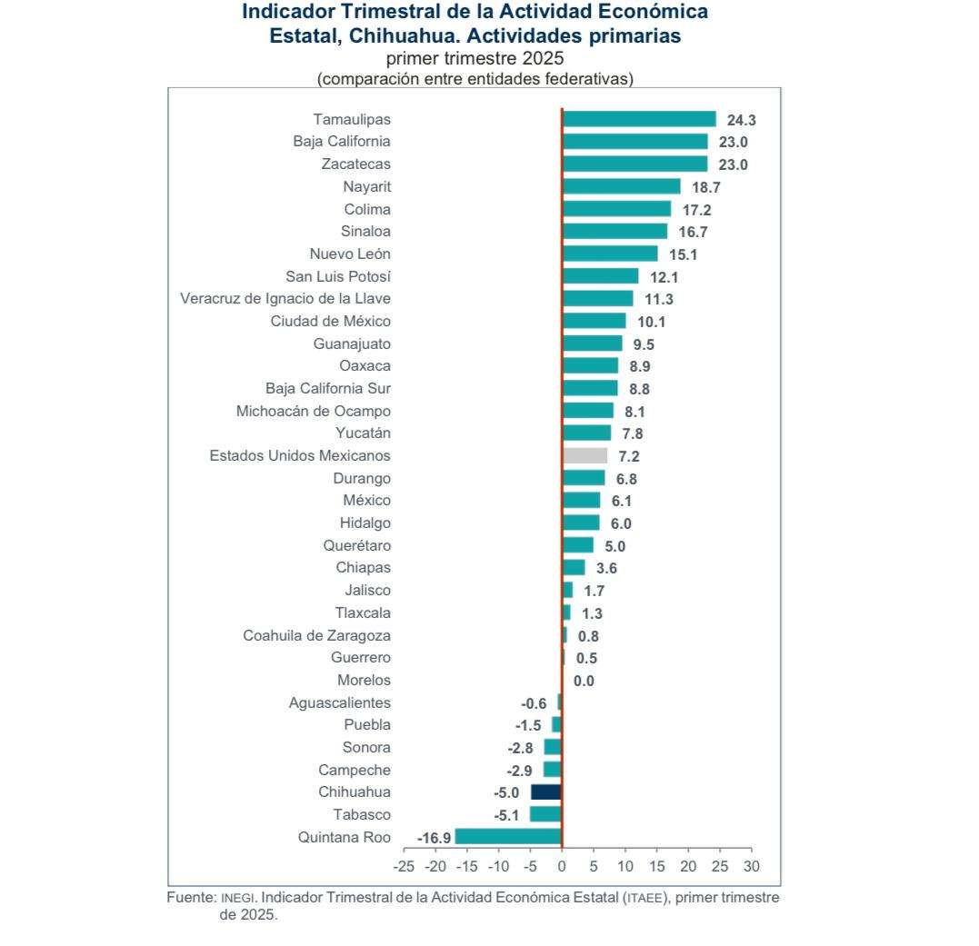 Chihuahua.- El estado de Chihuahua registró un retroceso económico del 0.5 % durante el primer trimestre de 2025, colocándose en el lugar 28 a nivel nacional, de acuerdo con el Indicador Trimestral de la Actividad Económica Estatal (ITAEE) publicado por el INEGI el 29 de julio.