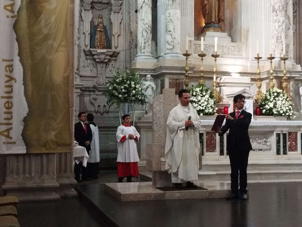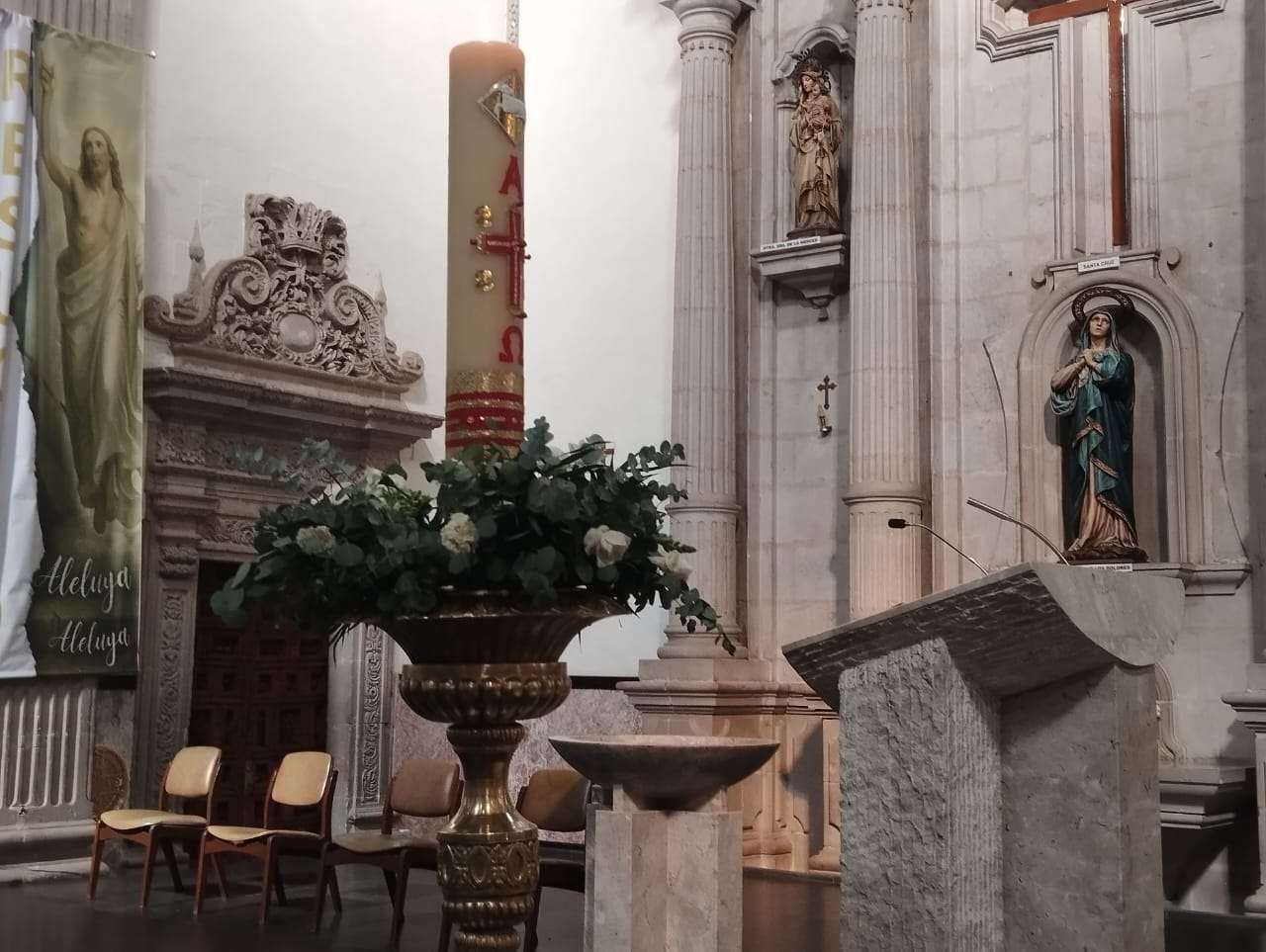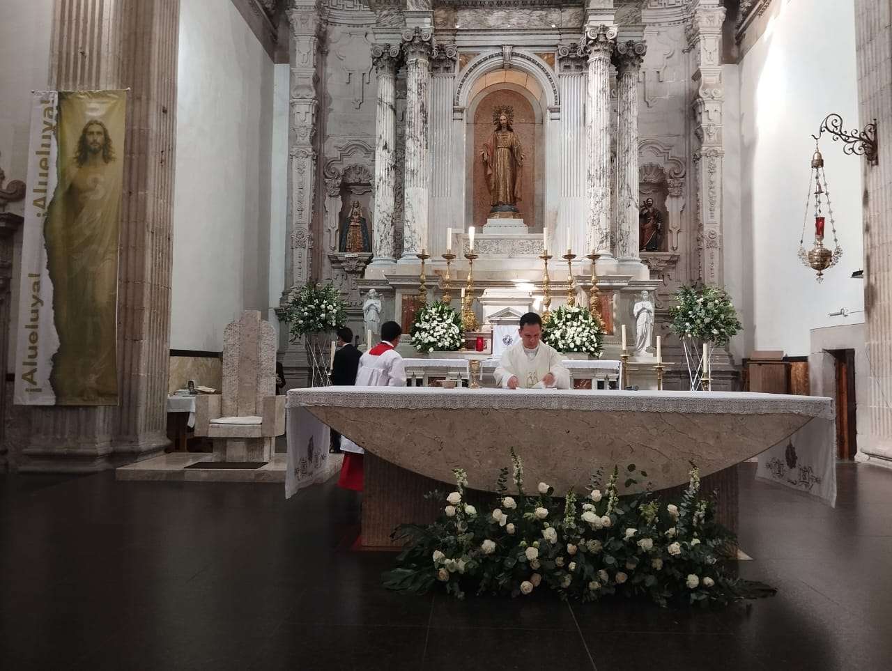 Chihuahua. - Hoy, Domingo de la Divina Misericordia, segundo domingo de misa tras haber celebrado semana santa, el presbítero Jorge Rodríguez Ramírez, quien ha oficiado la misa hoy en la Catedral Metropolitana de Chihuahua, hizo lectura del Evangelio según Juan, donde el discípulo Mateo duda de la resurrección de su maestro tras haber sido crucificado.