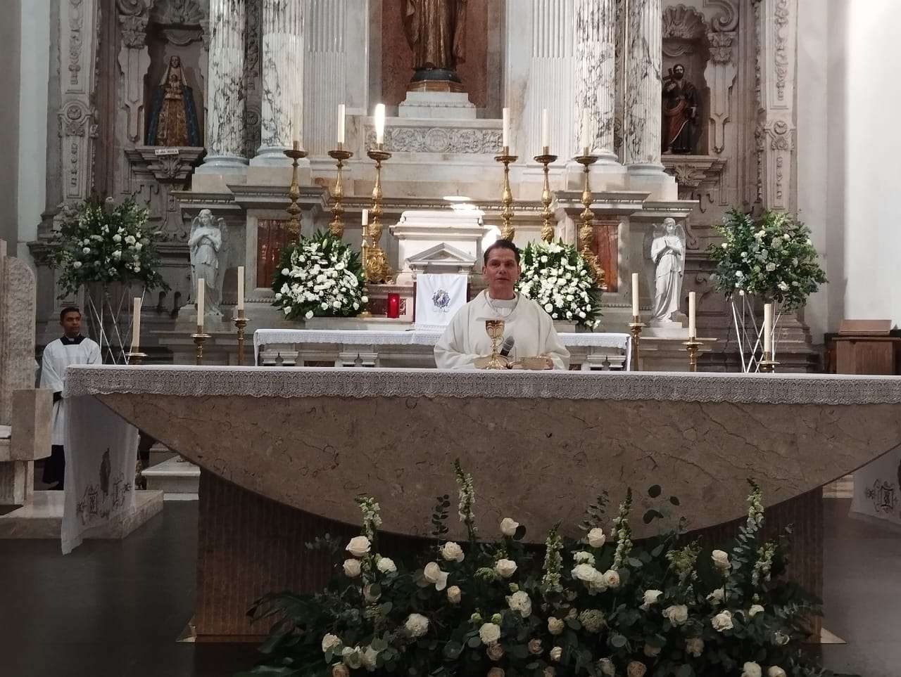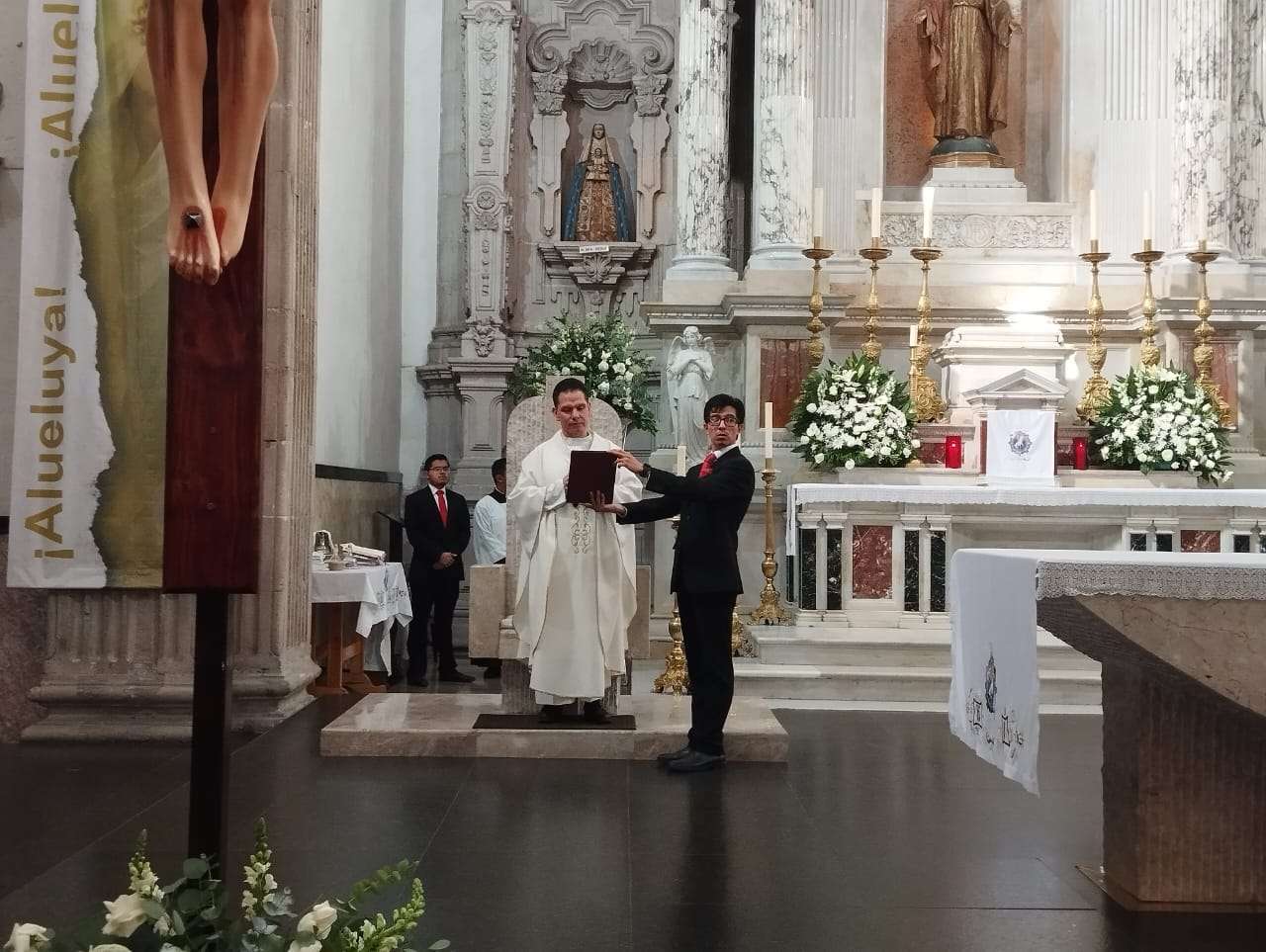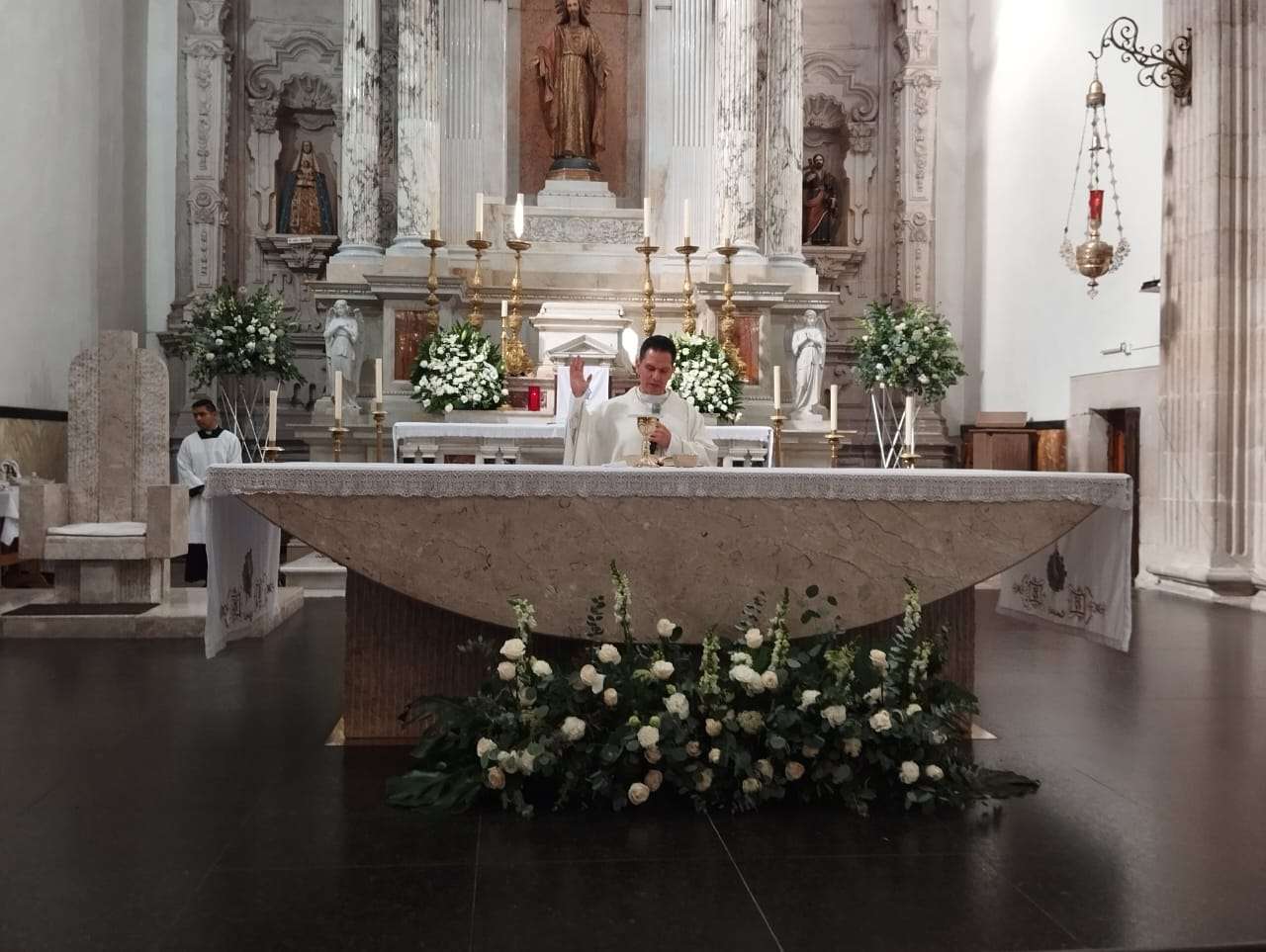 Chihuahua. - Hoy, Domingo de la Divina Misericordia, segundo domingo de misa tras haber celebrado semana santa, el presbítero Jorge Rodríguez Ramírez, quien ha oficiado la misa hoy en la Catedral Metropolitana de Chihuahua, hizo lectura del Evangelio según Juan, donde el discípulo Mateo duda de la resurrección de su maestro tras haber sido crucificado.