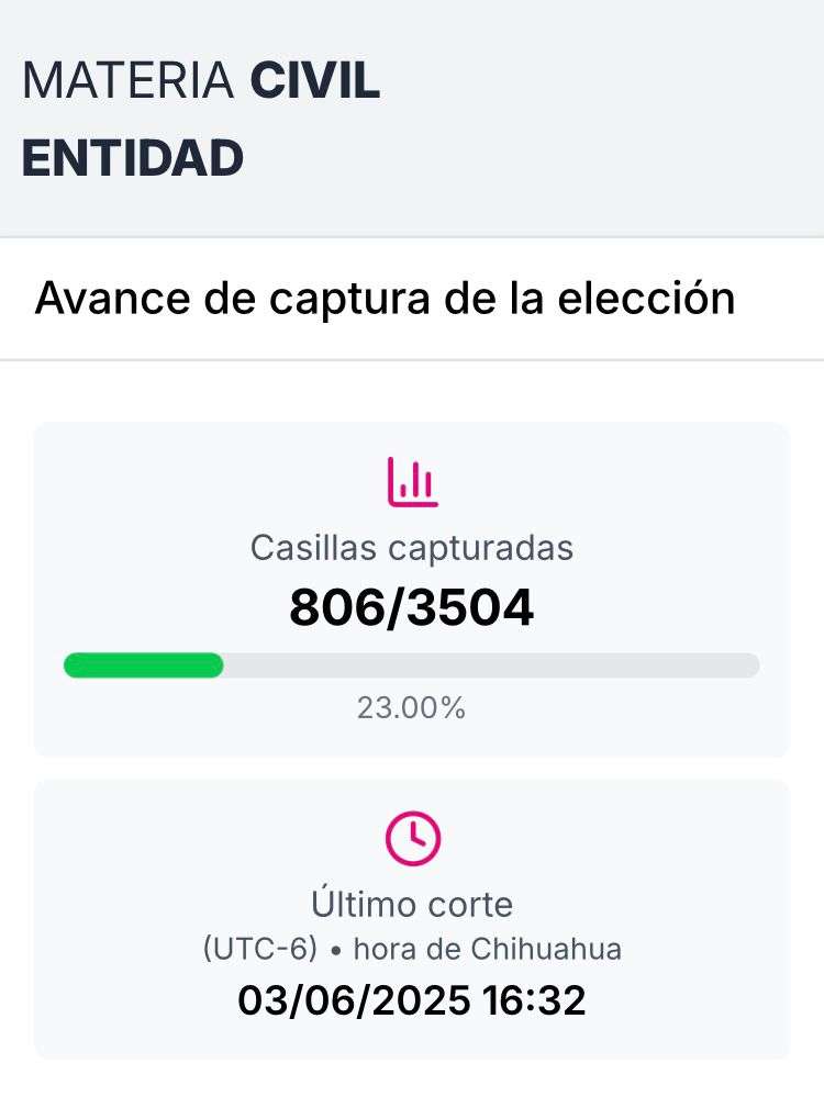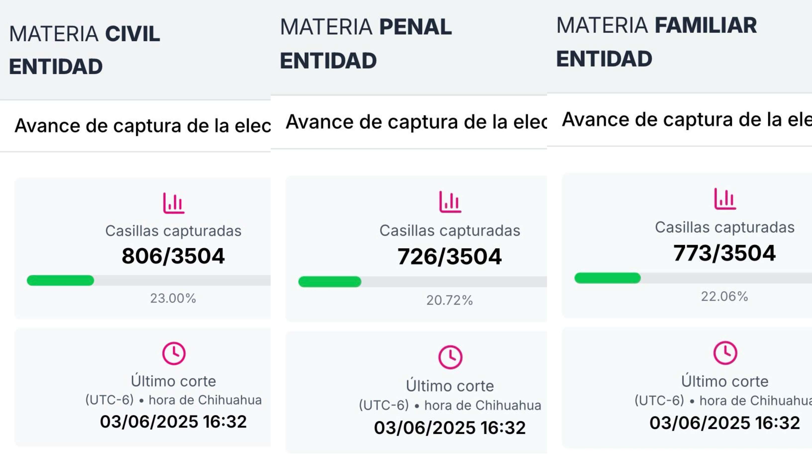 Chihuahua.- En el último corte de los resultados al avance de los cómputos distritales de cada uno de los distritos judiciales de la entidad por parte del IEE, se lleva un total de 806 casillas capturadas de 3 mil 504, equivalente a un avance del 23% en las magistraturas del tribunal superior en materia civil.