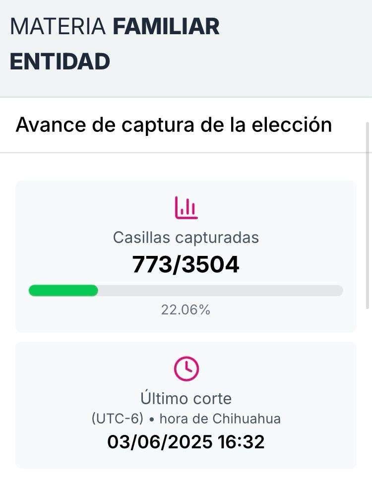 Para Magistraturas del tribunal superior de justicia en materia familiar se han capturado 773 casillas de 3 mil 504 dando un total del 22.06% de casillas computadas.