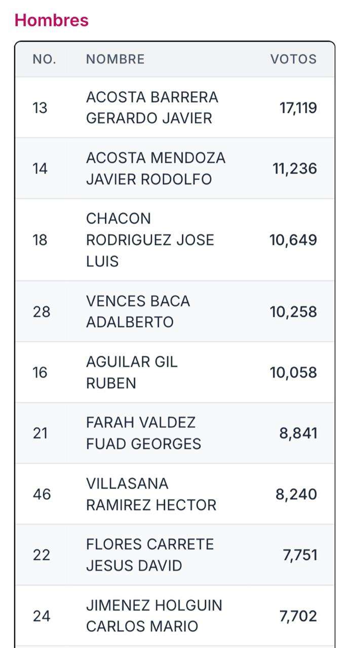 - Acosta Barrera Gerardo Javier con 17 mil 119 votos
