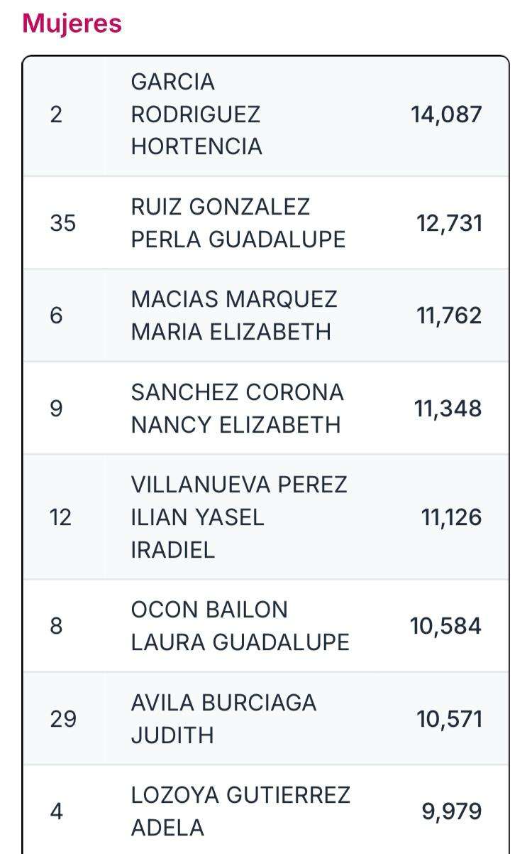 - Macías Márquez María Elizabeth con 11 mil 762 votos