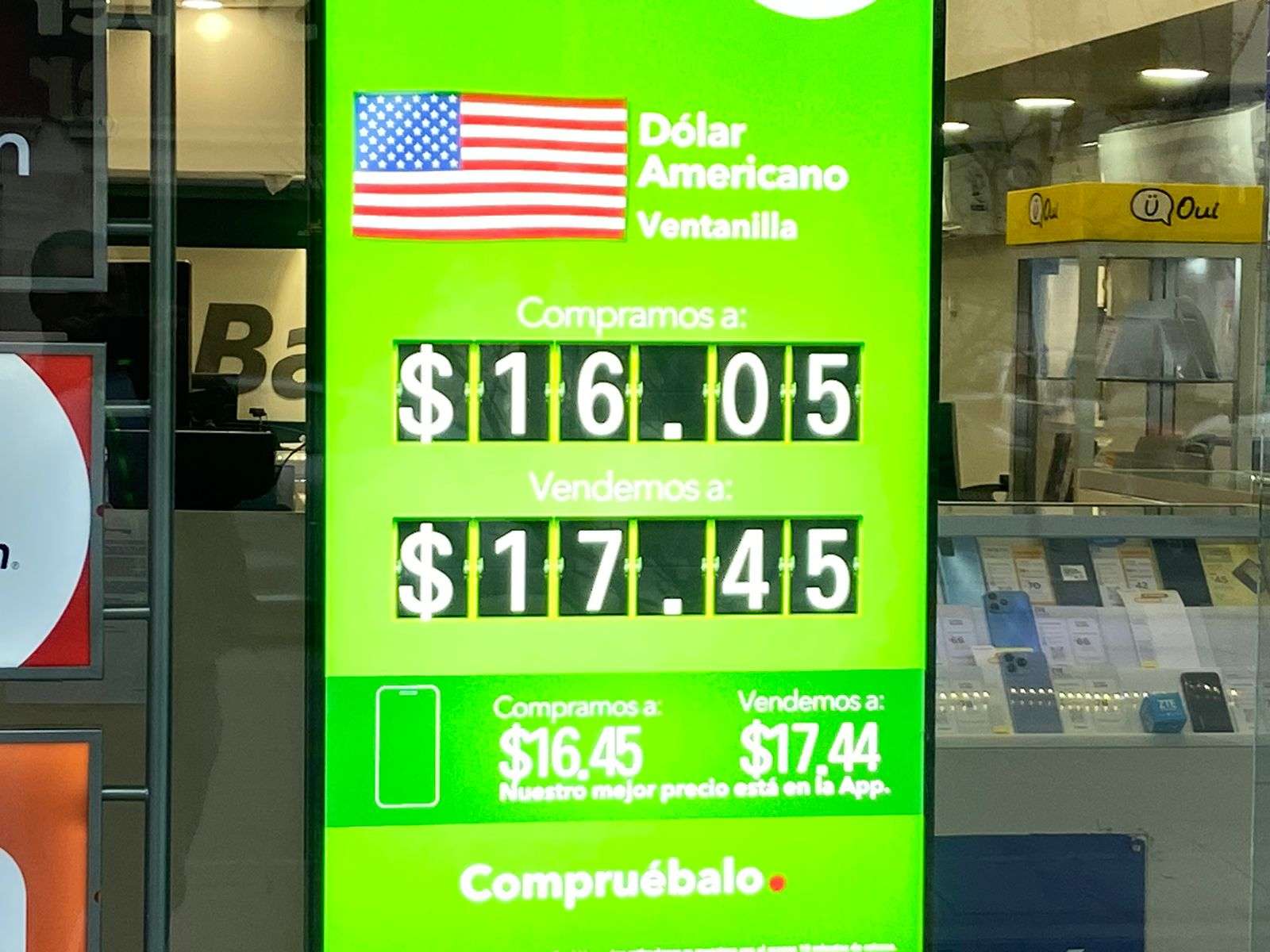 En la casa de cambio Fama el precio en ventanilla del billete verde se ofreció en 17 pesos con 55 centavos a la venta y en 17 pesos a la compra.
