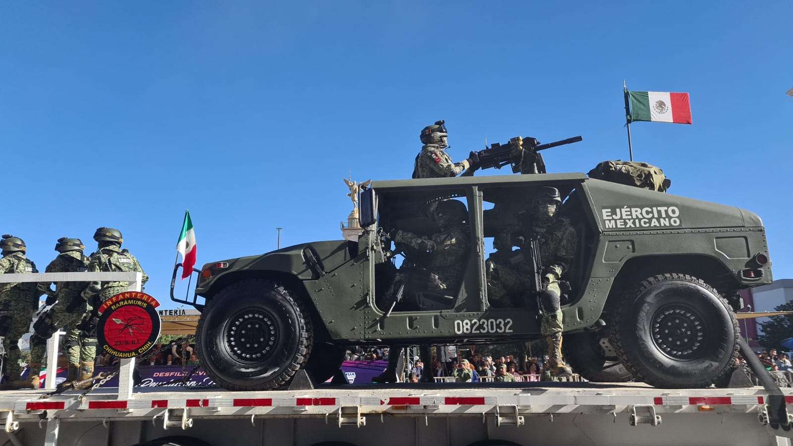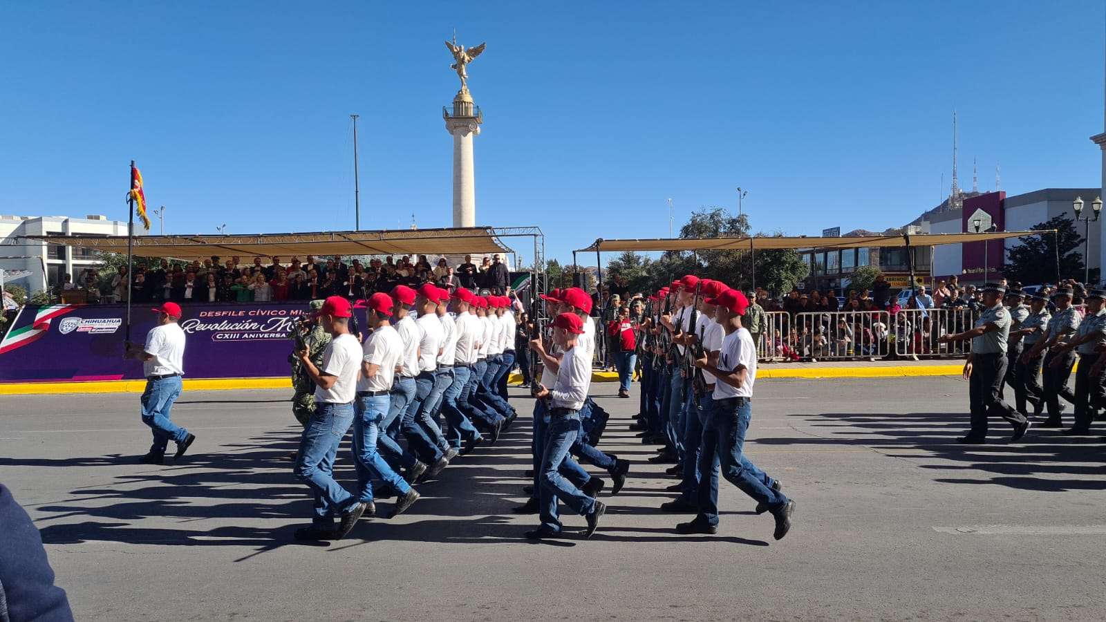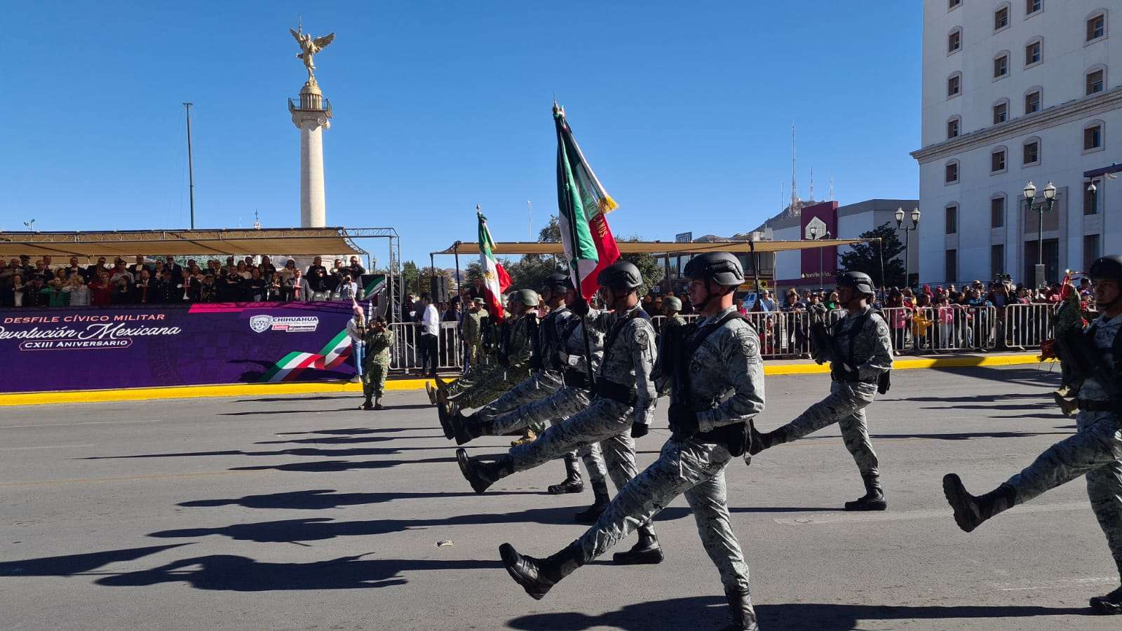 Chihuahua.- En el desfile que conmemora el 113 aniversario de la Revolución Mexicana, destacó la presencia del ejército mexicano y la Guardia Nacional.
