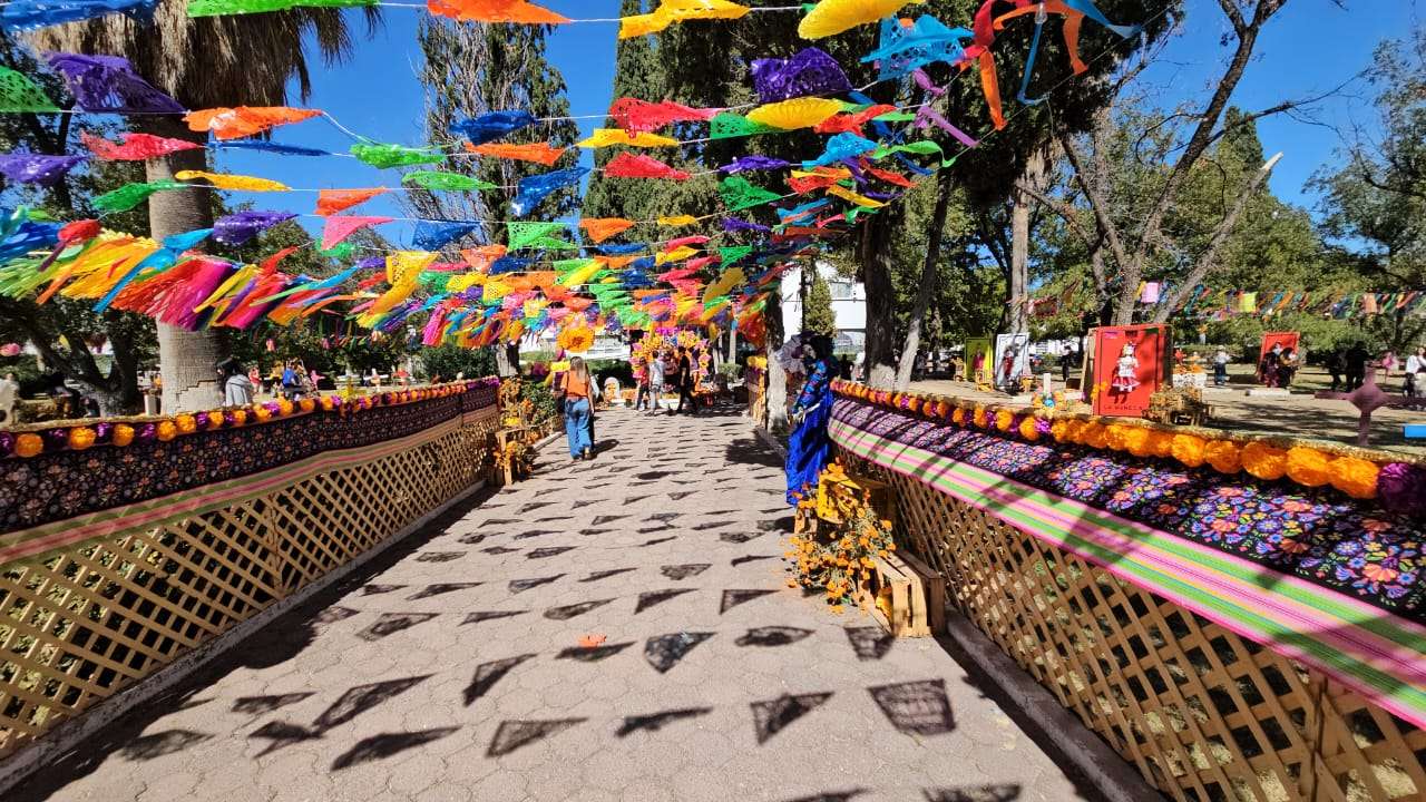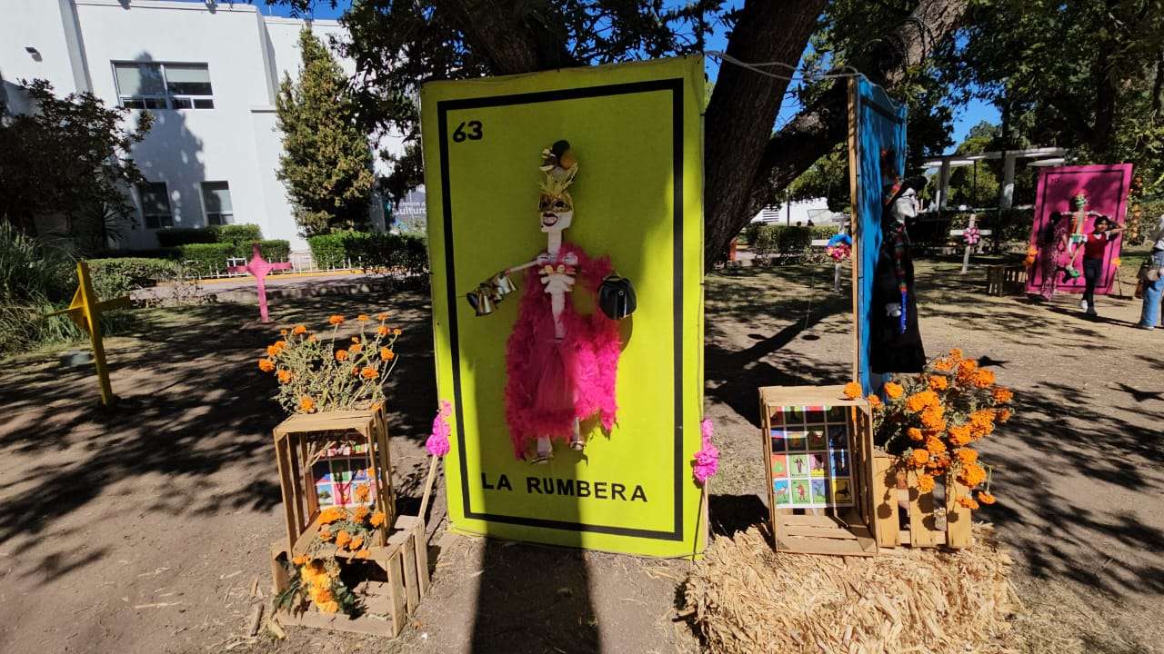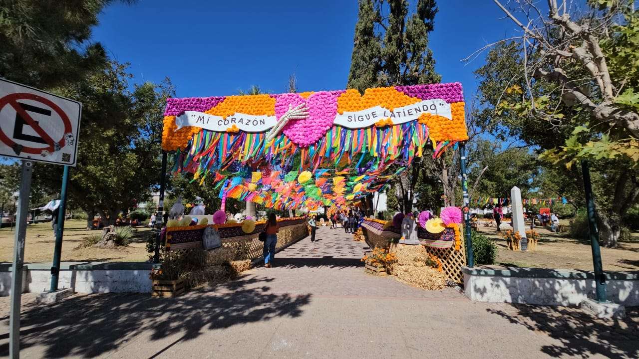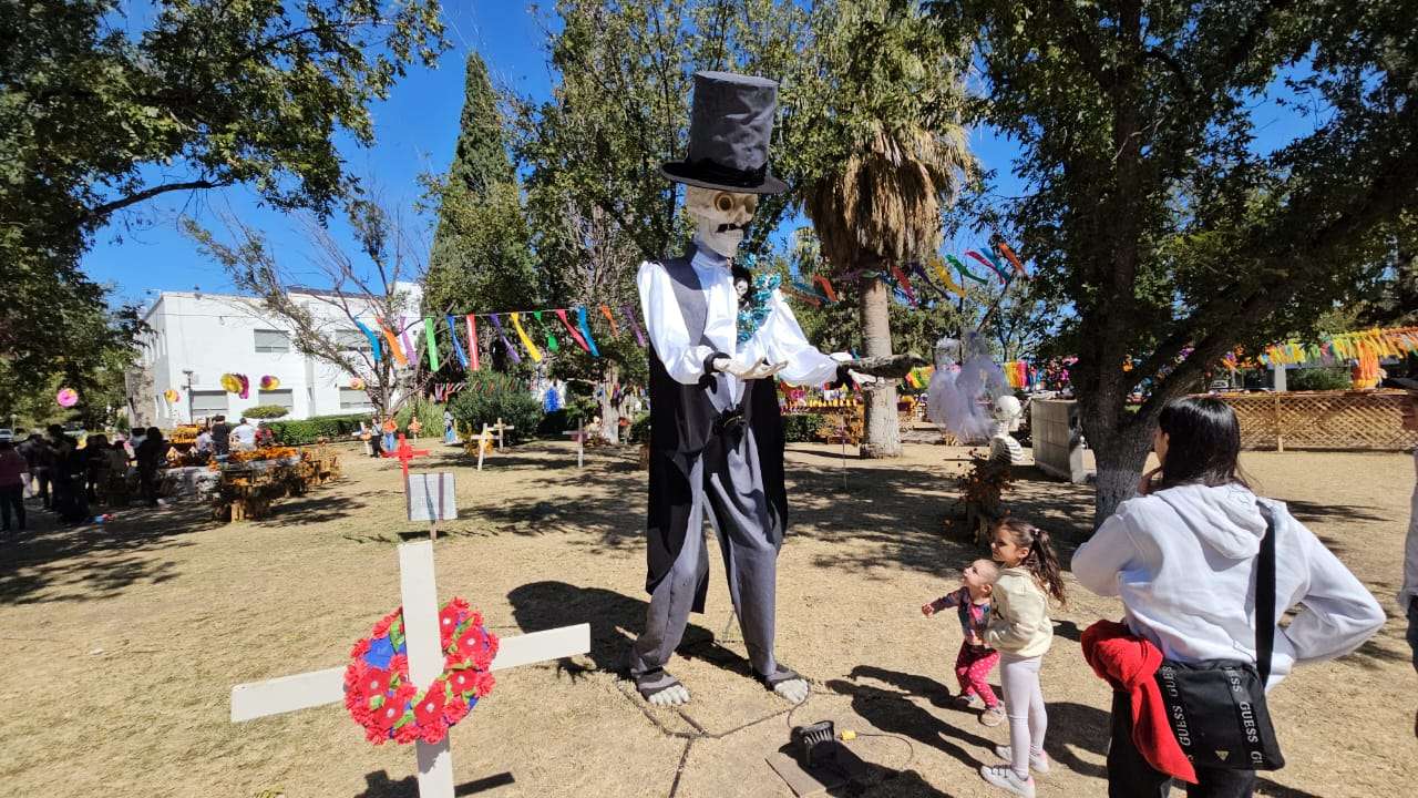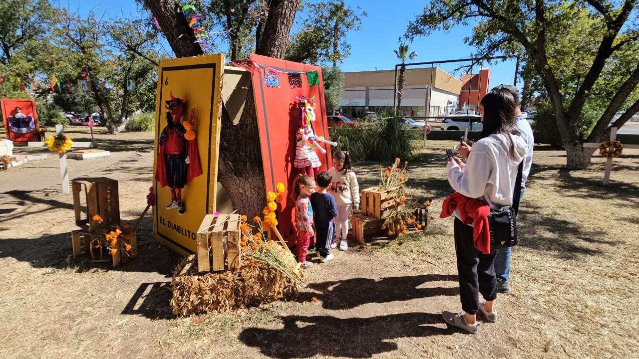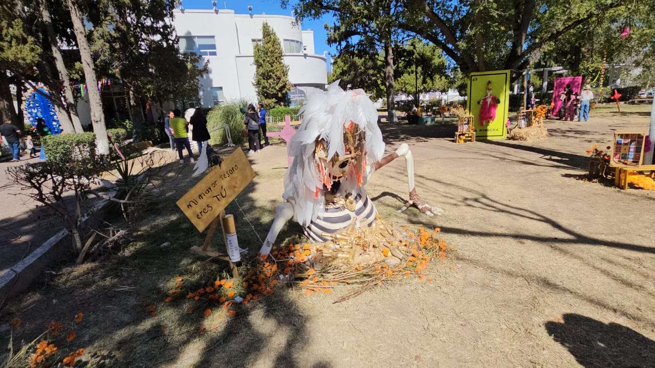 Chihuahua.- Este domingo 2 de noviembre decenas de chihuahuenses disfrutan de la exposición alusiva al Día de Muertos que instalaron en los jardines de la plaza cultural Los Laureles.