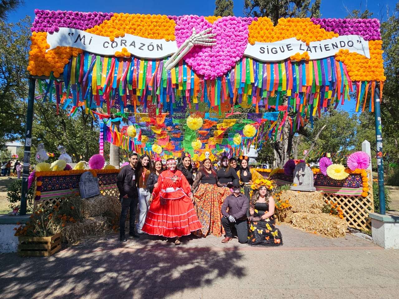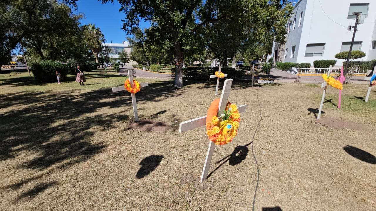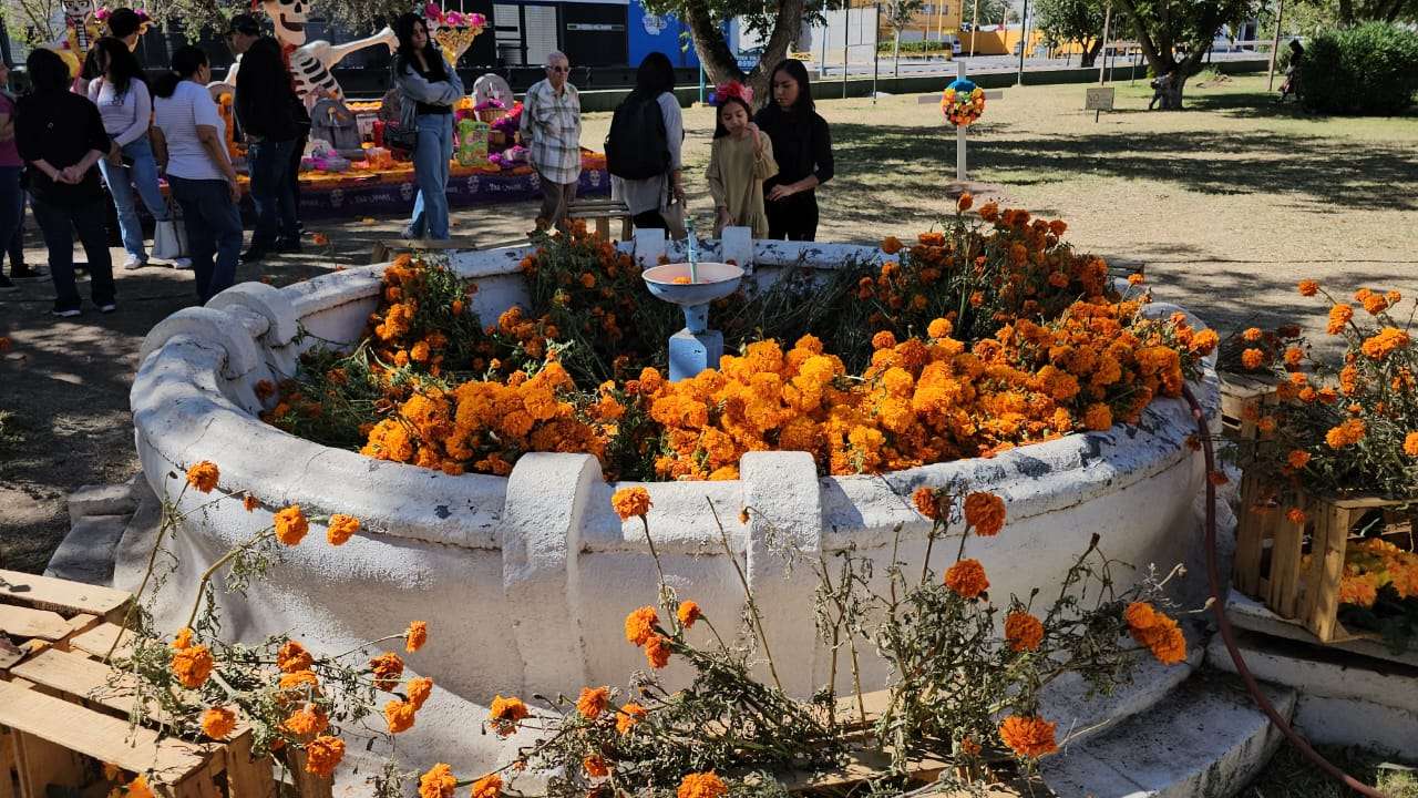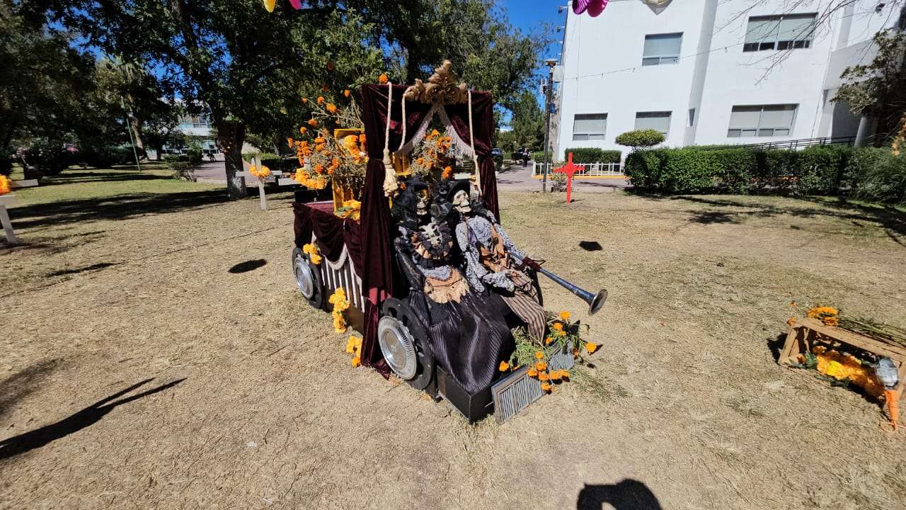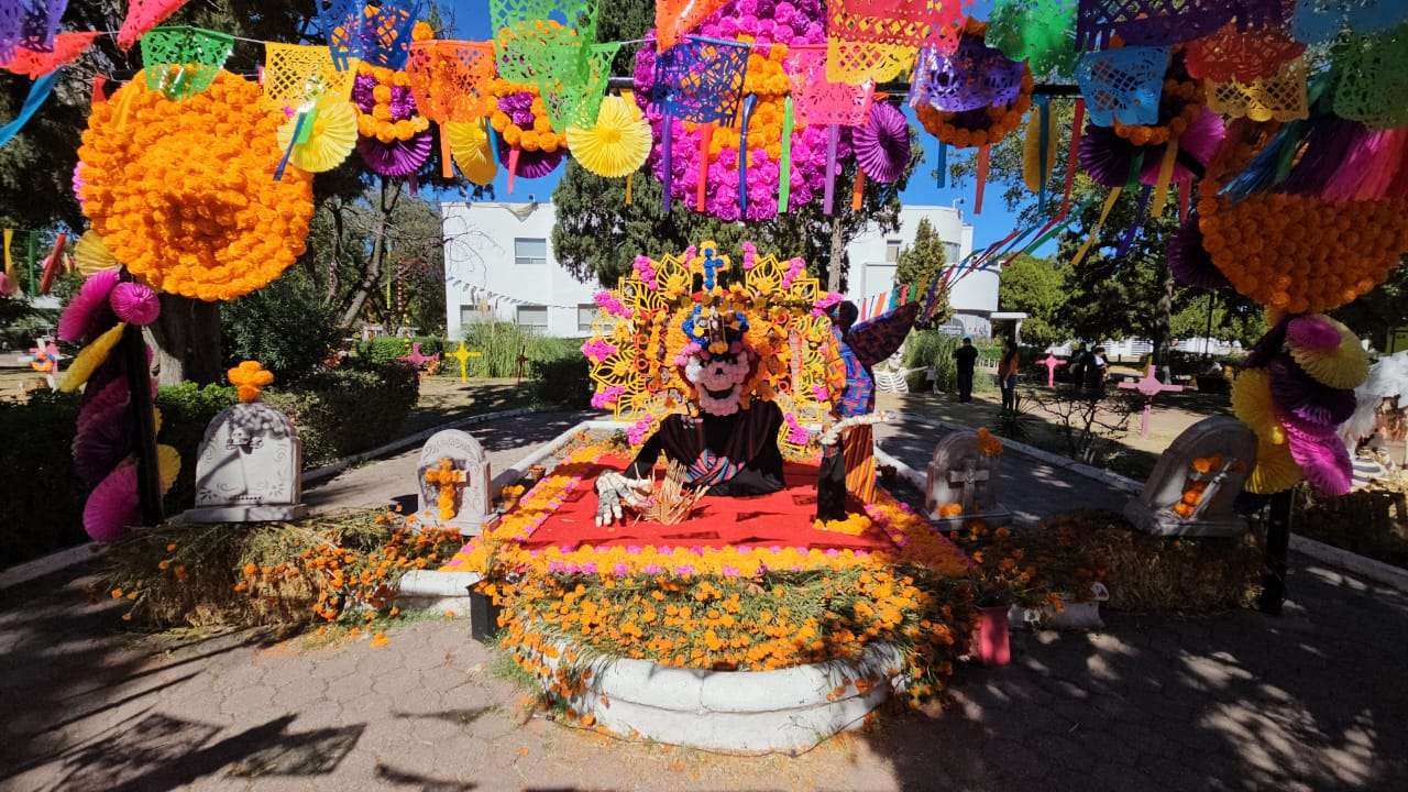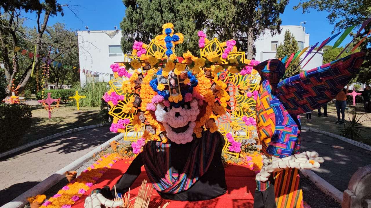 Chihuahua.- Este domingo 2 de noviembre decenas de chihuahuenses disfrutan de la exposición alusiva al Día de Muertos que instalaron en los jardines de la plaza cultural Los Laureles.
