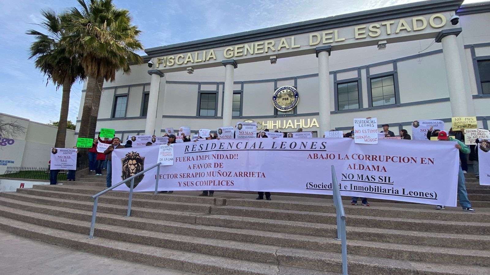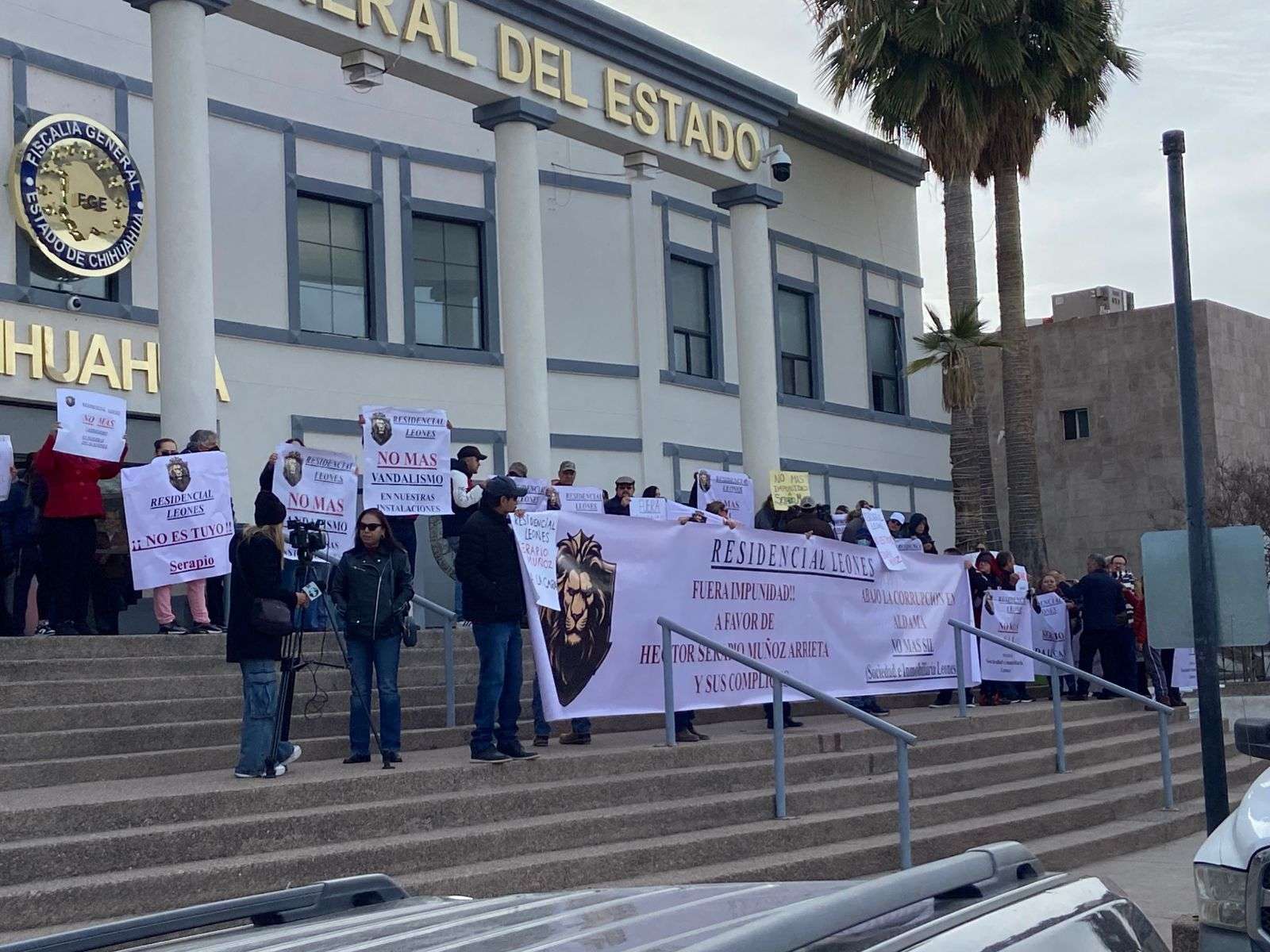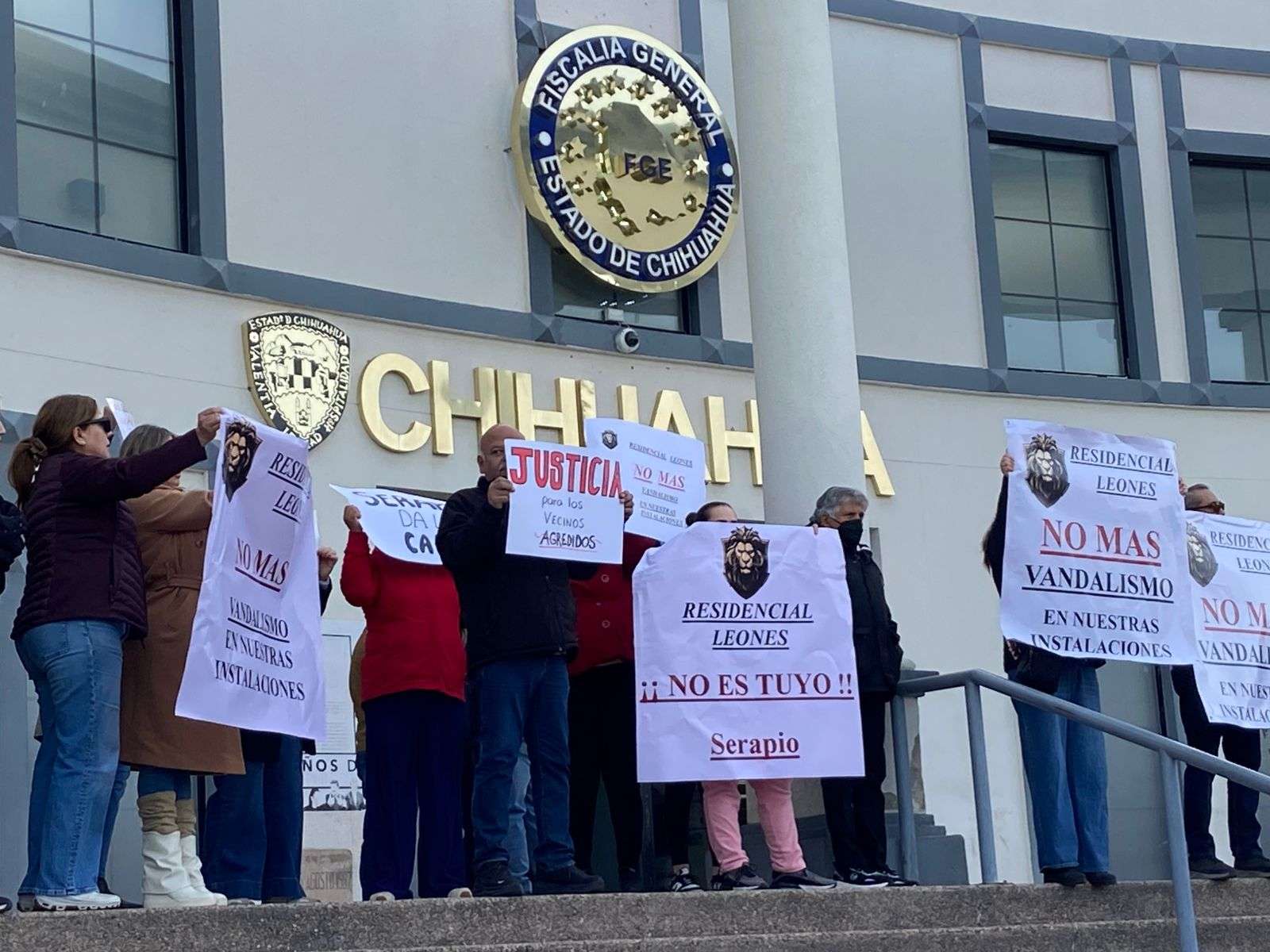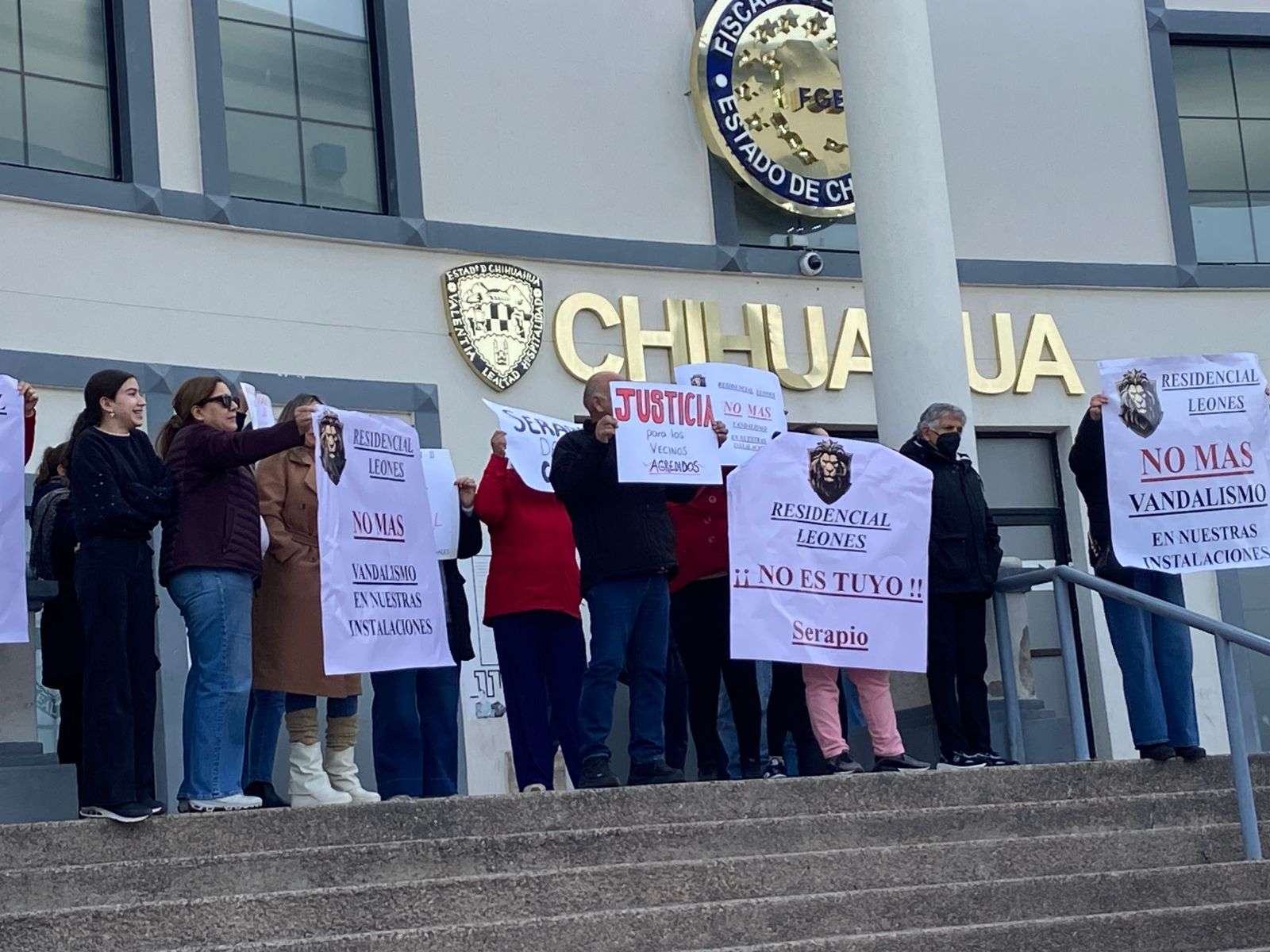 Chihuahua.– Habitantes del Residencial Leones, en Ciudad Aldama, se manifestaron frente a la Fiscalía General del Estado para exigir que Serapio Muñoz deje de intervenir en la administración del fraccionamiento.