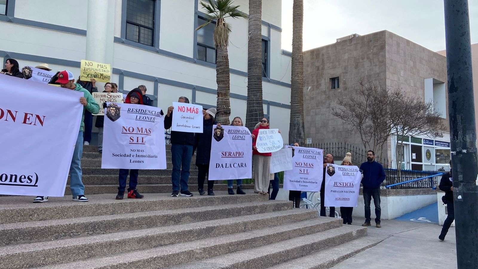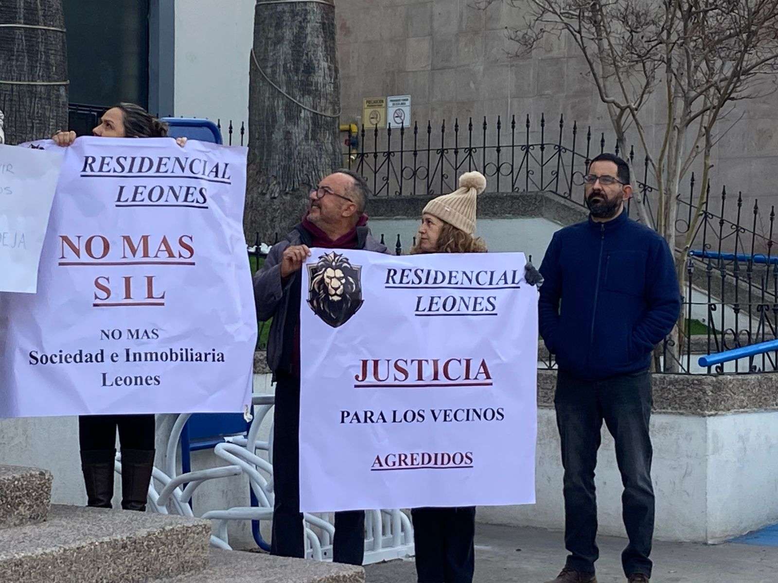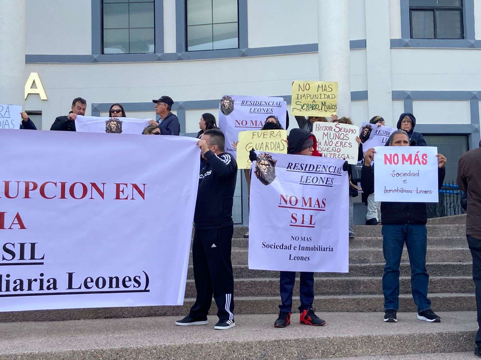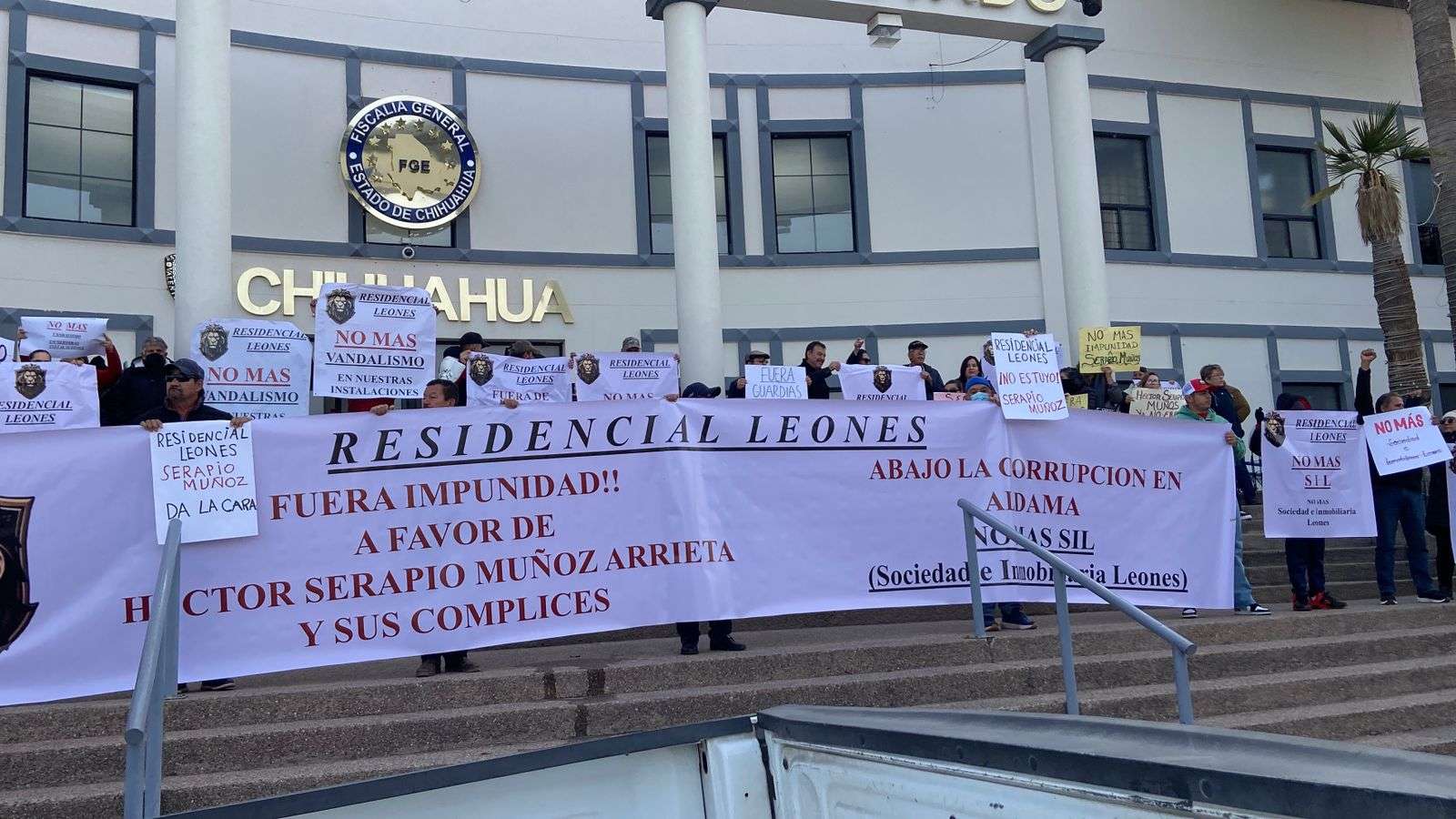 Chihuahua.– Habitantes del Residencial Leones, en Ciudad Aldama, se manifestaron frente a la Fiscalía General del Estado para exigir que Serapio Muñoz deje de intervenir en la administración del fraccionamiento.
