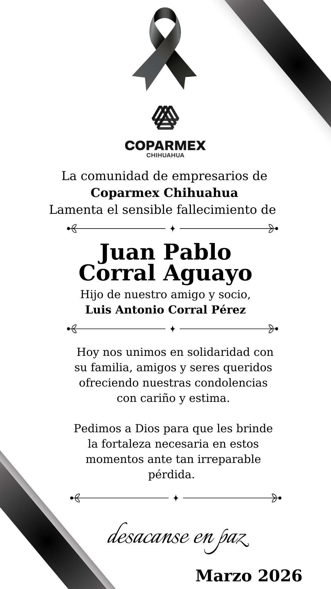A través de sus canales oficiales, la Coparmex Chihuahua emitió un mensaje de apoyo y solidaridad hacia la familia del empresario manzanero, cuyas huertas son un referente en el municipio de Cuauhtémoc. “Lamentamos profundamente el sensible fallecimiento de Juan Pablo Corral Aguayo, hijo de nuestro socio y amigo Luis Antonio Corral”, expresó el organismo patronal.