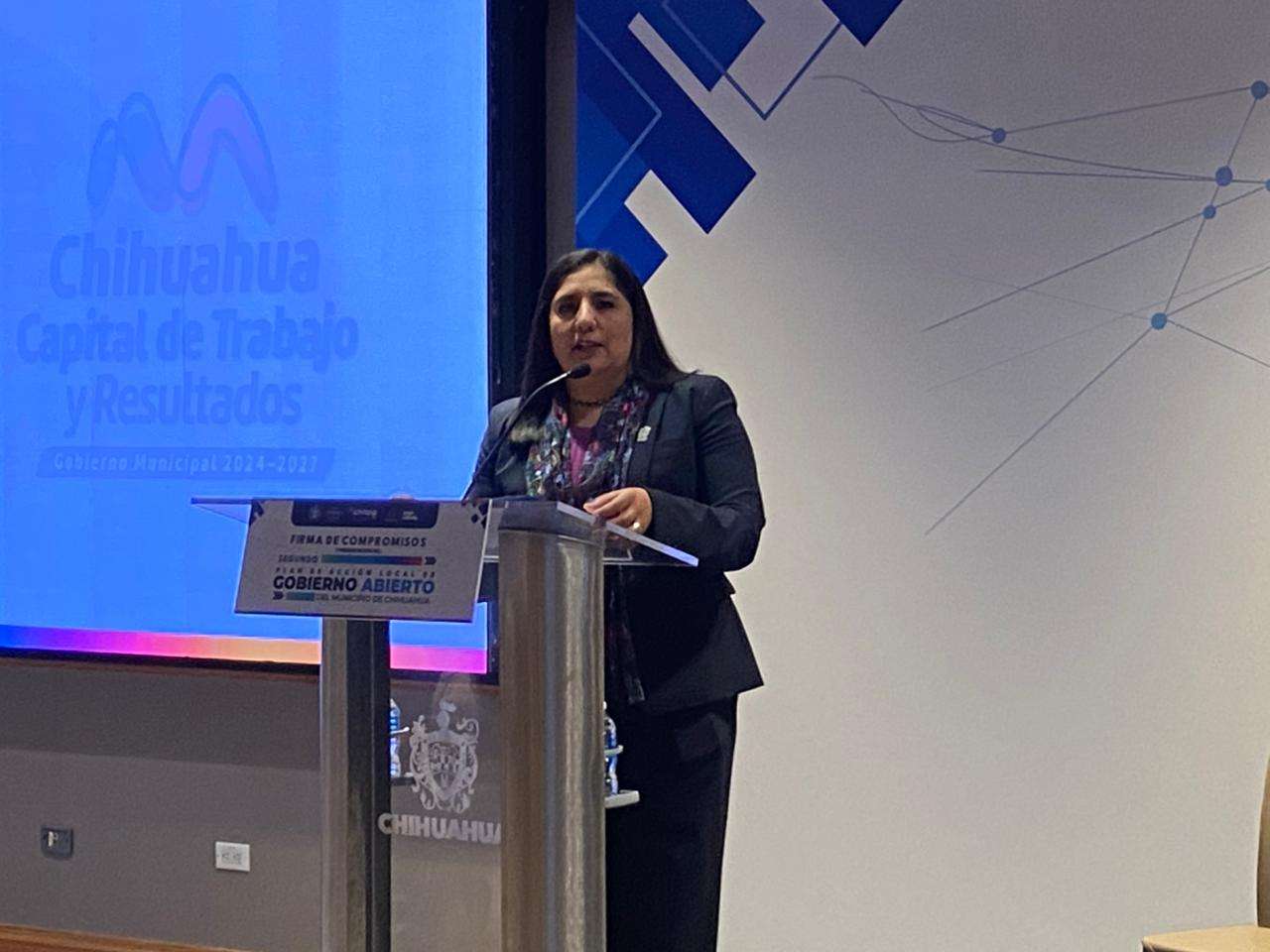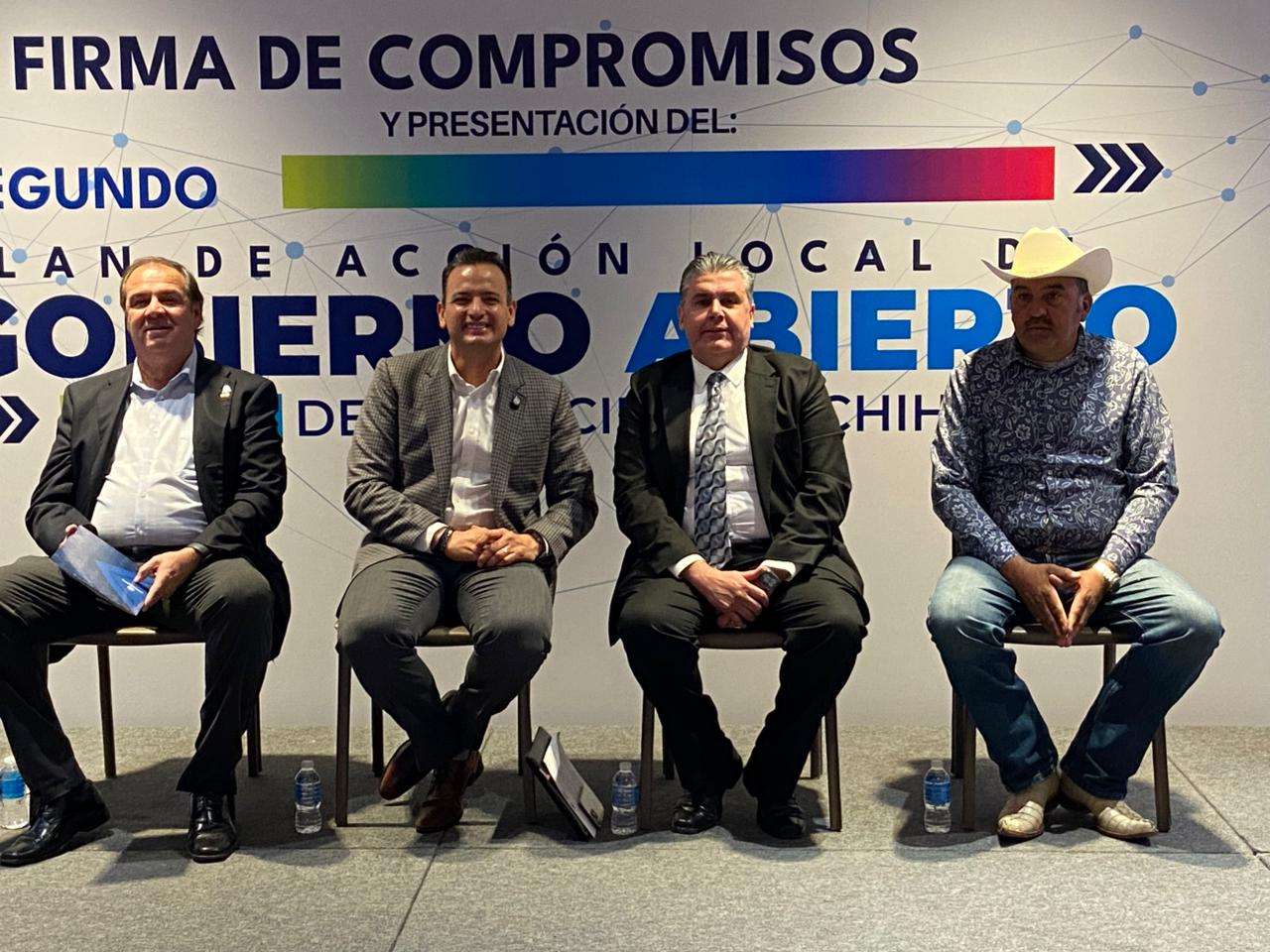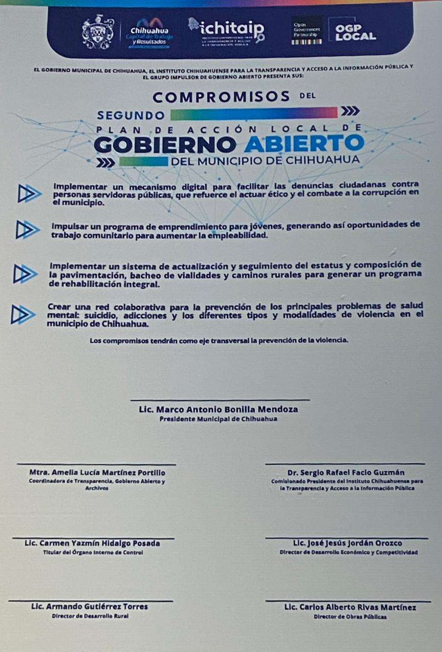 Chihuahua.- El Alcalde Marco Antonio Bonilla Mendoza, junto con Sergio Facio, consejero presidente del Ichitaip, y diversas dependencias del Gobierno Municipal, firmaron los compromisos del Segundo Plan de Gobierno Abierto.