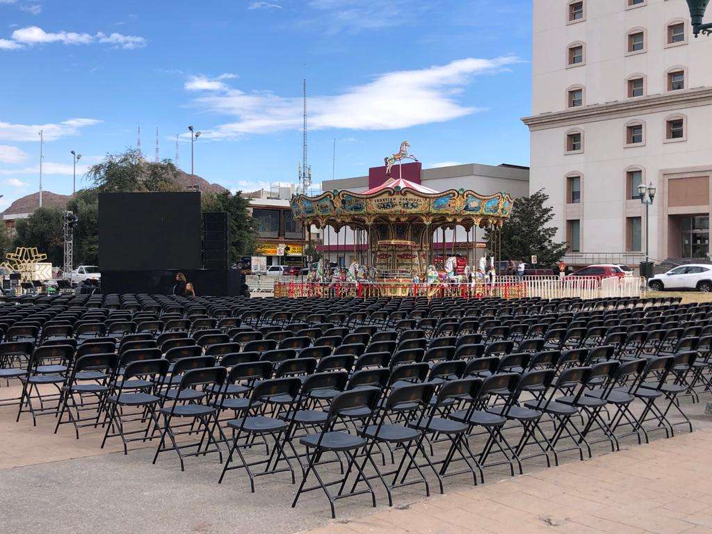 Asimismo, se pudo observar que se instalaron decenas de sillas para la gente que acudirá esta tarde al evento del encendido del árbol, el cual estará encabezado por la gobernadora del estado Maru Campos.