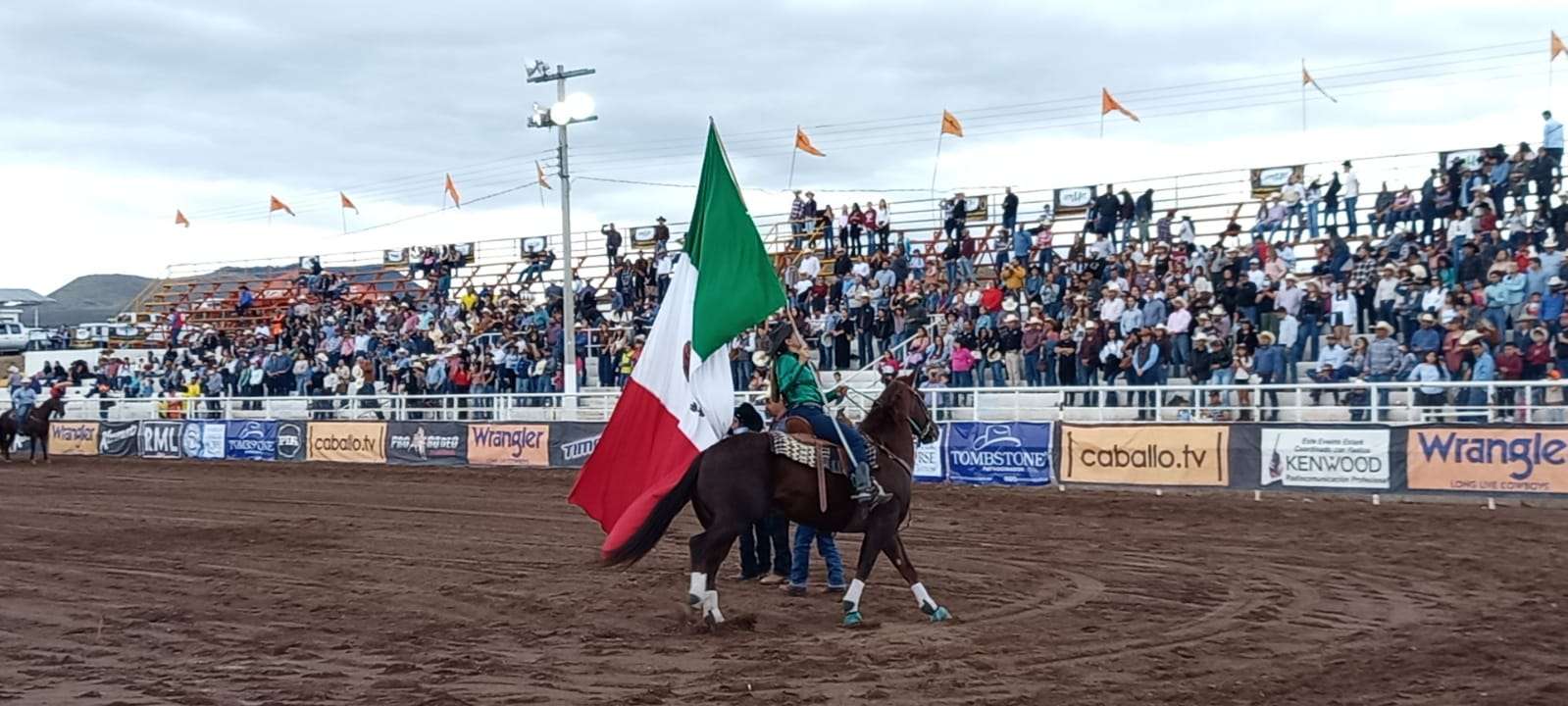 Chihuahua.- En la arena de Rodeo del Expogan 2023, entonando el Himno Nacional nombraron a Alejandra Mendoza como Miss Vaquera 2023, realizando después del acto protocolario su primer vuelta al rodeo.