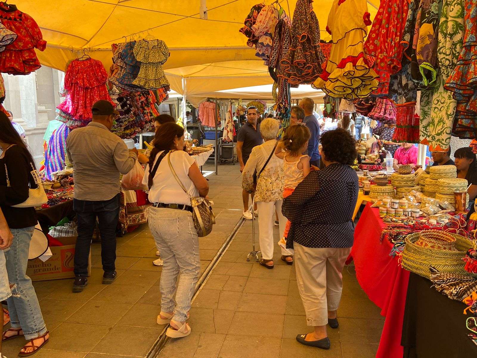Esta feria estará instalada hasta las 9 de la noche donde se encuentran más de 50 expositores de artesanías que venden ropa, artesanías, joyería, productos elaborados de piel, zapatos, bolsas y mochilas, productos de Oaxaca, productos artesanales hechos de madera.
