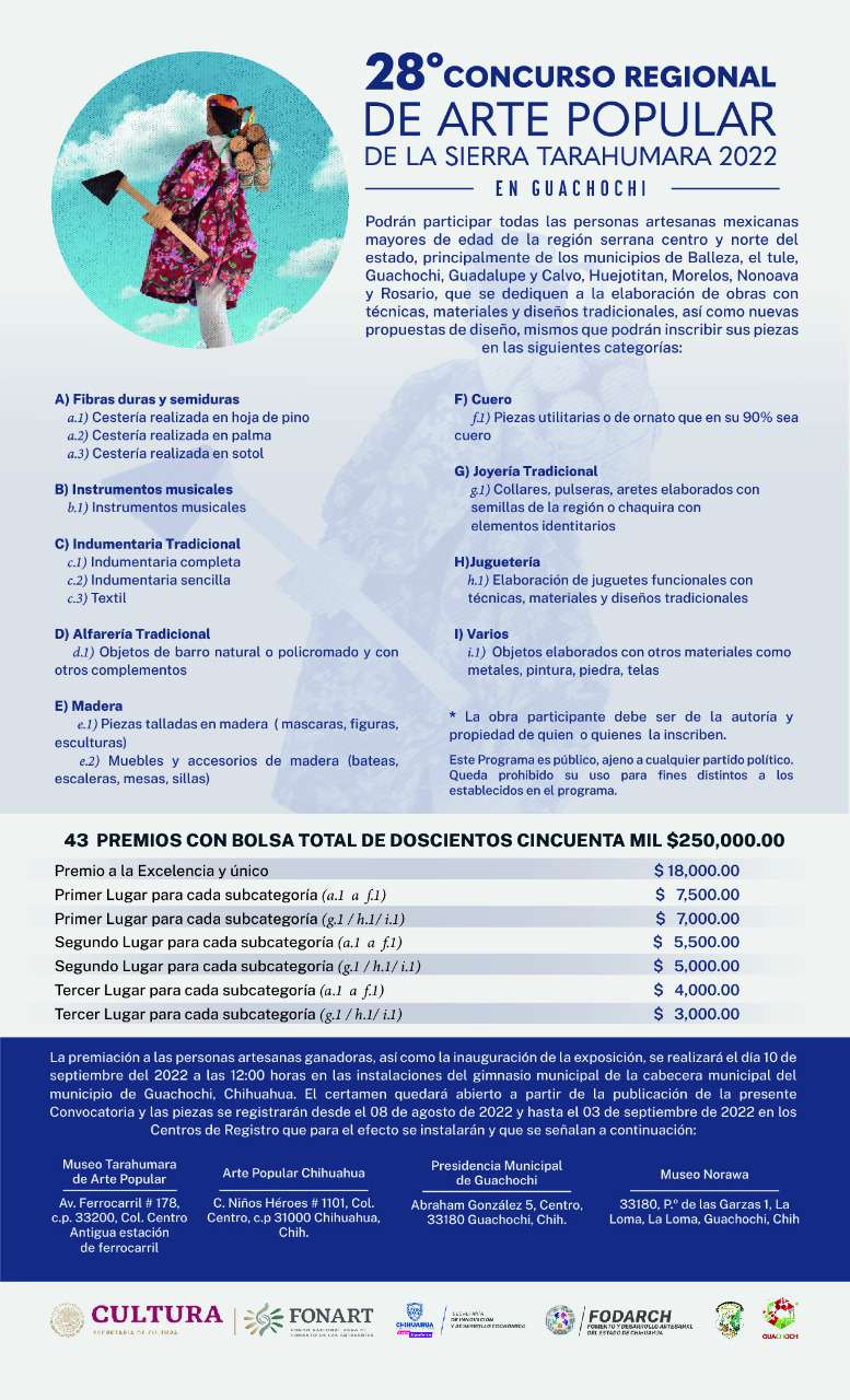 Chihuahua, Chih. - La Secretaría de Innovación y Desarrollo Económico (SIDE), a través de Fomento y Desarrollo Artesanal del Estado de Chihuahua (FODARCH), informó sobre las dos sedes del 28° Concurso Regional de Arte Popular de la Sierra Tarahumara 2022, fechas de premiación y registro, así como actividades próximas a realizarse en Sisoguichi y Creel del municipio de Bocoyna.