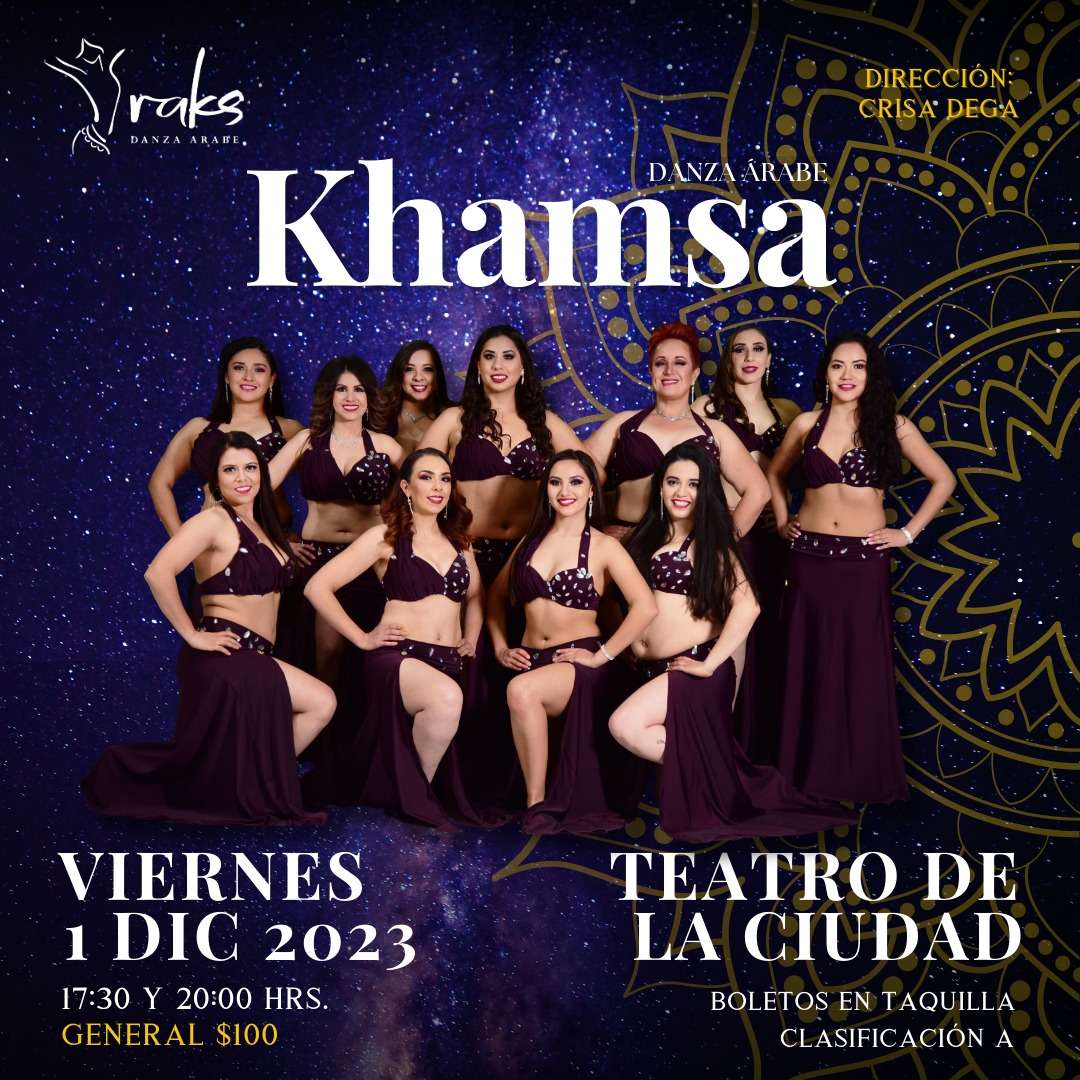 Sube a escena Khamsa, show de Danza Árabe a cargo de la compañía Raks Danza Árabe. Dicho evento es con fines culturales y de difusión artística, buscando fomentar con ello que las bailarinas tengan un espacio donde expresar y mostrar el trabajo que han realizado durante el año. Khamsa (traducción, cinco) se presenta este año a modo de celebración del quinto aniversario de Raks Danza Árabe, festival que durante cinco años consecutivos se ha presentado gracias a la confianza del público y compromiso de las bailarinas.