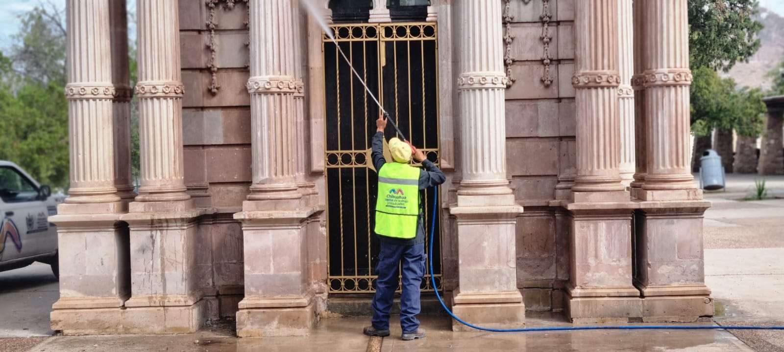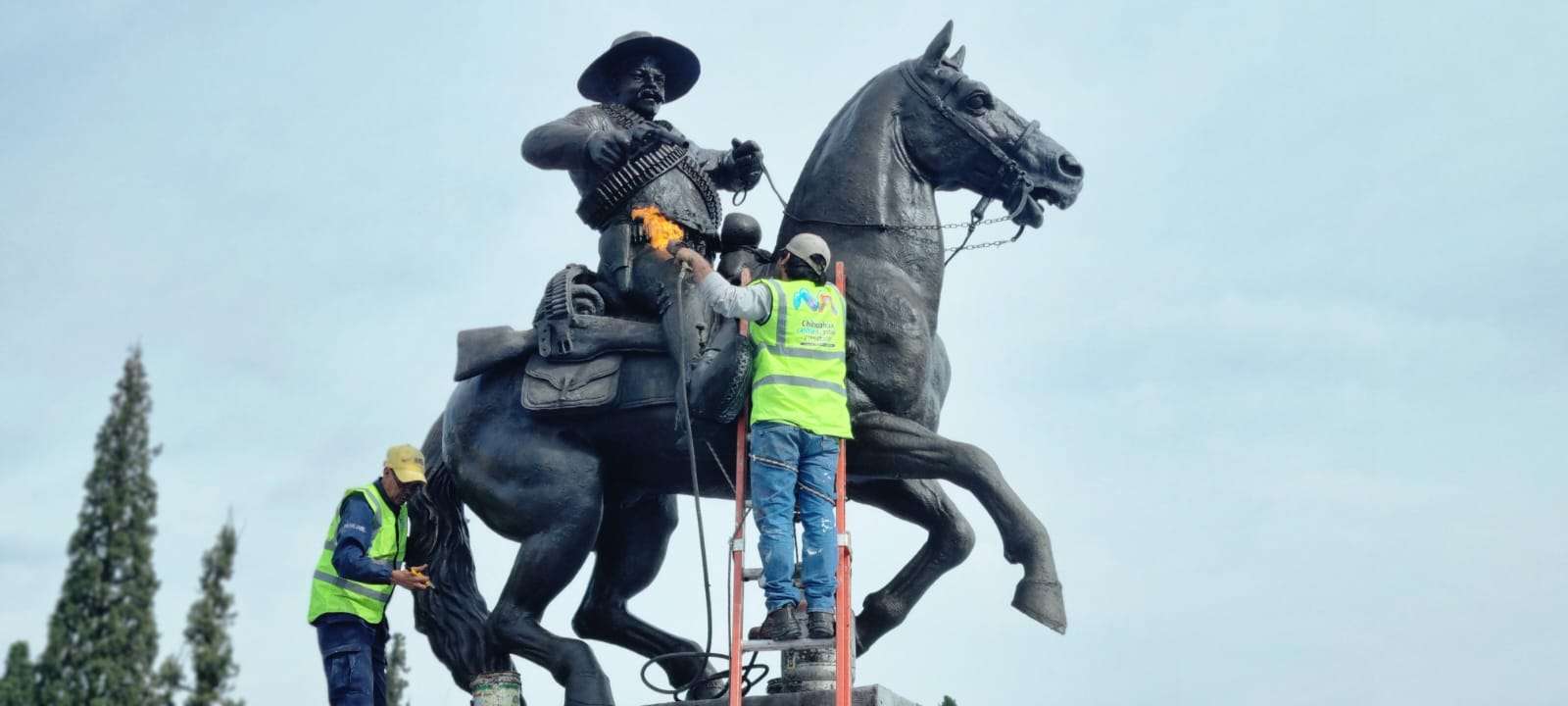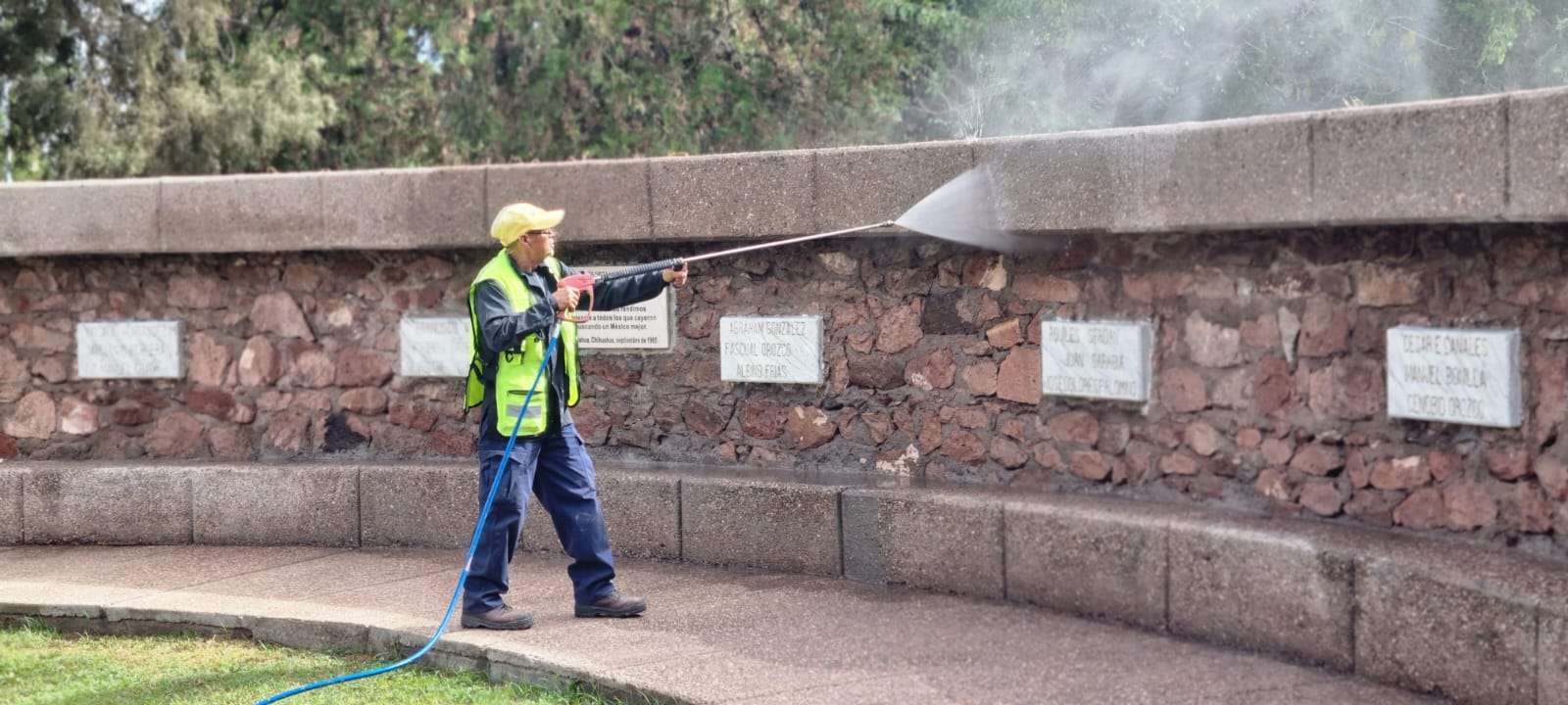 Chihuahua.- En el marco de los festejos por el día de la Revolución Mexicana, el Gobierno Municipal, a través de la Dirección de Mantenimiento Urbano, realizó limpieza y manutención de monumentos emblemáticos y representativos del 20 de noviembre.