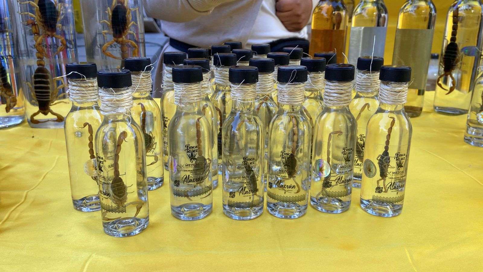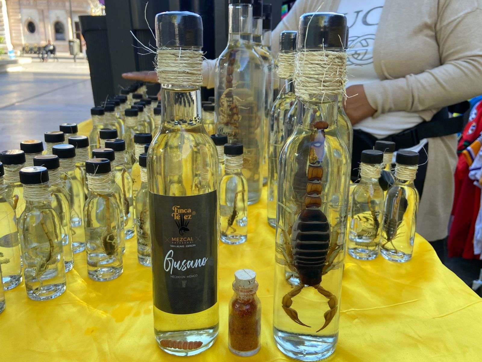 Chihuahua. - La señora Estela Aguilar originaria del estado de Oaxaca, está vendiendo mezcal con alacrán elaborado de manera artesanal en diferentes presentaciones chico, mediano y grande.