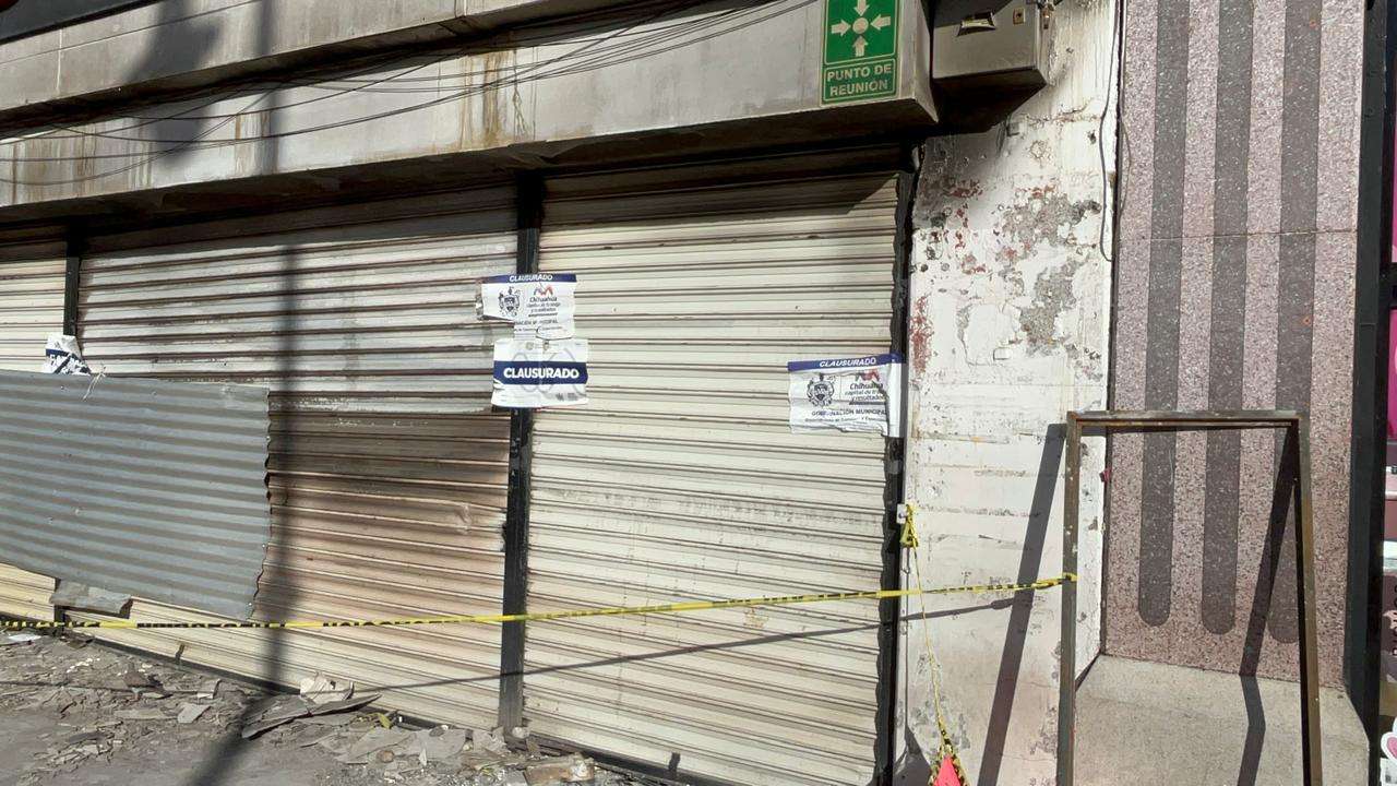 Chihuahua.- A casi una semana del siniestro que puso en jaque al primer cuadro de la ciudad, el establecimiento comercial Hualong, situado en la intersección de la calle Libertad y la avenida Tercera, mantiene sus cortinas cerradas y luce sellos de clausura oficial.