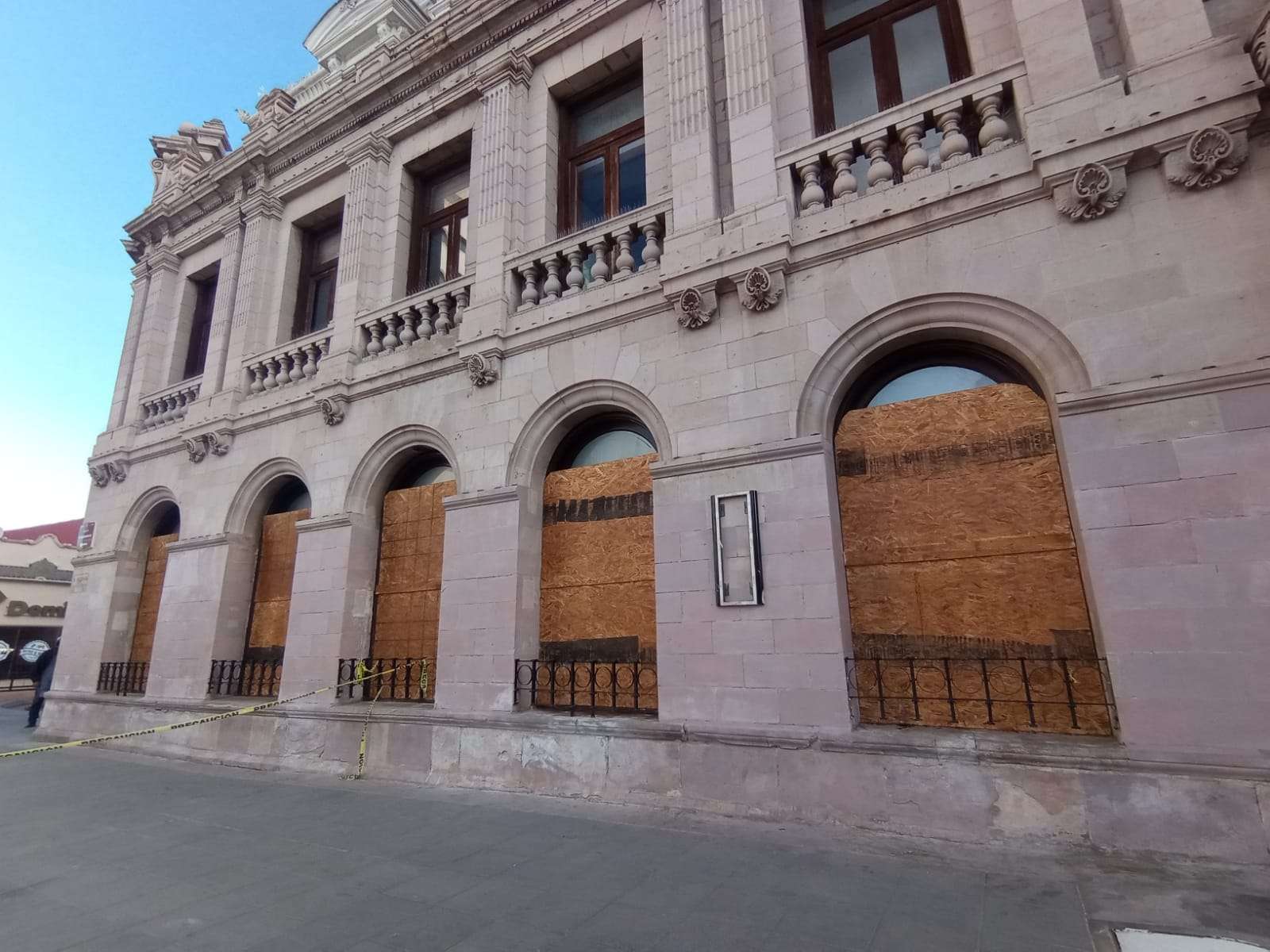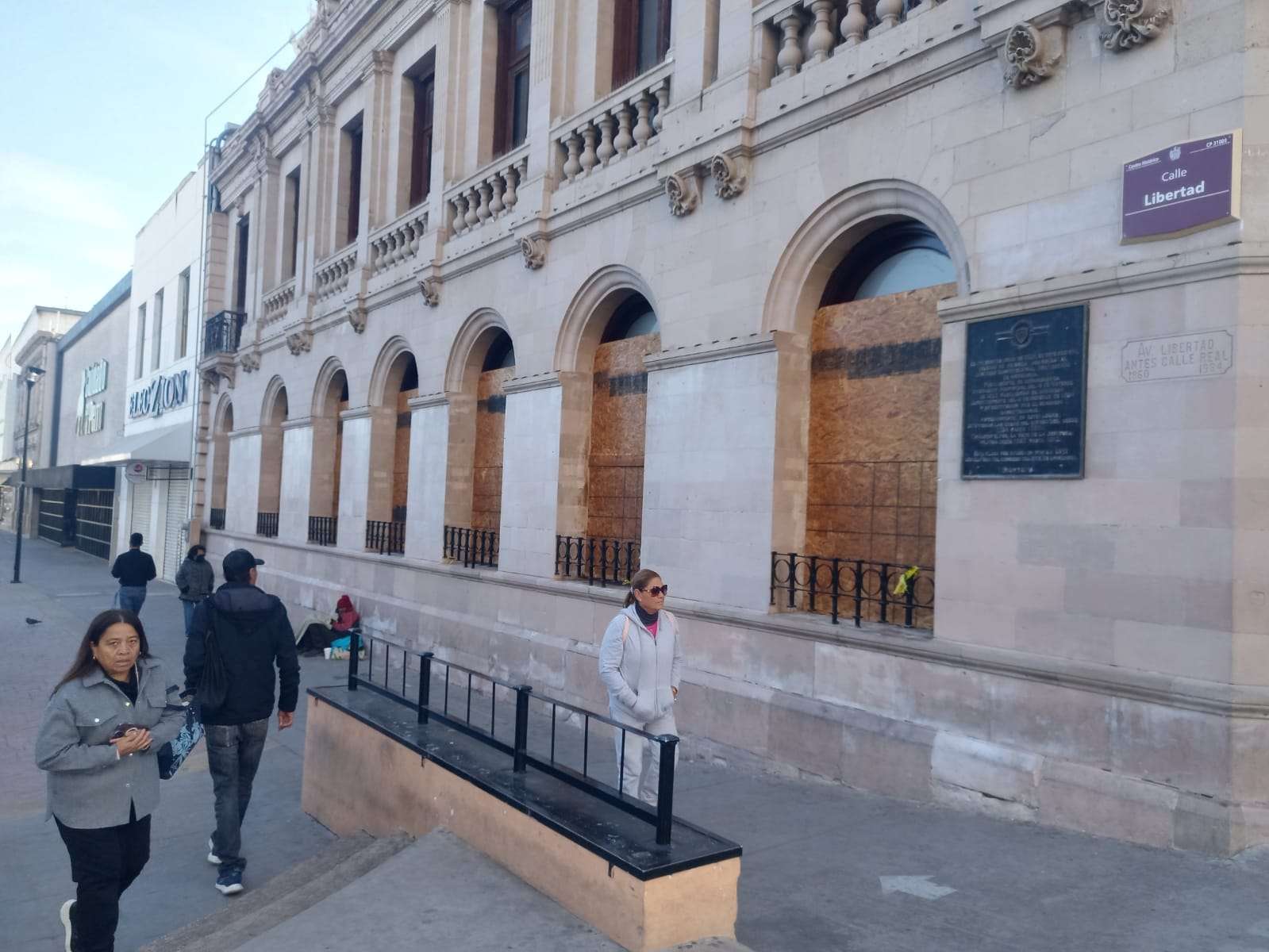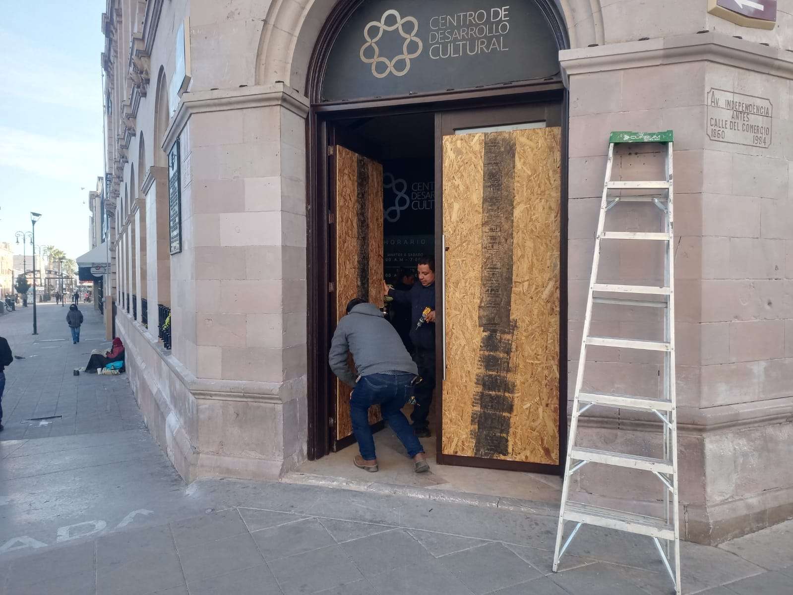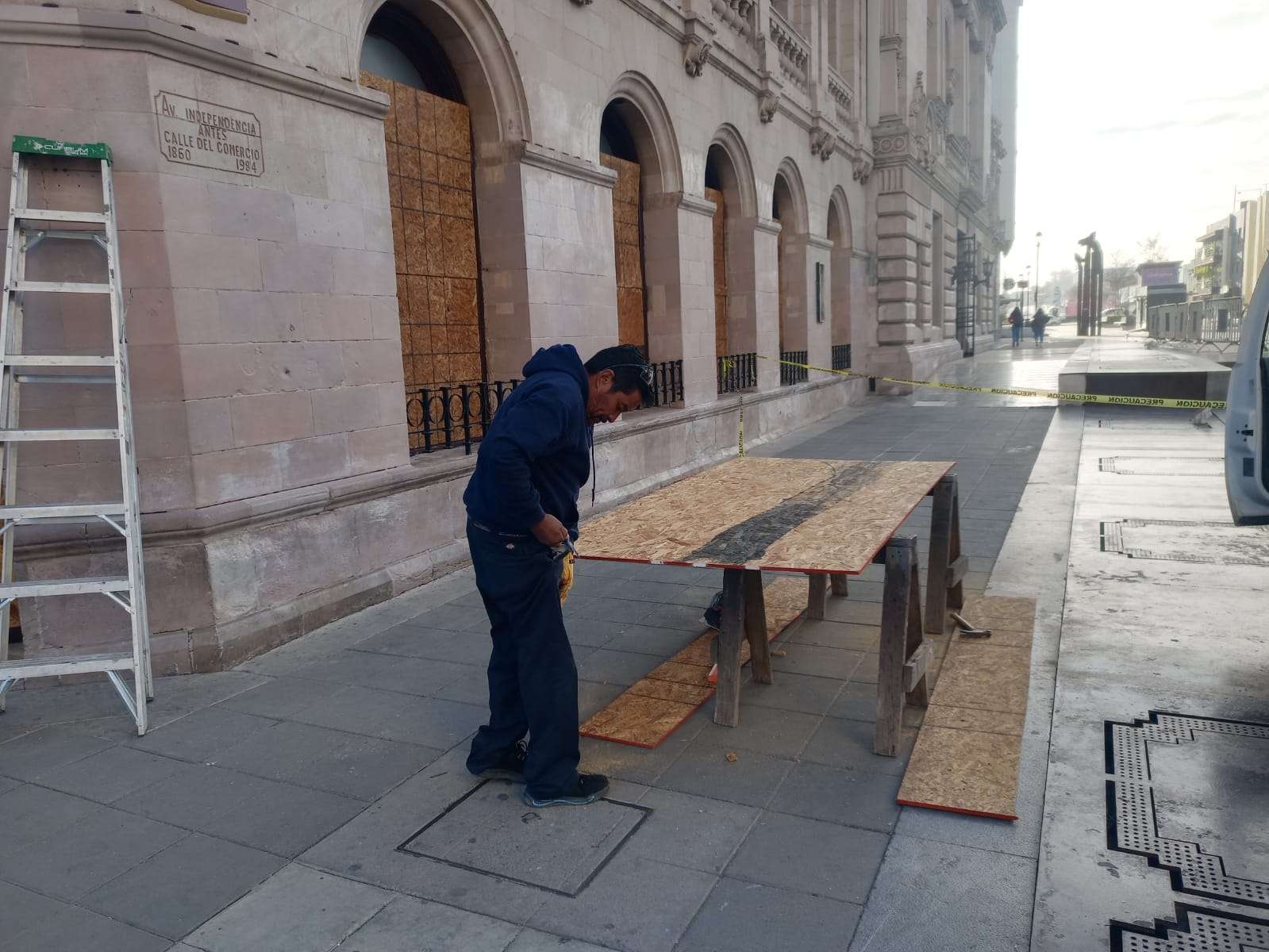 Chihuahua.- Personal de Servicios Generales del Municipio de Chihuahua protegieron ventanas y puertas del Centro de Desarrollo Cultural y el edificio de la Presidencia Municipal debido a la marcha del 25N que se realizará este fin de semana en la ciudad.