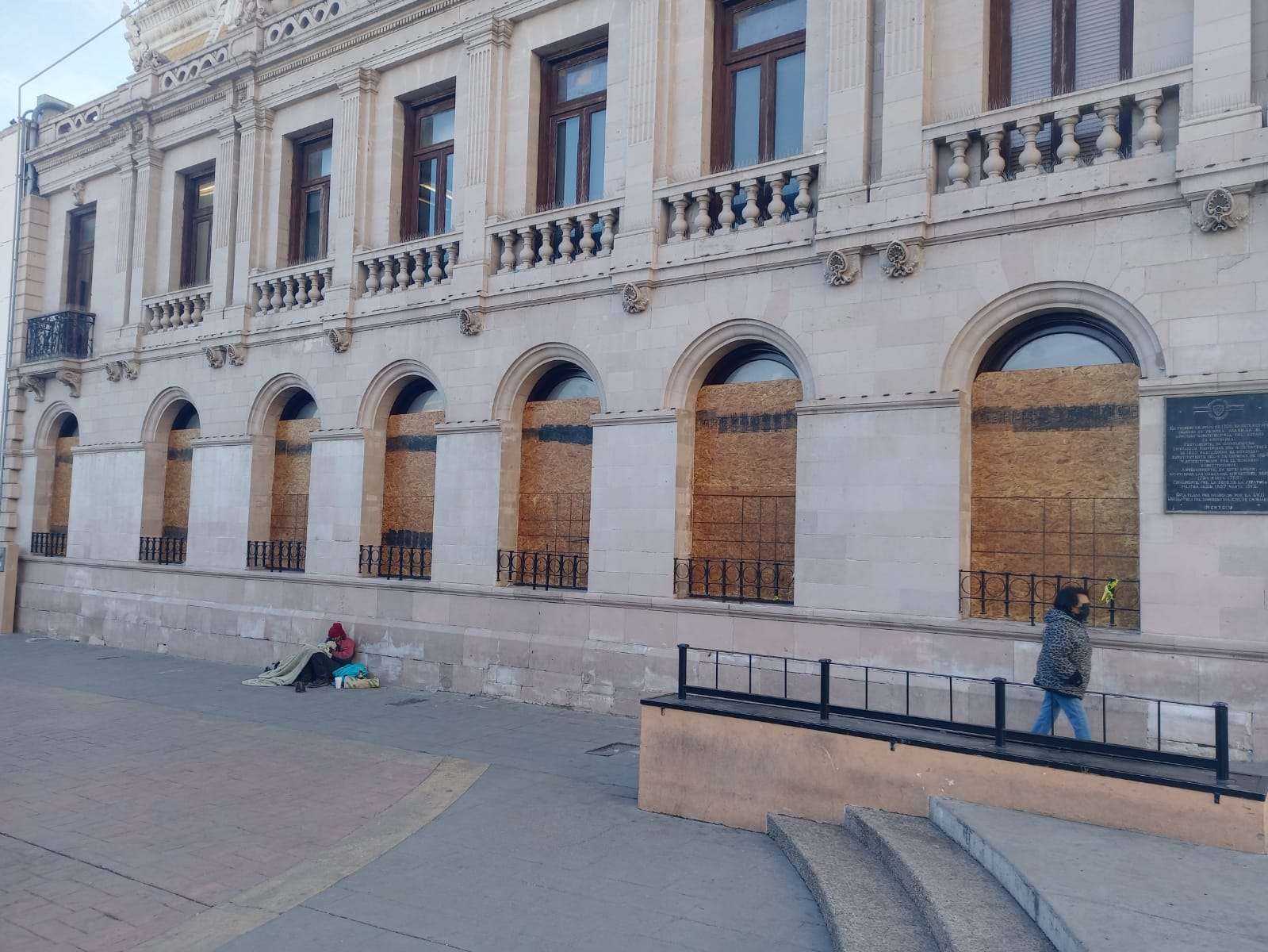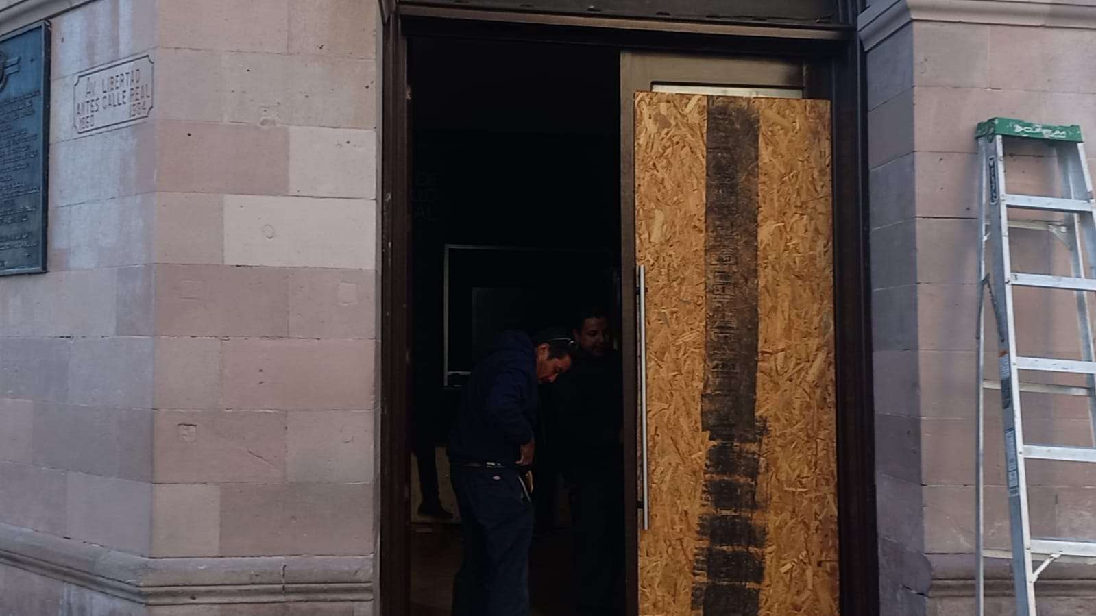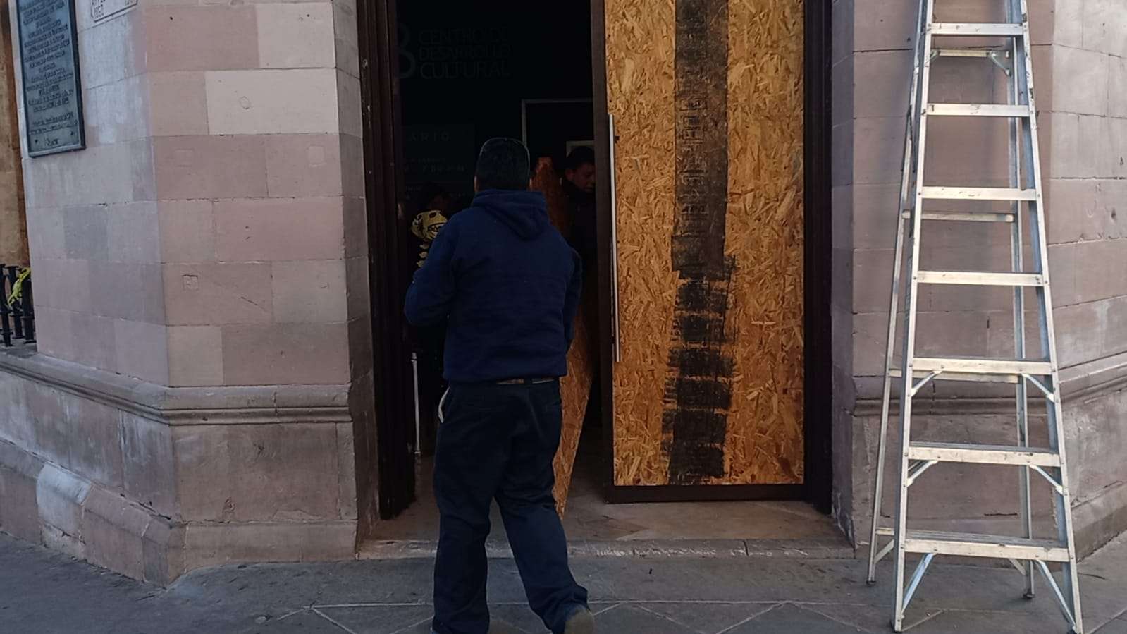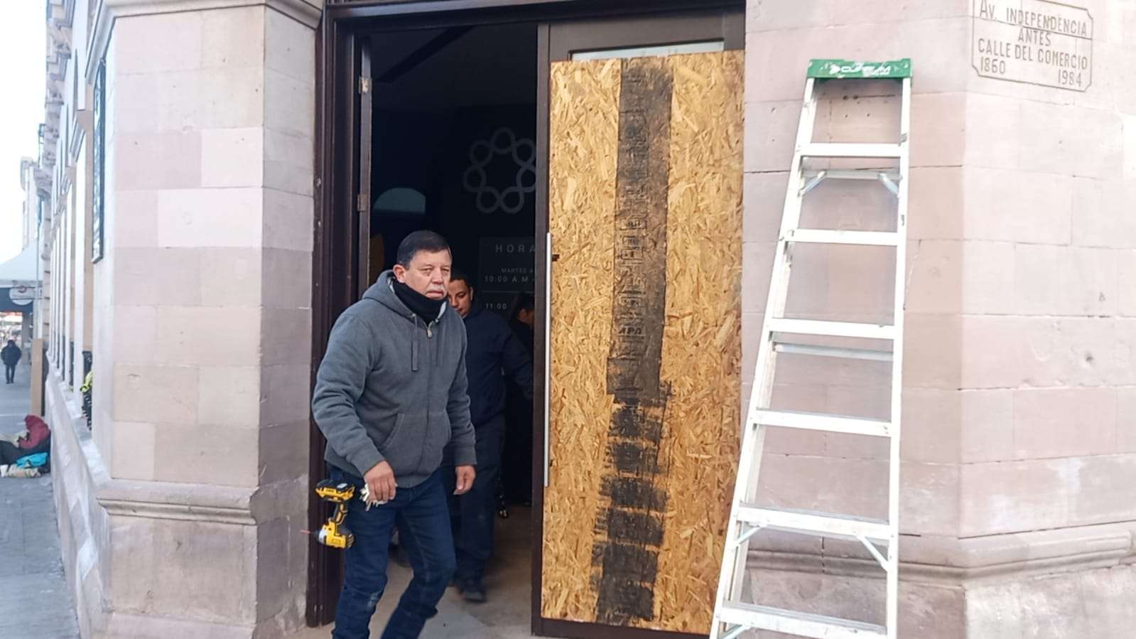 Chihuahua.- Personal de Servicios Generales del Municipio de Chihuahua protegieron ventanas y puertas del Centro de Desarrollo Cultural y el edificio de la Presidencia Municipal debido a la marcha del 25N que se realizará este fin de semana en la ciudad.