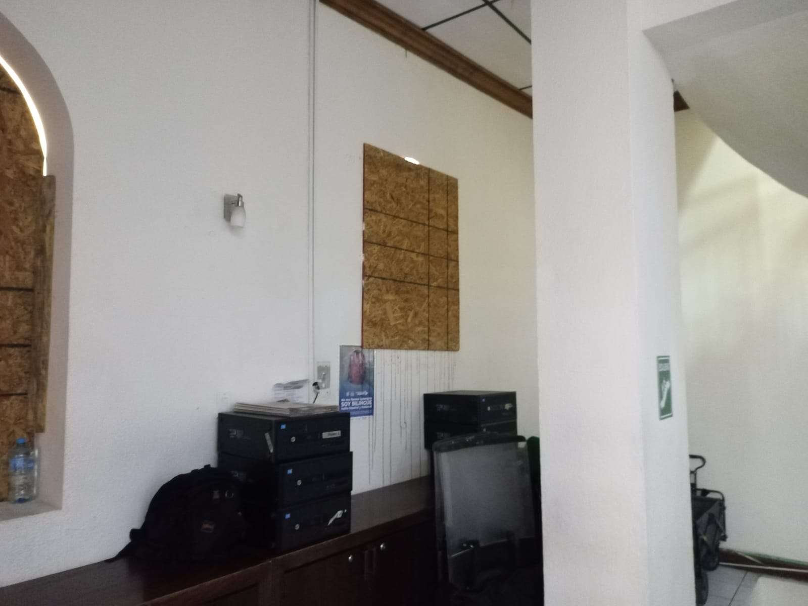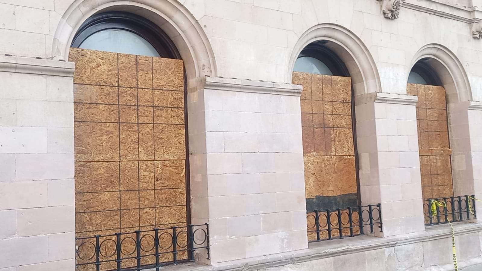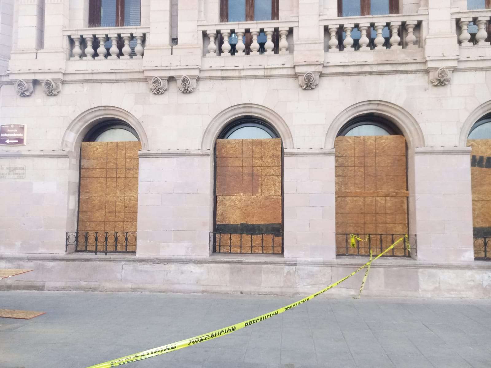 La presidencia municipal fue protegida con placas de triplay por dentro, para evitar cualquier tipo de incidente al interior, mientras unos más que fueron colocaron por la parte de afuera fueron rociador con retardante al fuego.