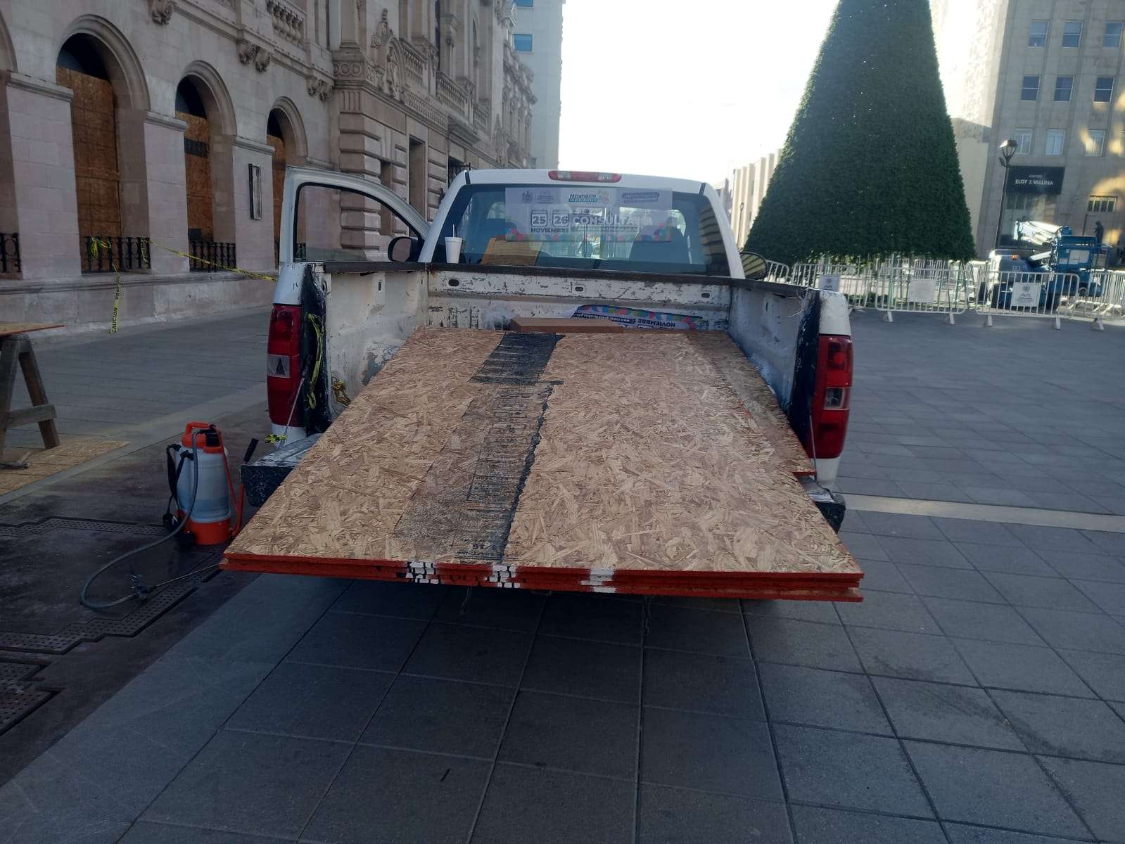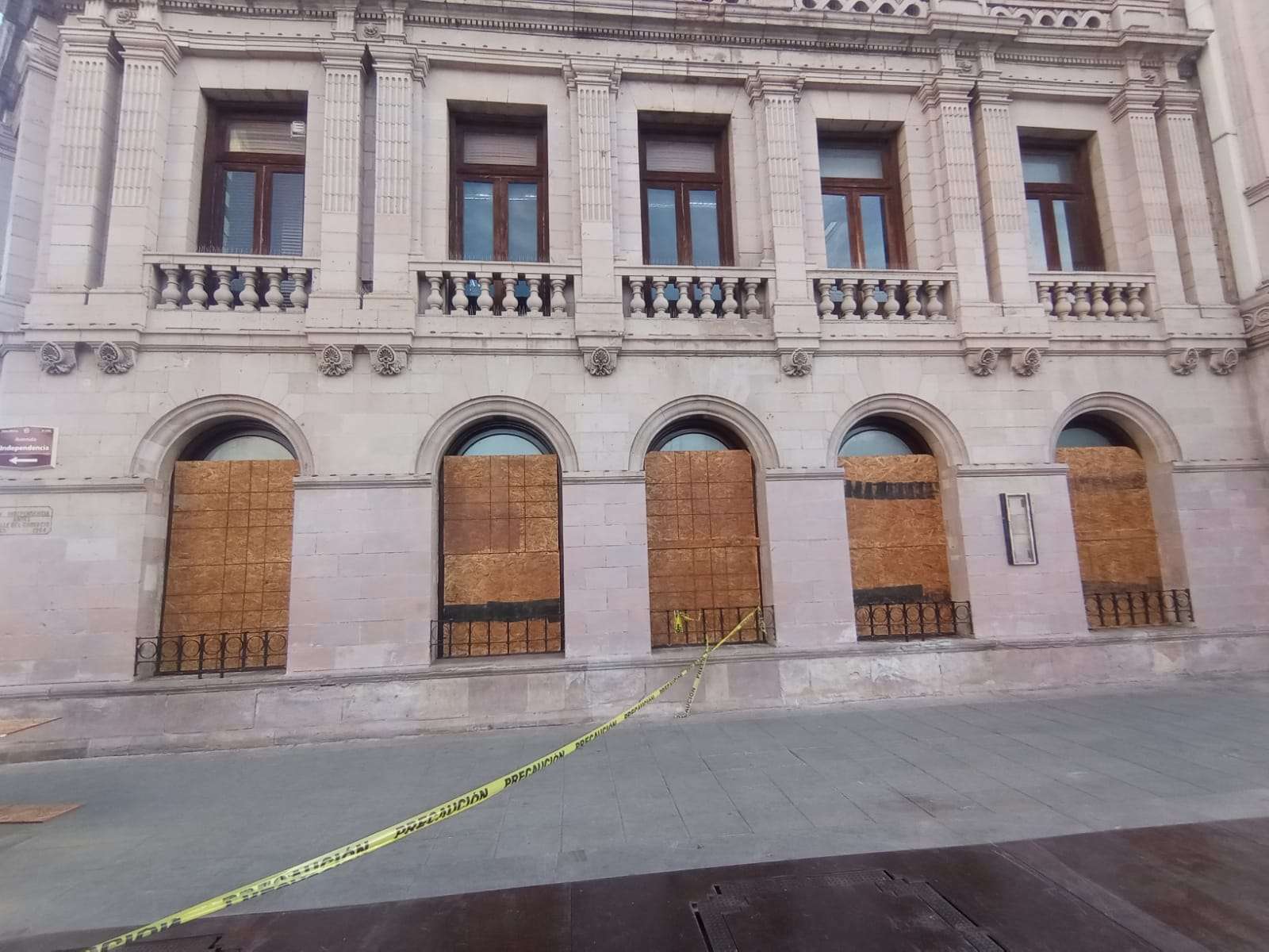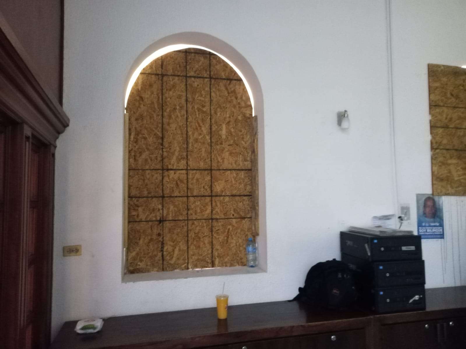 La presidencia municipal fue protegida con placas de triplay por dentro, para evitar cualquier tipo de incidente al interior, mientras unos más que fueron colocaron por la parte de afuera fueron rociador con retardante al fuego.