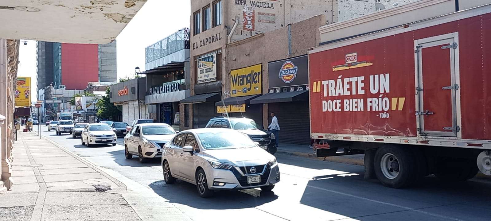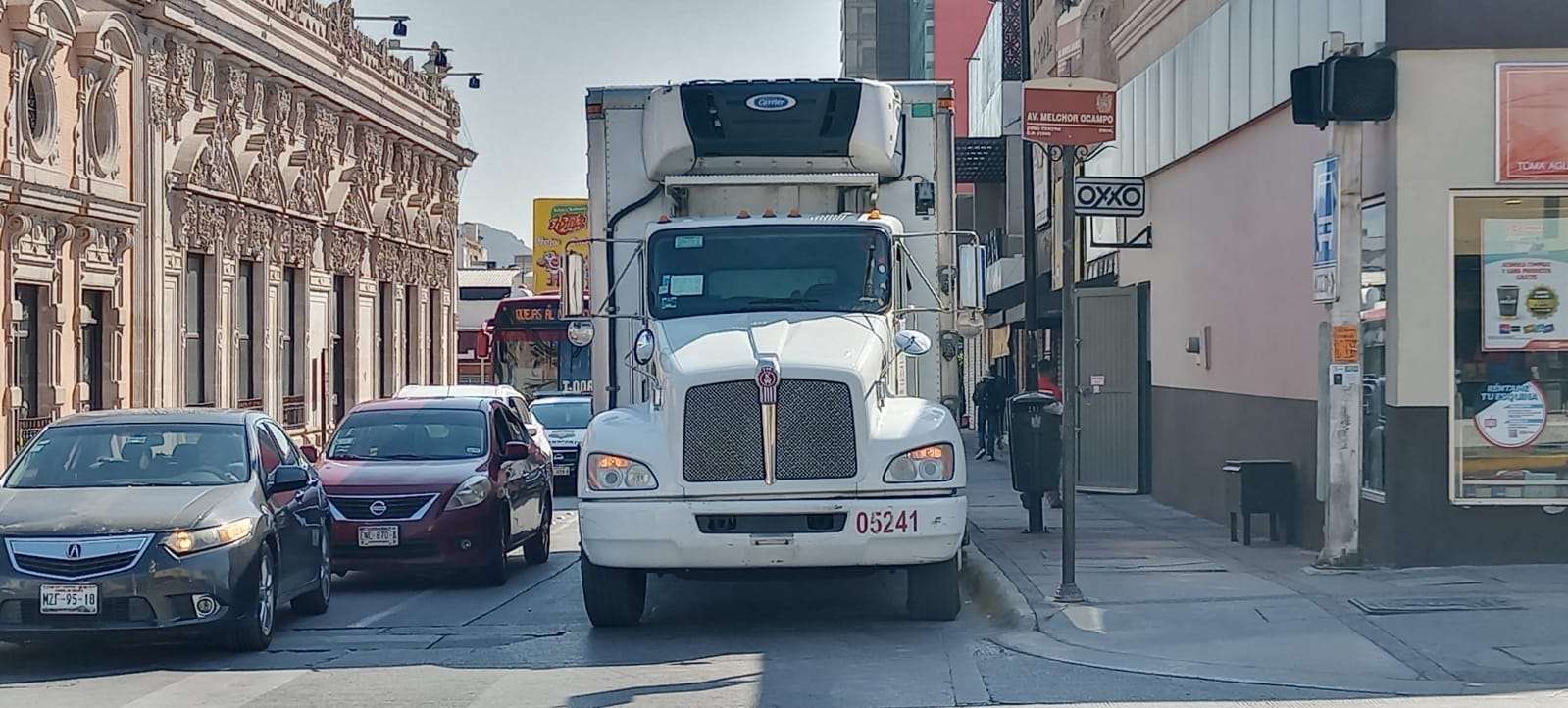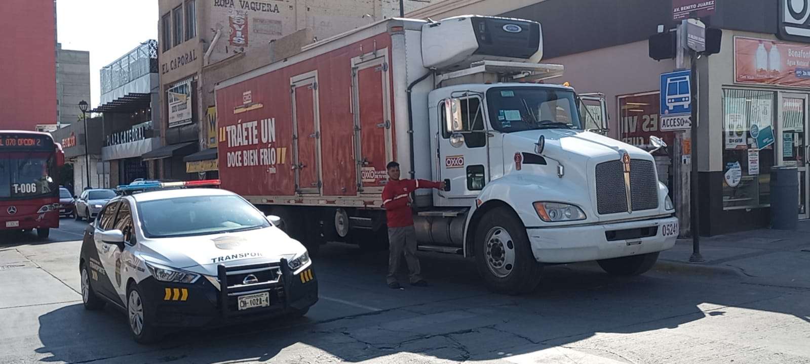 Chihuahua, Chih.- Un camión de reparto tortón marca Kenworth con número económico 05241 de Oxxo, creo gran caos vial cuando se paró en plena avenida Juárez y Ocampo a descargar mercancía.
