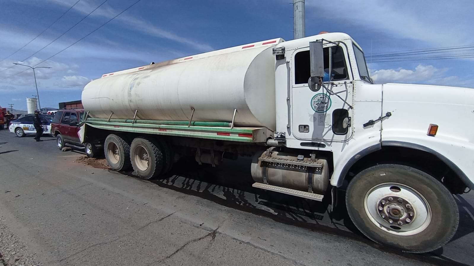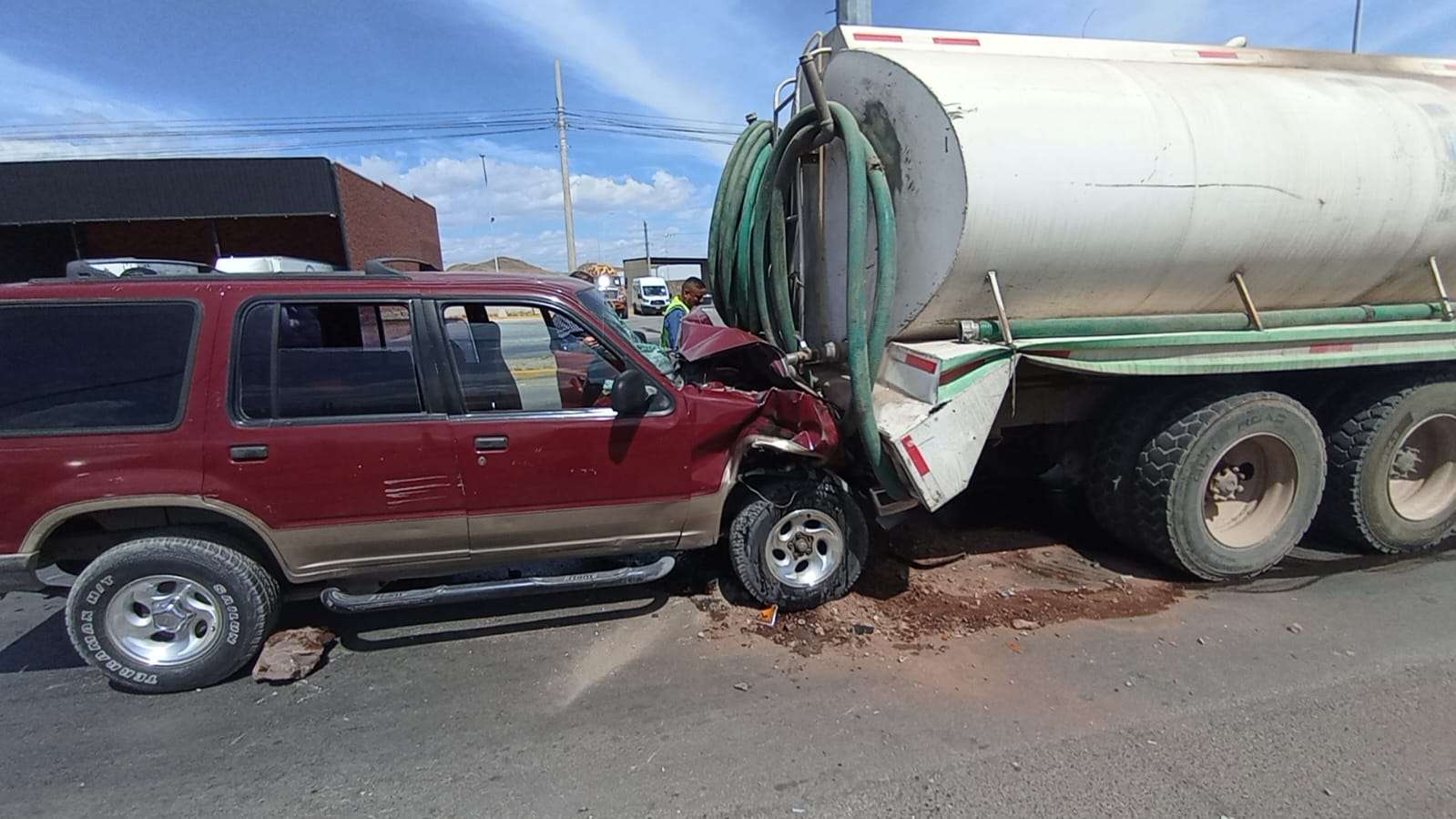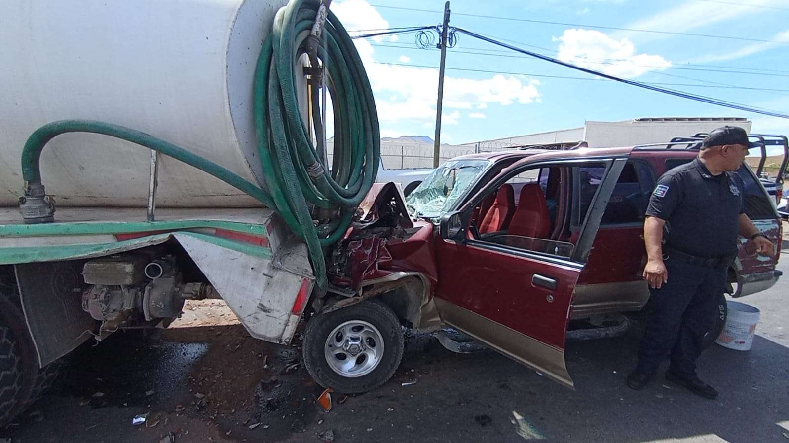 Chihuahua.— El conductor de una camioneta Ford Explorer, color rojo, quedó atrapado al interior de la unidad luego de impactarse contra la parte trasera de una pipa de acarreo de agua, en un accidente registrado la mañana de este martes.