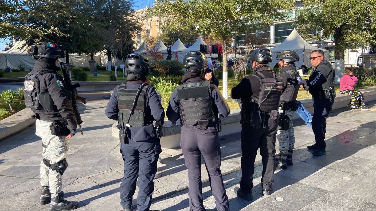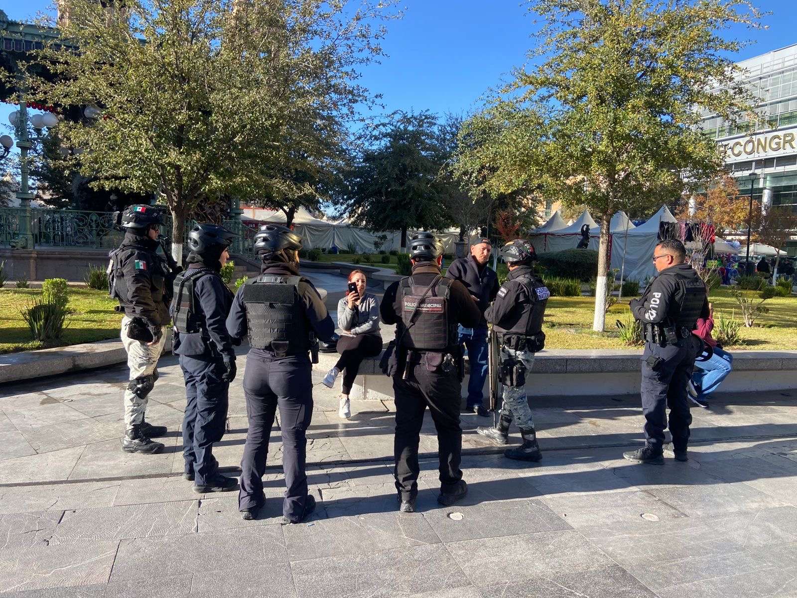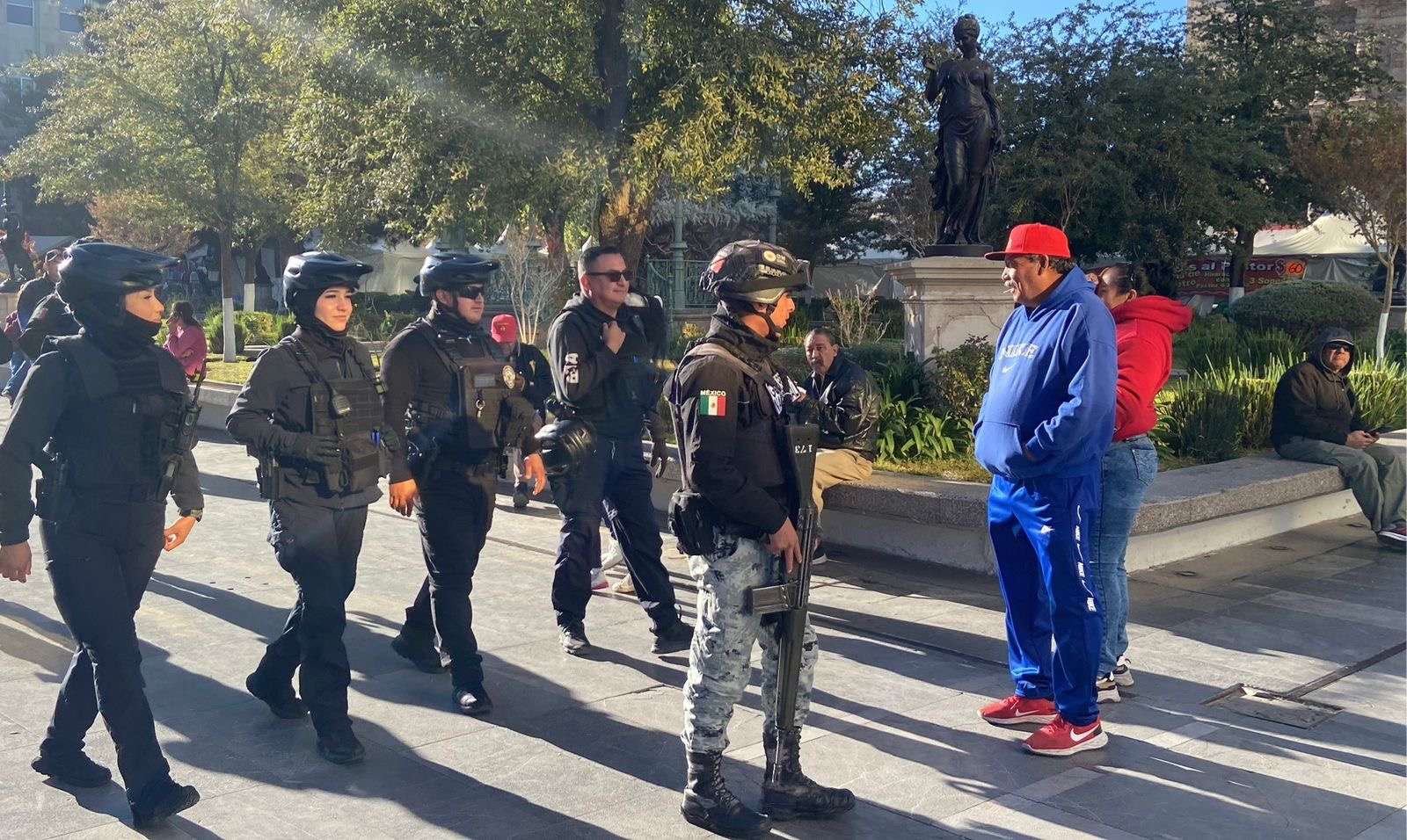 Chihuahua.- Elementos de la Guardia Nacional en Coordinación con la Policía Municipal, realizan recorridos a pie en la Plaza de Armas como parte de un operativo de proximidad social que busca fortalecer la relación entre las fuerzas del orden y la ciudadanía, así como prevenir delitos en el primer cuadro de la ciudad.