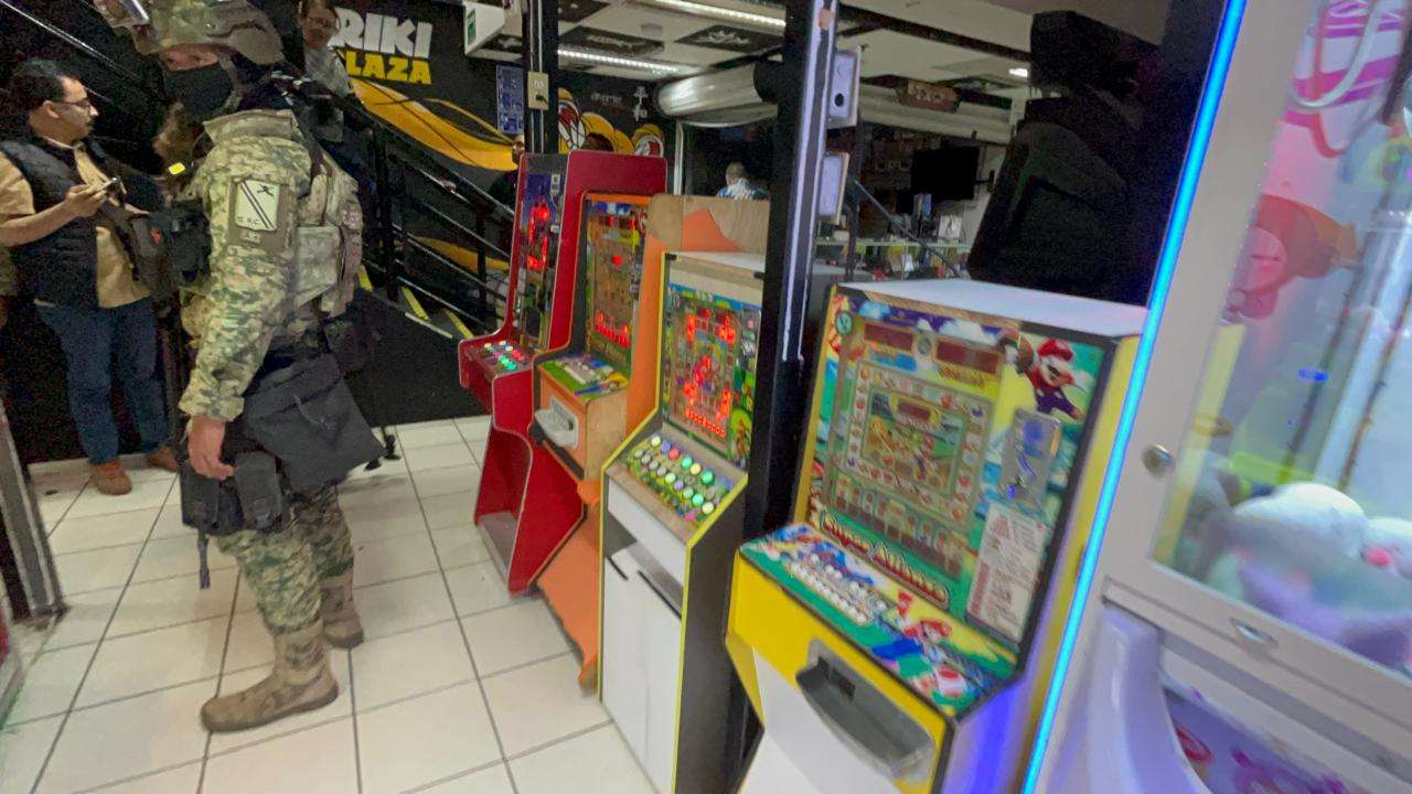 Personal de Sedena, Guardia Nacional, policía municipal, policía estatal y personal de Gobernacion municipal, acudieron esta mañana a la plaza de la tecnología, donde aseguraron al menos 60 máquinas tragamonedas.