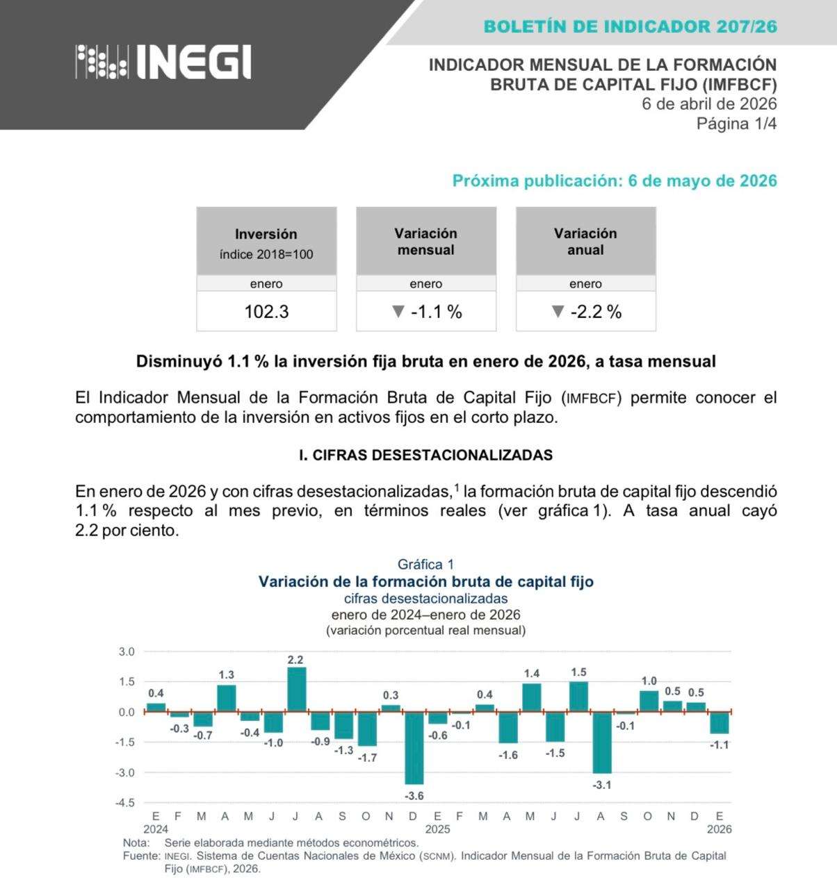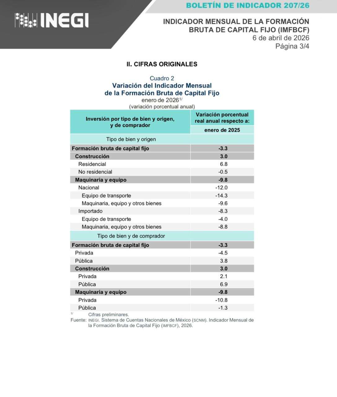 De acuerdo con el reporte oficial, la inversión registró una caída del 1.1% en términos mensuales y un avance de apenas 2.2% a tasa anual durante el primer mes del año, lo que representa una clara pérdida de dinamismo en comparación con el cierre del ejercicio anterior. Mares Delgado destacó que este debilitamiento es generalizado, afectando incluso a rubros que anteriormente mostraban resiliencia.