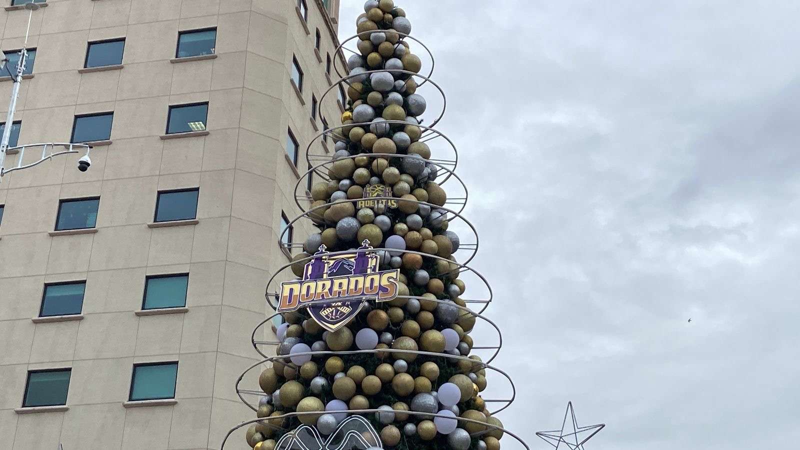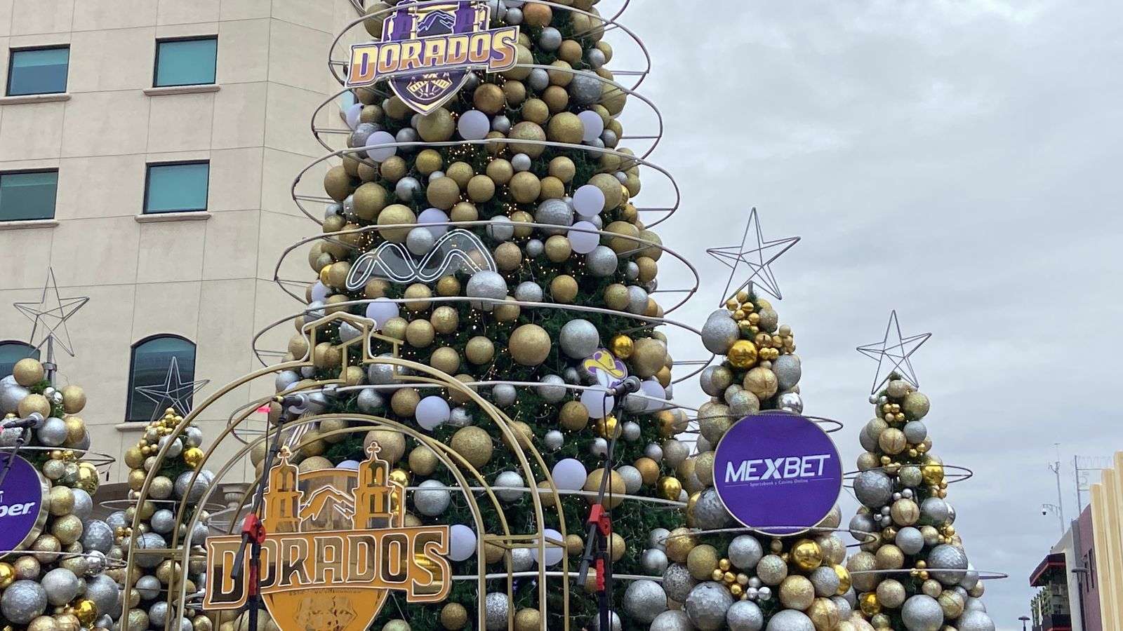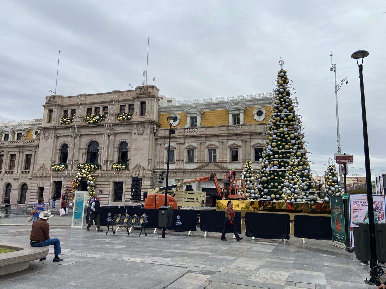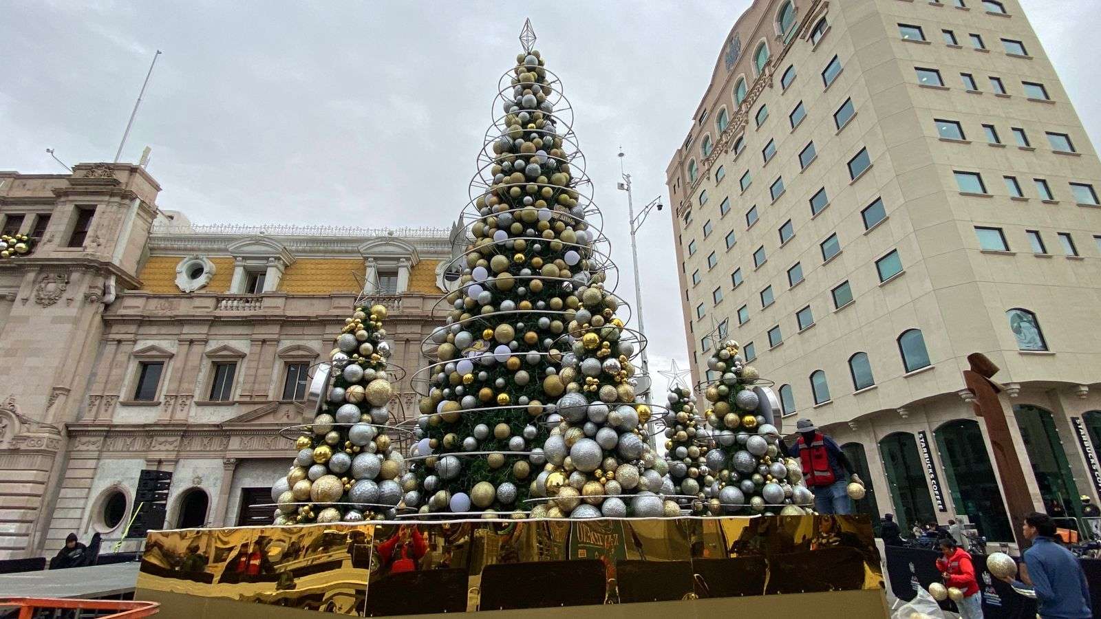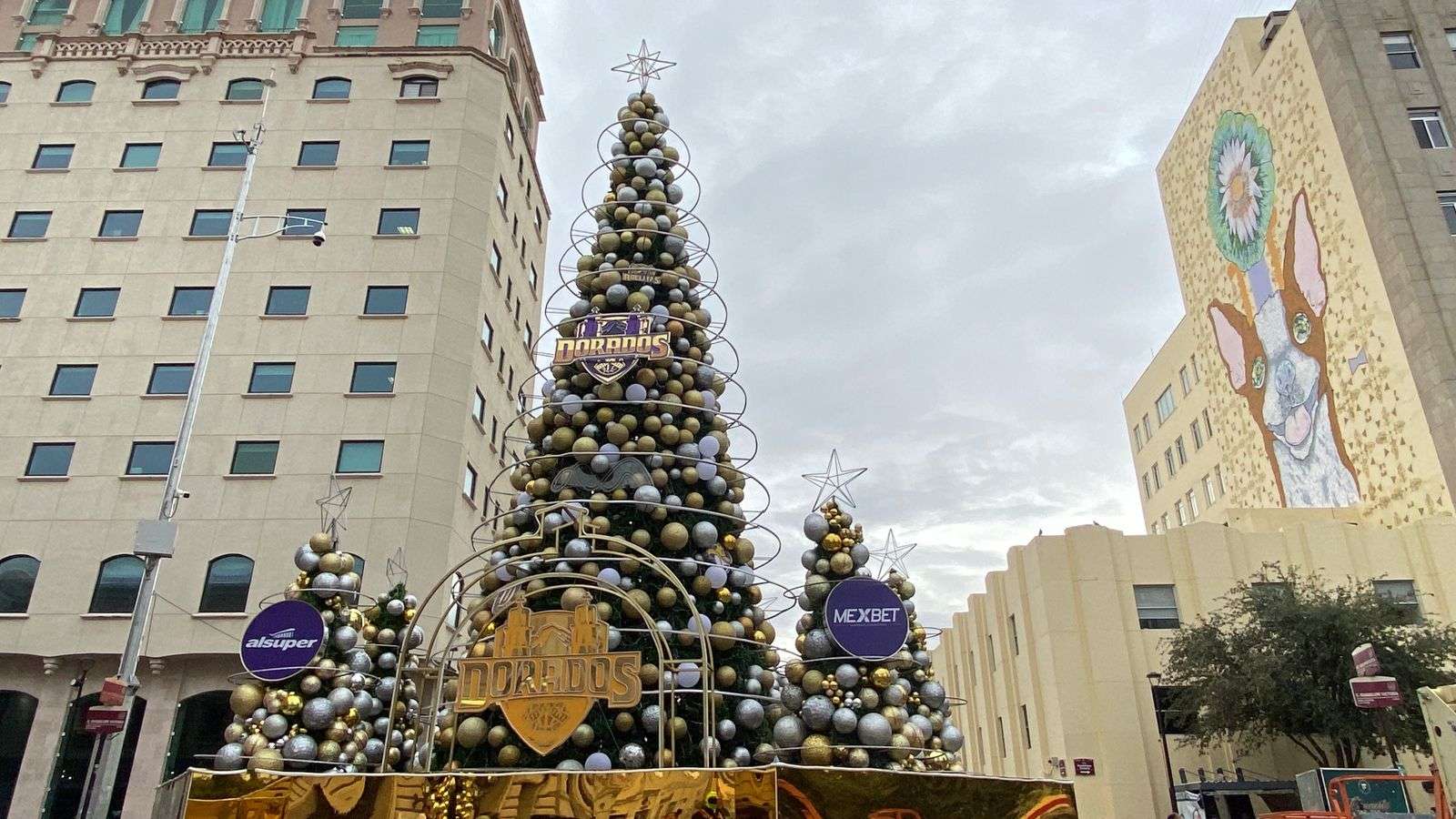 El árbol principal de 10 metros de altura, ya fue totalmente instalado al igual que los cinco arbolitos que estarán custodiándolo en la base y que traen los logotipos de los equipos de Basquetbol Dorados y Adelitas de Chihuahua.
