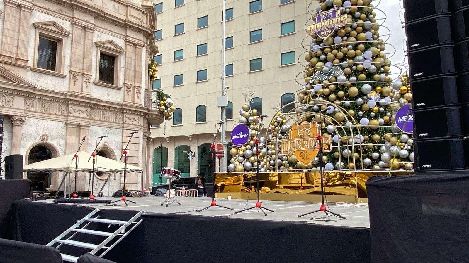 Asimismo, se encuentran realizando pruebas de luces, sonido y las luces con las que se adornó el edificio del Ayuntamiento estarán iluminando al ritmo de la música al igual que el árbol.