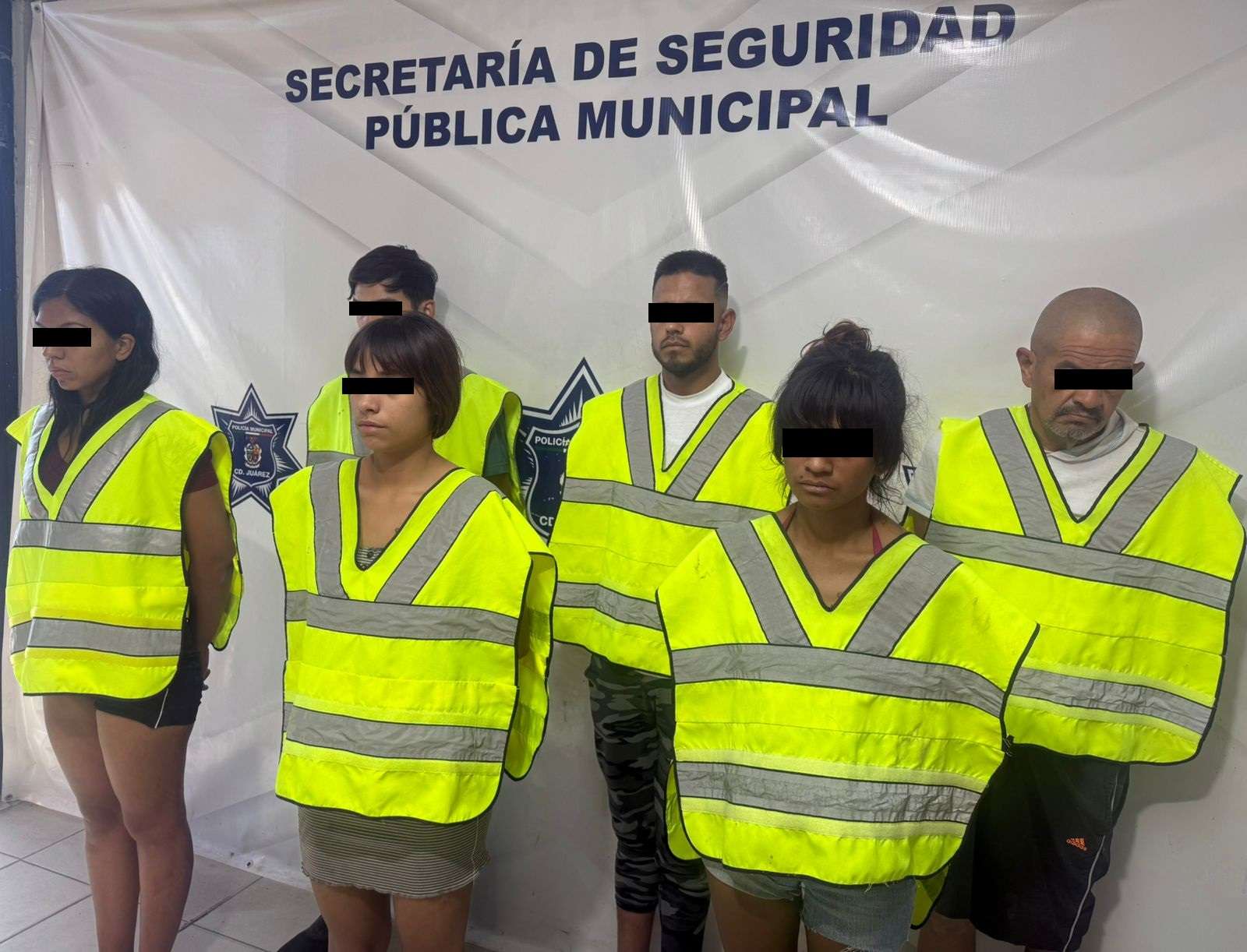 Ciudad Juárez .- Elementos de la Secretaría de Seguridad Pública Municipal arrestaron a Manuel Sergio H. R., Joel Z. V., María Isabel H. S., Febe Joadan B. L, Edgar Iván A. T. y Alexia Alejandra M. C., por su presunta responsabilidad en la comisión de delitos contra la salud y resistencia y desobediencia de particulares; una de las detenidas será investigada por el delito de secuestro.