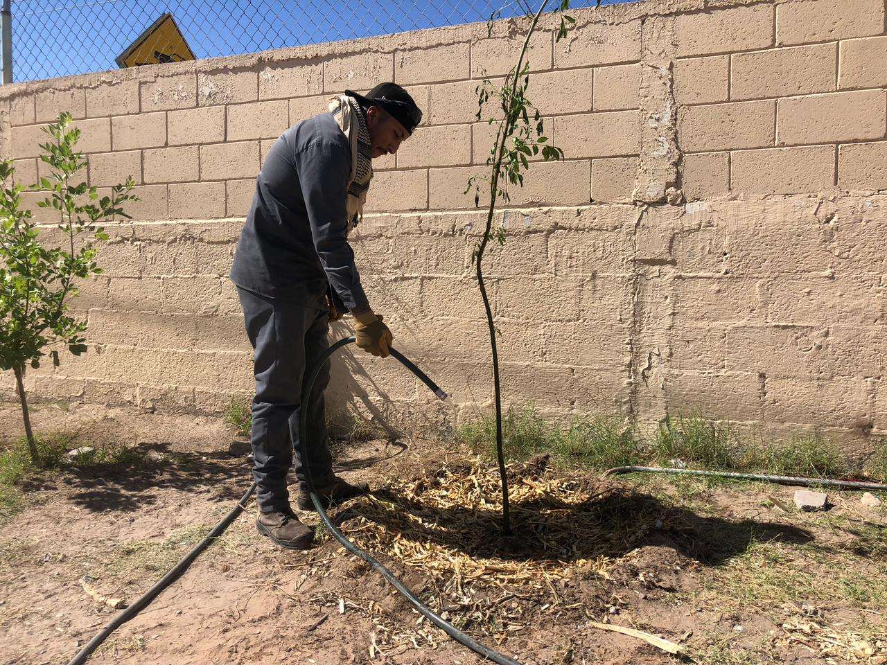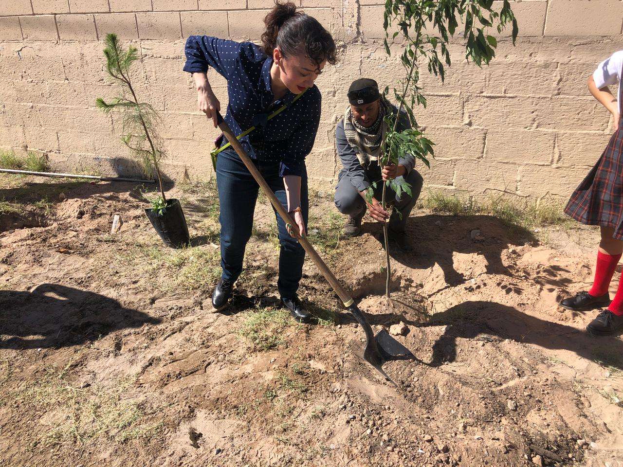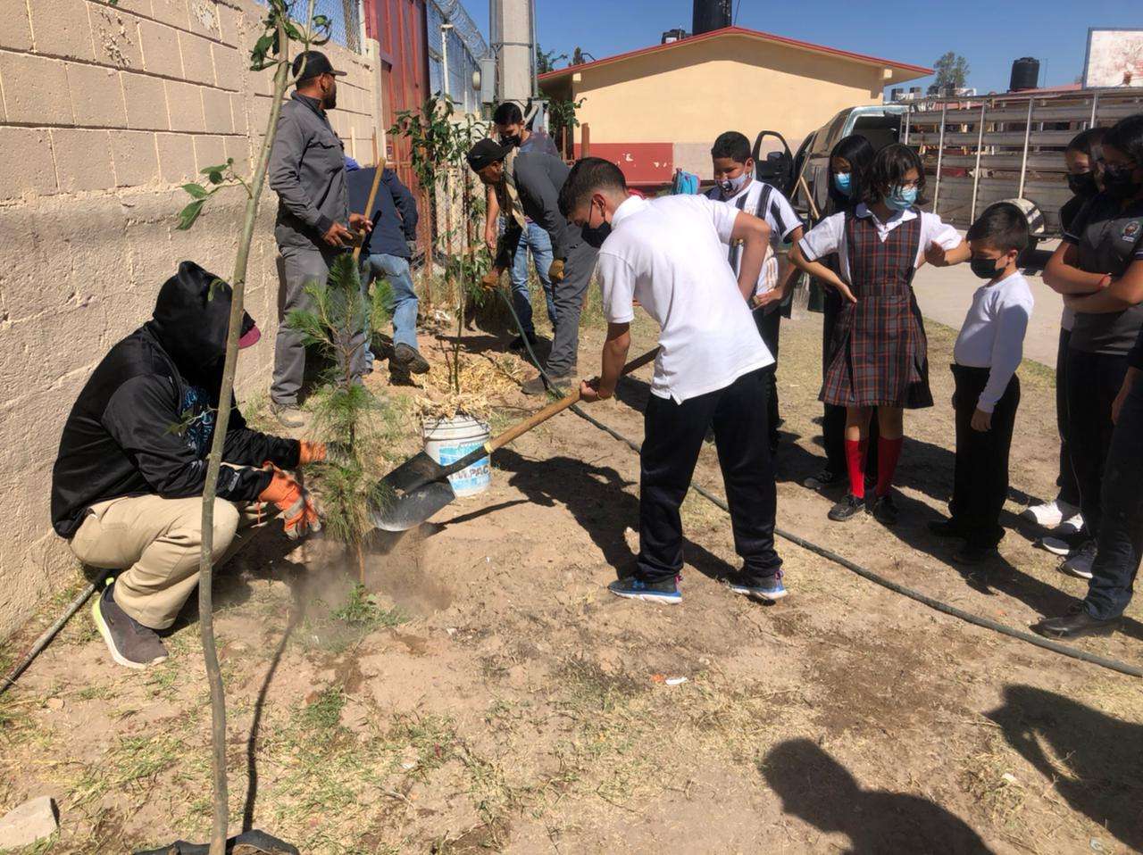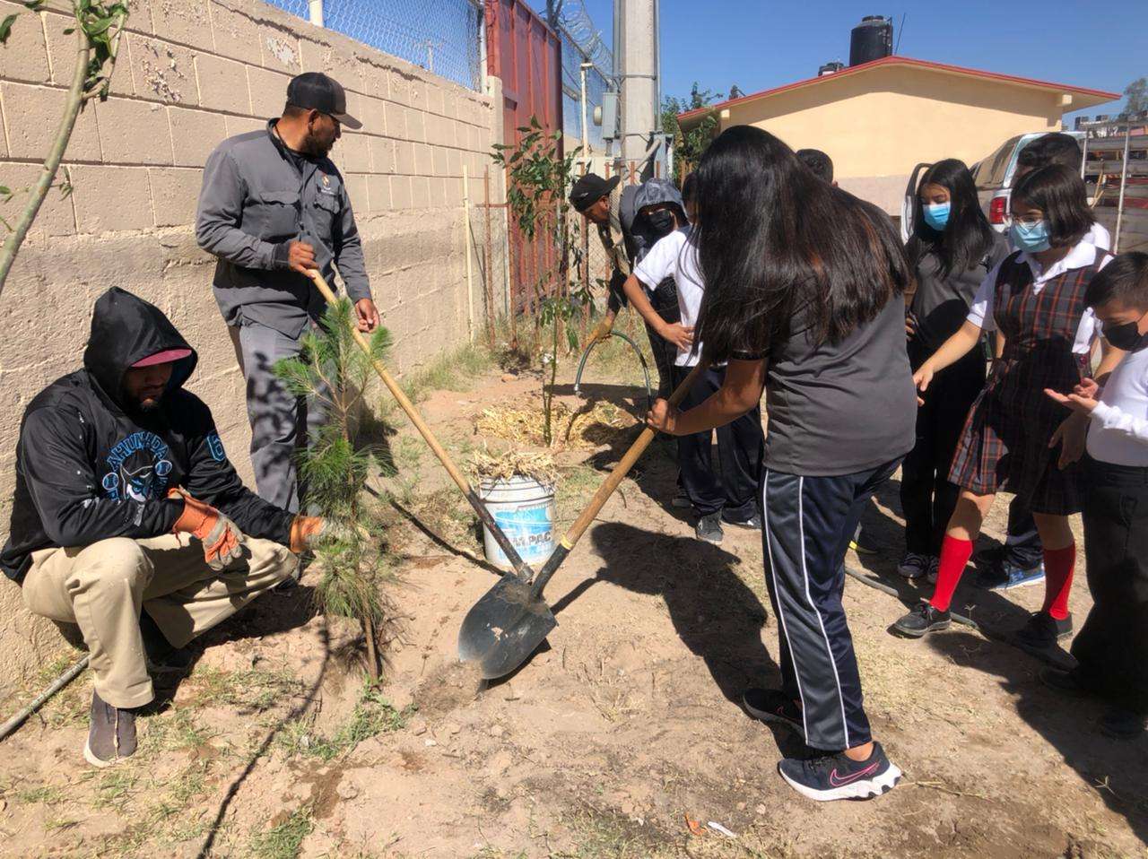 Ciudad Juárez, Chih. - Personal de la Dirección de Parques y Jardines llevó a cabo un programa de forestación en la Escuela Primaria Abraham González, en donde plantaron pinos afganos, mezquites dulces y fresnos.