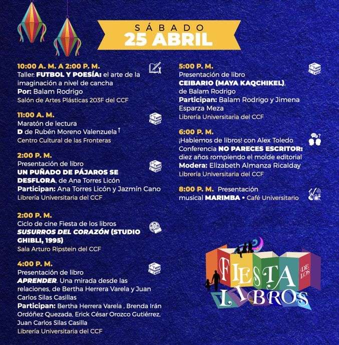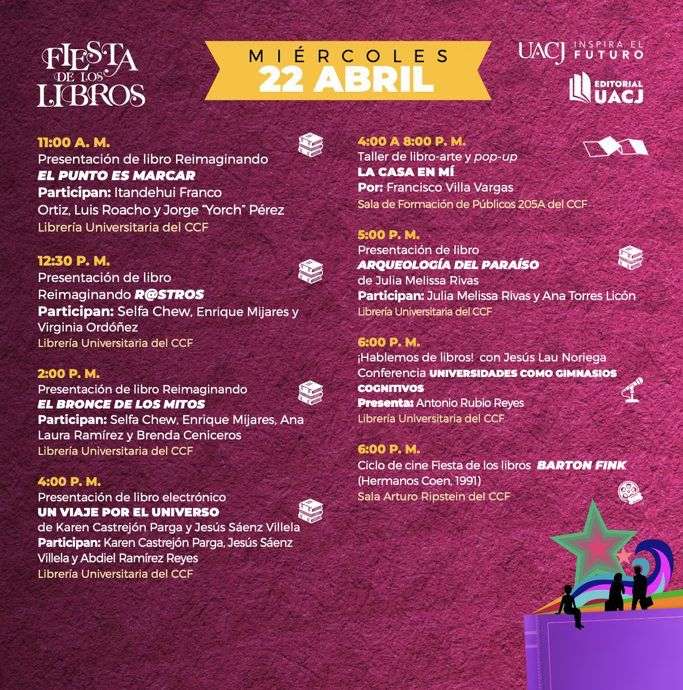 Entre las actividades destacadas se encuentra la presentación de los ganadores del certamen “Voces al Sol”, programada para el jueves 23 de abril a las 17:00 horas en la Librería Universitaria del CCF. Asimismo, se ofrecerá una promoción especial de tres libros por 100 pesos en publicaciones de la UACJ, con títulos de diversas temáticas.
