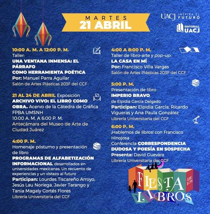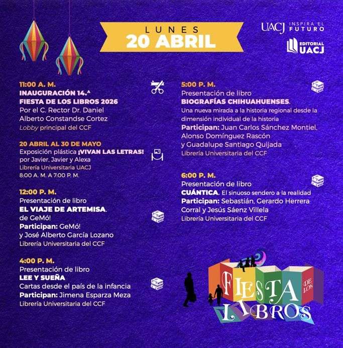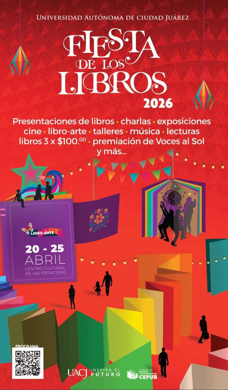 Ciudad Juárez.- La Universidad Autónoma de Ciudad Juárez (UACJ) anunció el regreso de la Fiesta de los Libros 2026, un evento cultural que reunirá literatura, arte y actividades multidisciplinarias del 20 al 25 de abril en el Centro Cultural de las Fronteras (CCF).
