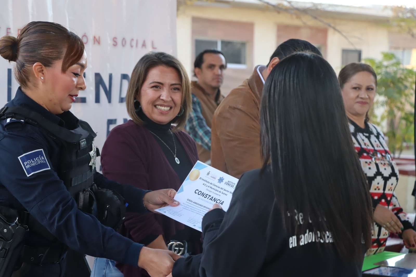Ciudad Juárez.- La Secretaría de Seguridad Pública Municipal, a través de la Dirección de Prevención Social y en coordinación con el Instituto de Ciencias del Sector Social, llevó a cabo la ceremonia de cierre de actividades del proyecto de intervención social “Reescribiendo Historias en Adolescentes”, realizada en la Escuela Secundaria Estatal 3003.