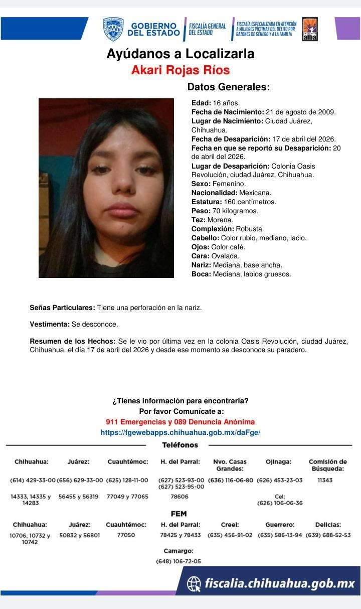 Ciudad Juárez.- Elementos de la Secretaría de Seguridad Pública Municipal adscritos a la Estación de Policía del Distrito Poniente, localizaron a una adolescente de 16 años, misma que contaba con reporte de extravío y/o ausencia en la ciudad.