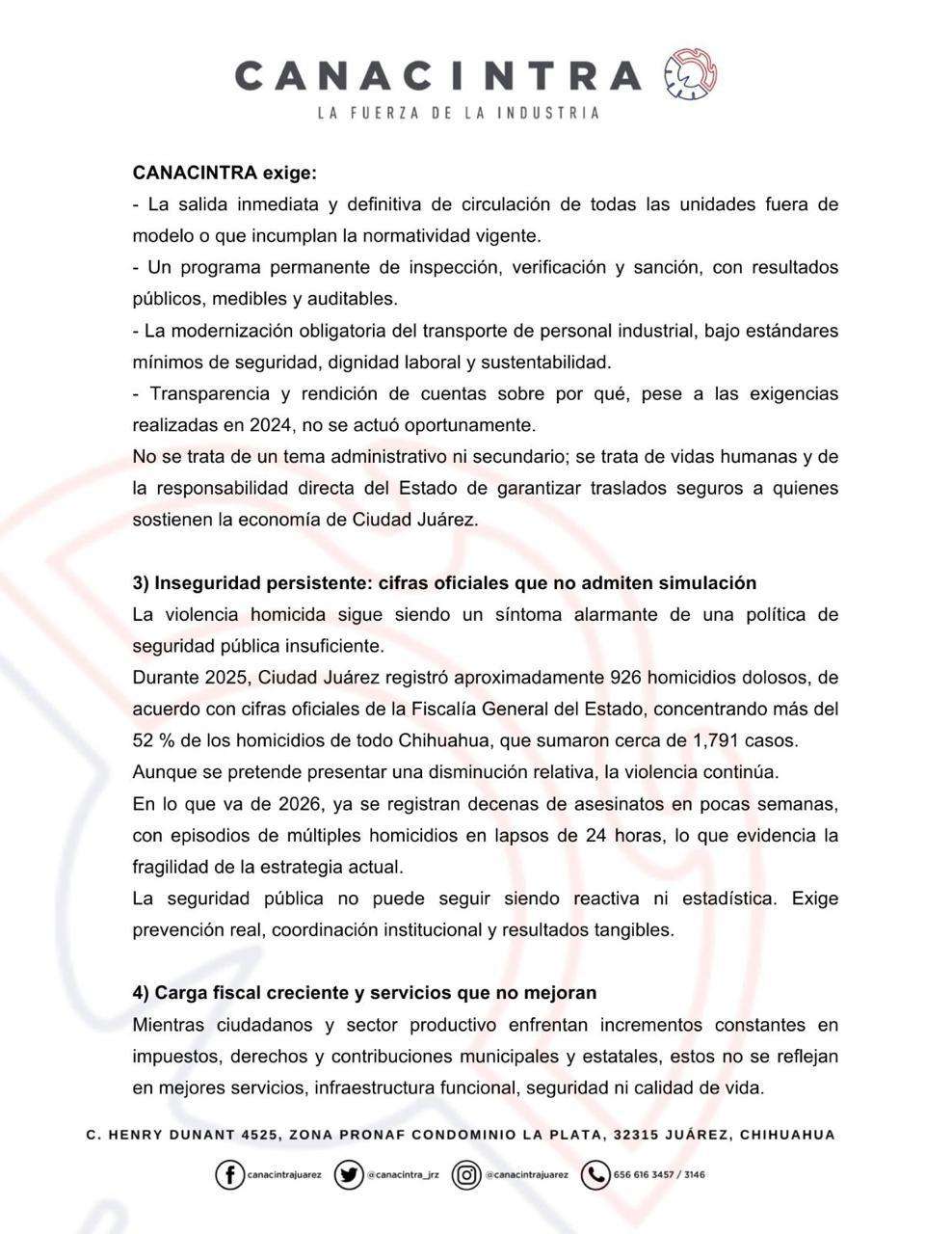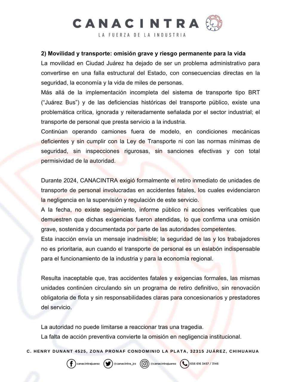“La inacción de la autoridad envía un mensaje inadmisible; la seguridad de los trabajadores no es prioritaria, aun cuando el transporte de personal es indispensable para el funcionamiento de la industria y la economía regional”, subraya el organismo.