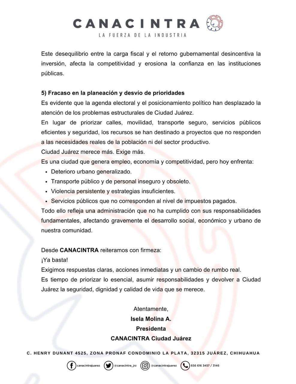 En un documento firmado por su presidenta, Isela Molina, el organismo empresarial advierte que Ciudad Juárez, históricamente uno de los principales motores industriales del país, enfrenta hoy una crisis estructural que amenaza su competitividad, su desarrollo social y la calidad de vida de sus habitantes.