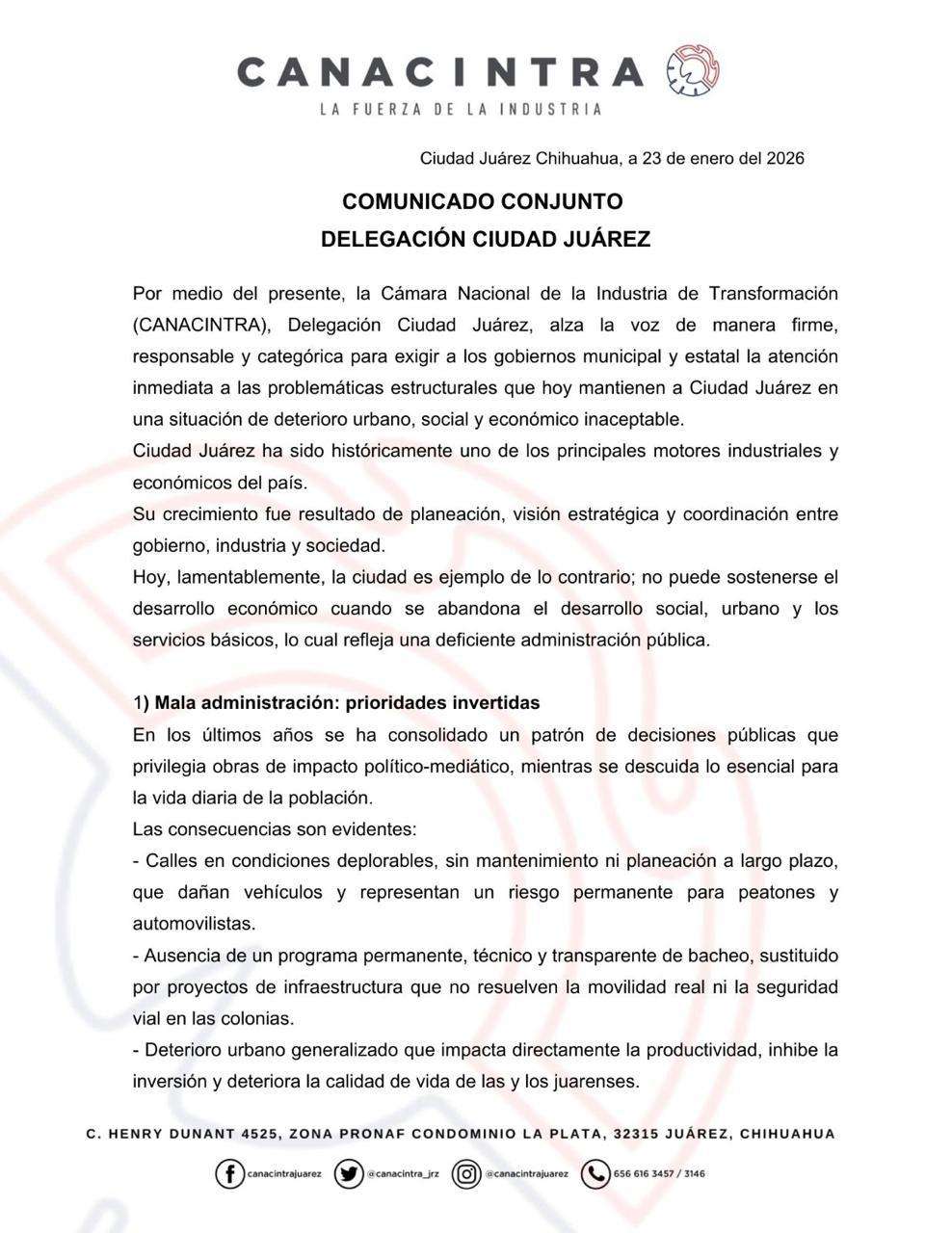 Ciudad Juárez.- La Cámara Nacional de la Industria de Transformación (CANACINTRA), Delegación Ciudad Juárez, lanzó un pronunciamiento público de alto impacto en el que exige a los gobiernos municipal y estatal atender de manera inmediata lo que calificó como un deterioro urbano, social y económico inaceptable en la ciudad, producto, señala de una deficiente administración pública y de prioridades gubernamentales equivocadas.